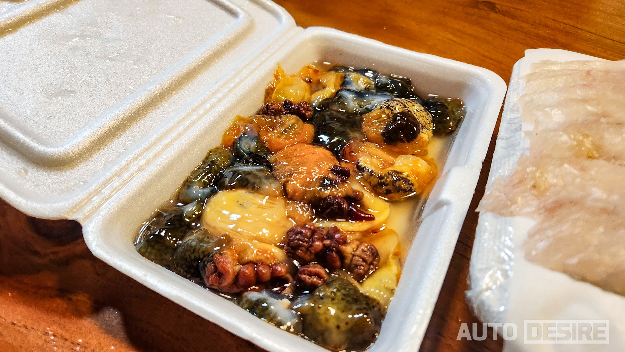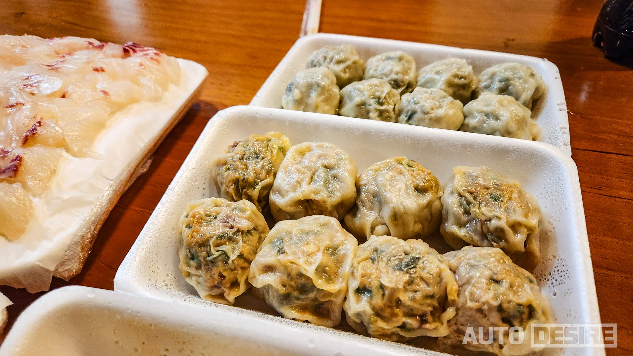 그렇게 차려진 이번 여행의 저녁상! 이렇게 보니 상당히 푸짐해 보이지만 남자 넷이 달려드니 정말 순식간에 다 사라져서 컵라면까지 더해서 먹었다. 막 떠온 광어회와 참돔회는 뭐 말할 것도 없고, 서비스로 받아온 해삼과 멍게도 큼직큼직하게 썰어주셔서 입에 한가득 넣고 오독오독 씹으면서 여수 바다 맛은 이렇구나 풍성하게 느낄 수 있었다. 구봉만두의 고기, 김치, 삼합만두도 얇은 피에 속이 꽉 차게 들어있었고 삼합만두는 갓김치의 살짝 매콤한 맛에 낙지, 새우의 탱글한 느낌까지 식감이 만족스러웠다.
