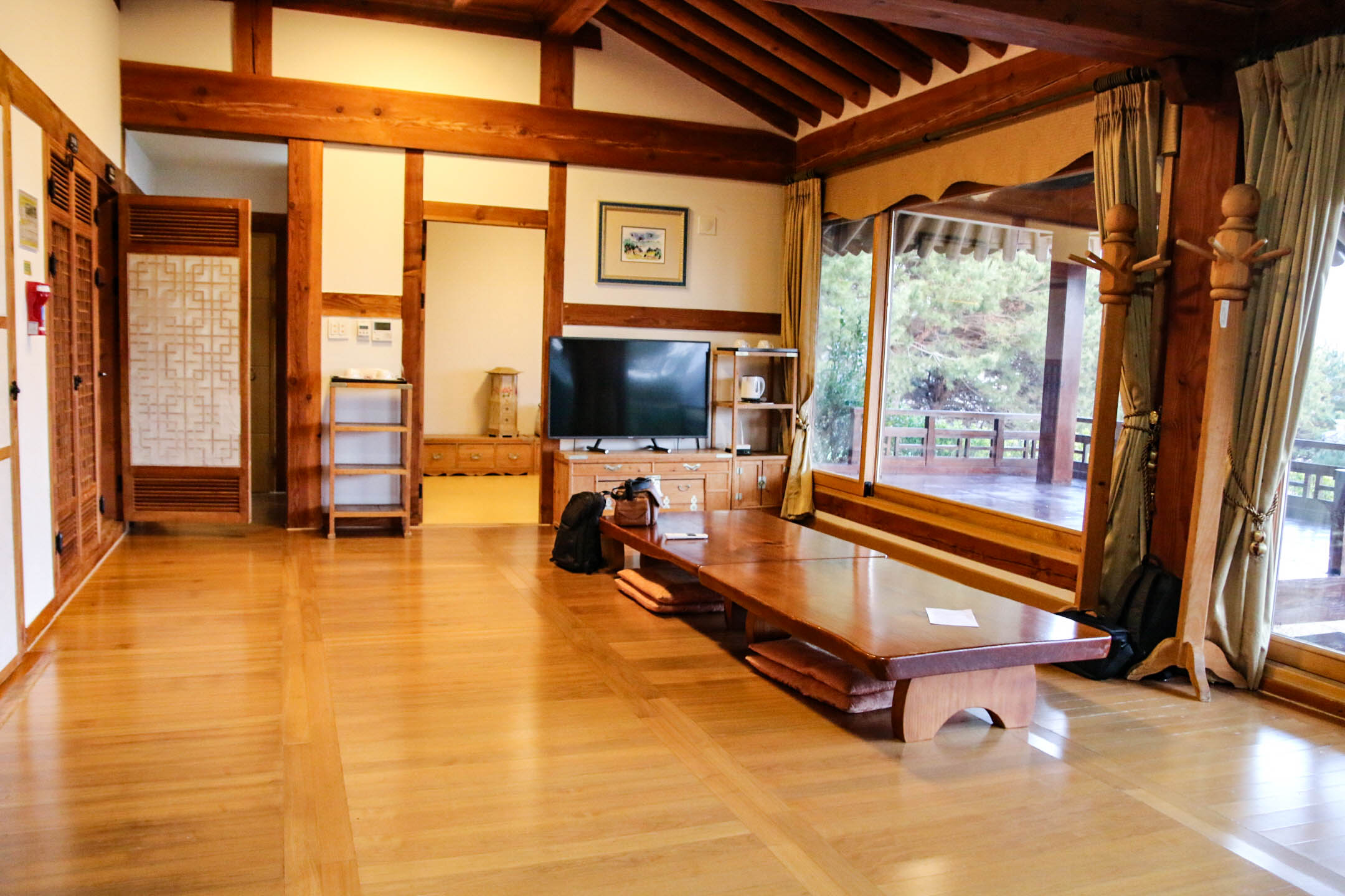 4명이서 넉넉하게 푹 쉬다가 가자고 한 만큼 오동재의 객실 중에서 선택한 곳은 가장 넓은 공간에 딱 우리끼리 편하게 놀다 가기 좋은 '오동재 스위트 독채'로 골랐다. 안으로 들어서면 넓은 마루와 함께 외부로 대청마루가 또 이어져 있어서 봄~가을쯤 오면 야외에서 한옥 분위기 만끽하기에도 좋을 것 같고, 기본 객실 외에도 거실이 상당히 넓어서 가족 단위로 오기에 참 좋을 것 같다.