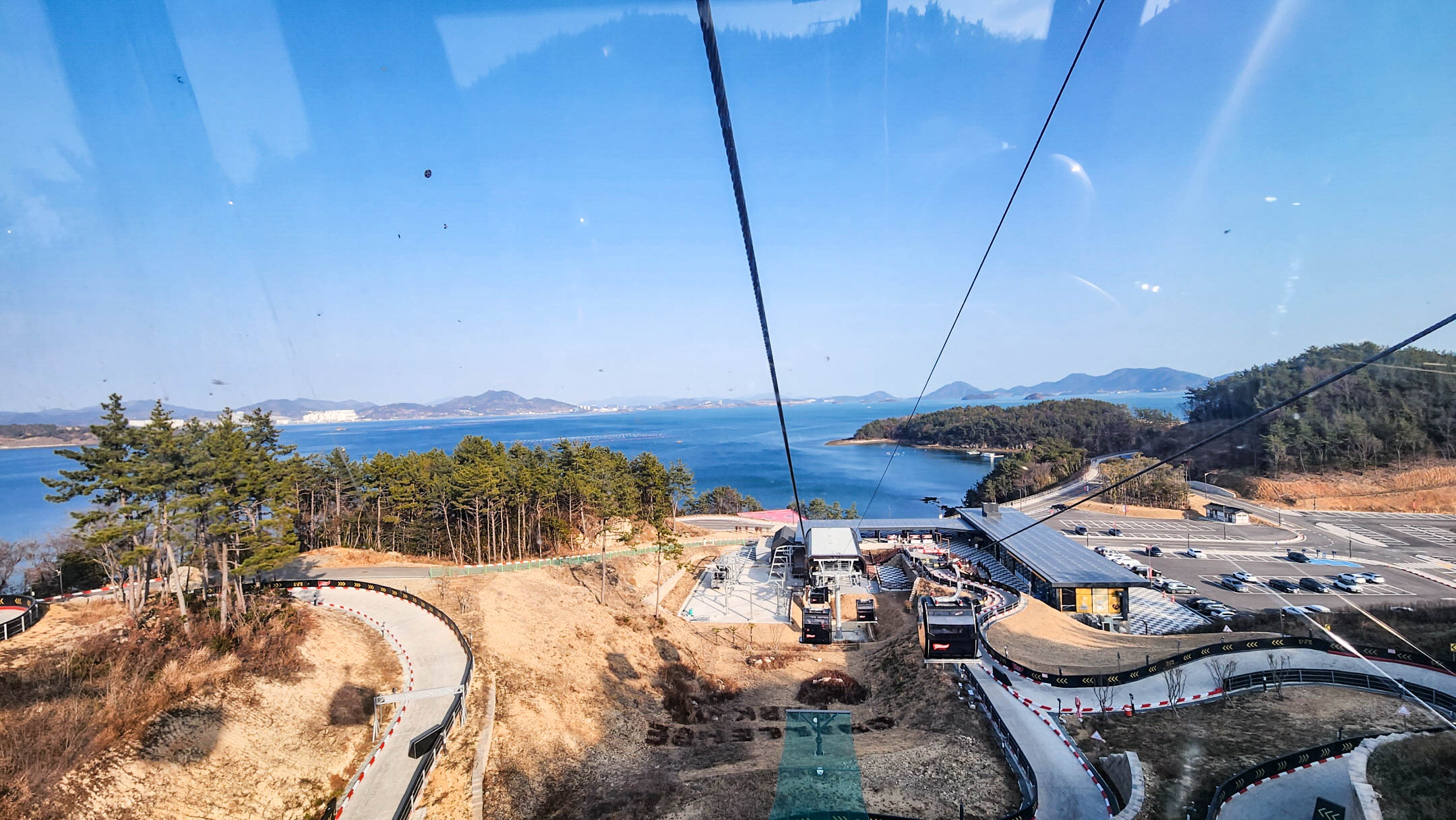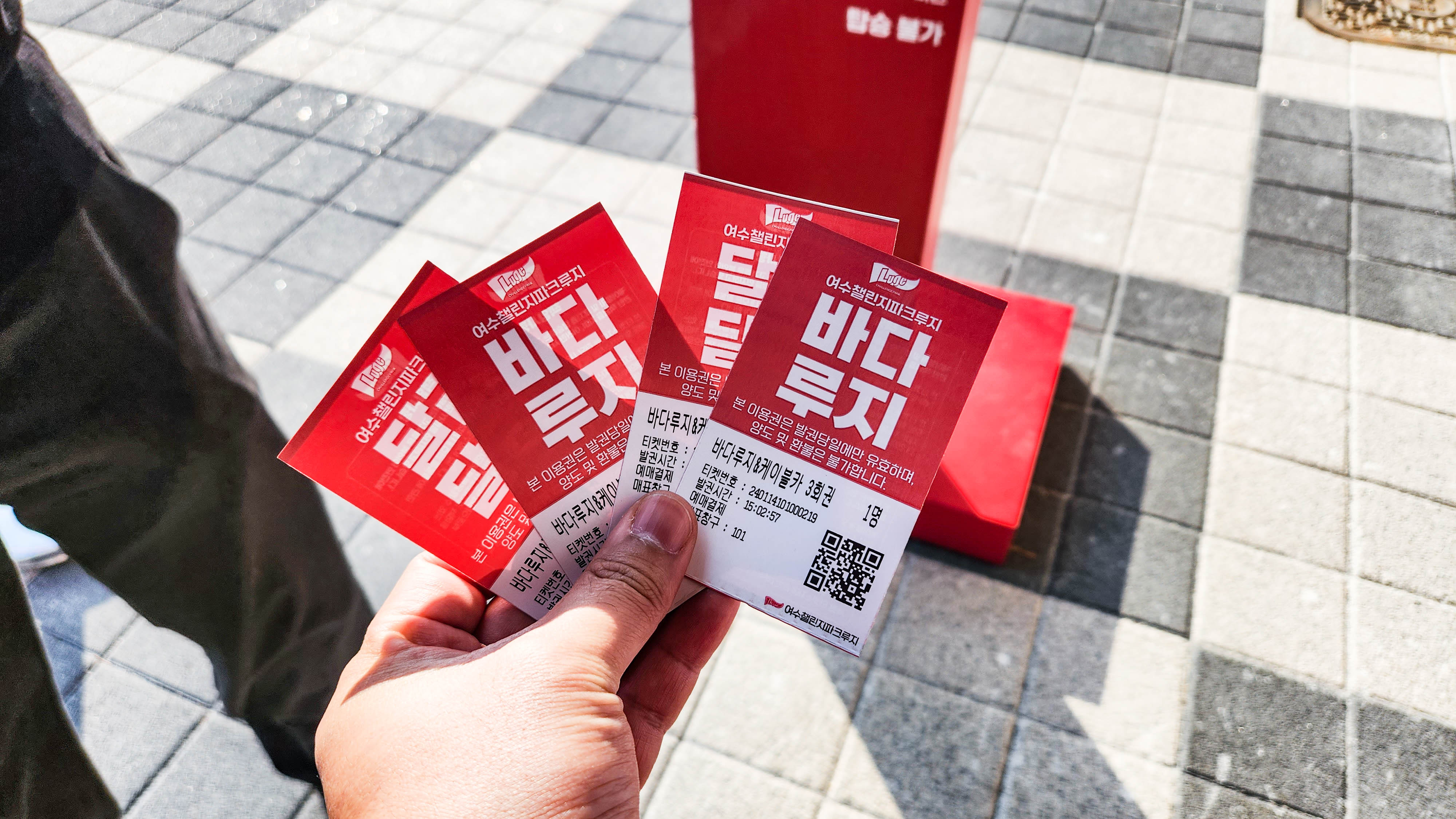 미리 네이버 예약으로 구매한 탑승권을 실물 티켓으로 교환하고 안전을 위해 각자 머리 사이즈에 맞는 헬멧을 착용한 뒤 케이블카 탑승! 루지 출발점이 있는 산 위까지 오르는 동안 파노라마로 넓게 펼쳐진 여수의 섬들과 바다, 그리고 곧 달리게 될 루지 코스까지 케이블카 안에서 충분하게 즐길 수 있다.