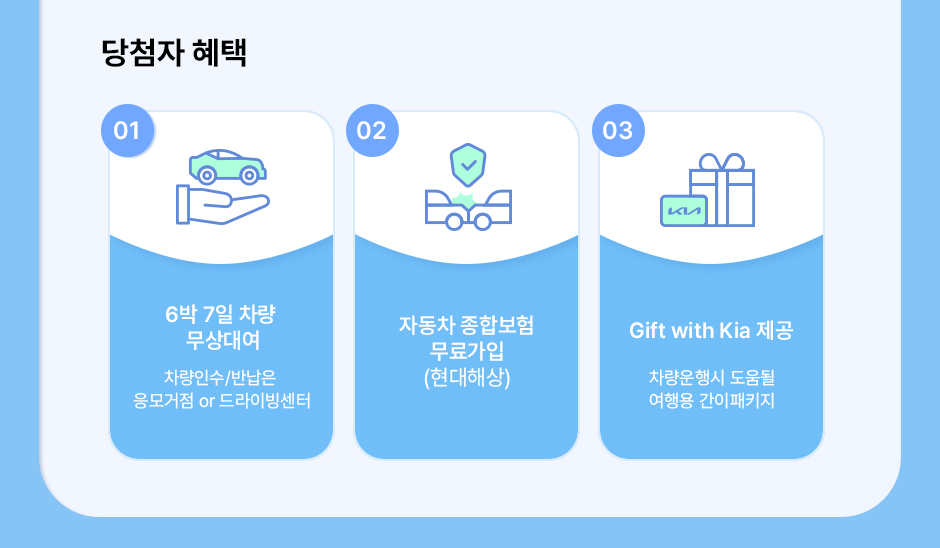 시승 이벤트에 당첨된 고객에게는 6박 7일간 신청한 차량을 무상으로 대여, 이용할 수 있고 귀성/귀경길 차량 운행에 도움이 되도록 여행용 간이 패키지로 구성된 'Gift With Kia'가 제공될 예정이다. 자동차 종합보험 역시 무상으로 가입되지만, 사고 발생 시 자차 부담금이 최소 5만~50만 원이 발생할 수 있고, 이 중 최대 10만 원까지 본인이 부담할 수 있다. 차량은 당첨자 본인 외 양도가 불가능하며 이용 중 추가로 발생하는 유류 비용이나 충전비, 고속도로 통행료는 본인 부담이다.