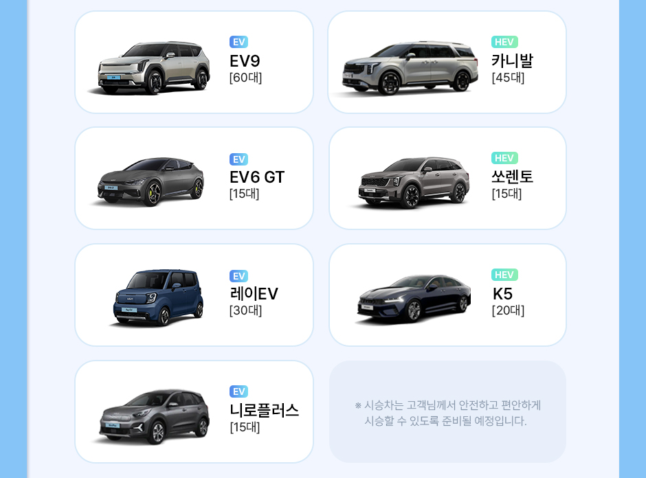 차종별로 먼저 전기차의 경우 대형 전기 SUV 'EV9' 60대, 고성능 전기차 'EV6 GT' 15대, 경형 전기차 '레이 EV' 30대, 공간 활용성을 극대화한 PBV 전기차 '니로 플러스' 15대이며, 하이브리드 차량은 대한민국 대표 패밀리 미니밴 '카니발 하이브리드' 45대, 베스트셀링 중형 SUV '쏘렌토 하이브리드' 15대, 다이내믹 중형 세단 'K5 하이브리드' 20대이다.