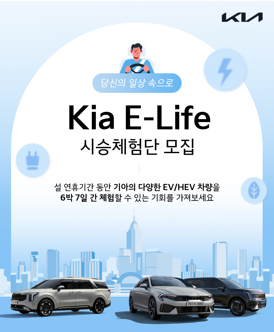 기아에서 2024년 설 명절을 앞두고, 설 연휴 기간 동안 기아의 다양한 전기차, 하이브리드 차량을 6박 7일 동안 시승하고 체험해 볼 수 있는 시승 이벤트, 'Kia E-Life 시승체험단'을 모집한다.