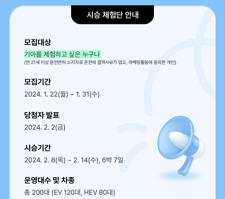 기아의 전기차, 하이브리드 신차를 경험해 보고 싶은 이들이라면 만 21세 이상 운전면허소지자, 운전에 결격 사유가 없고 마케팅 활용에 동의하는 개인 고객이라면 누구나 이벤트에 참여가 가능하며 모집 기간은 1월 31일 수요일까지, 당첨자는 2월 2일에 개별 유선 연락 예정이다. 시승 기간은 명절 연휴 전날인 2월 8일부터 명절 연휴가 끝난 다음 날인 2월 14일까지 총 6박 7일이며, 시승 차량 운영 대수는 EV120대, 하이브리드 80대로 총 200대에 달한다.