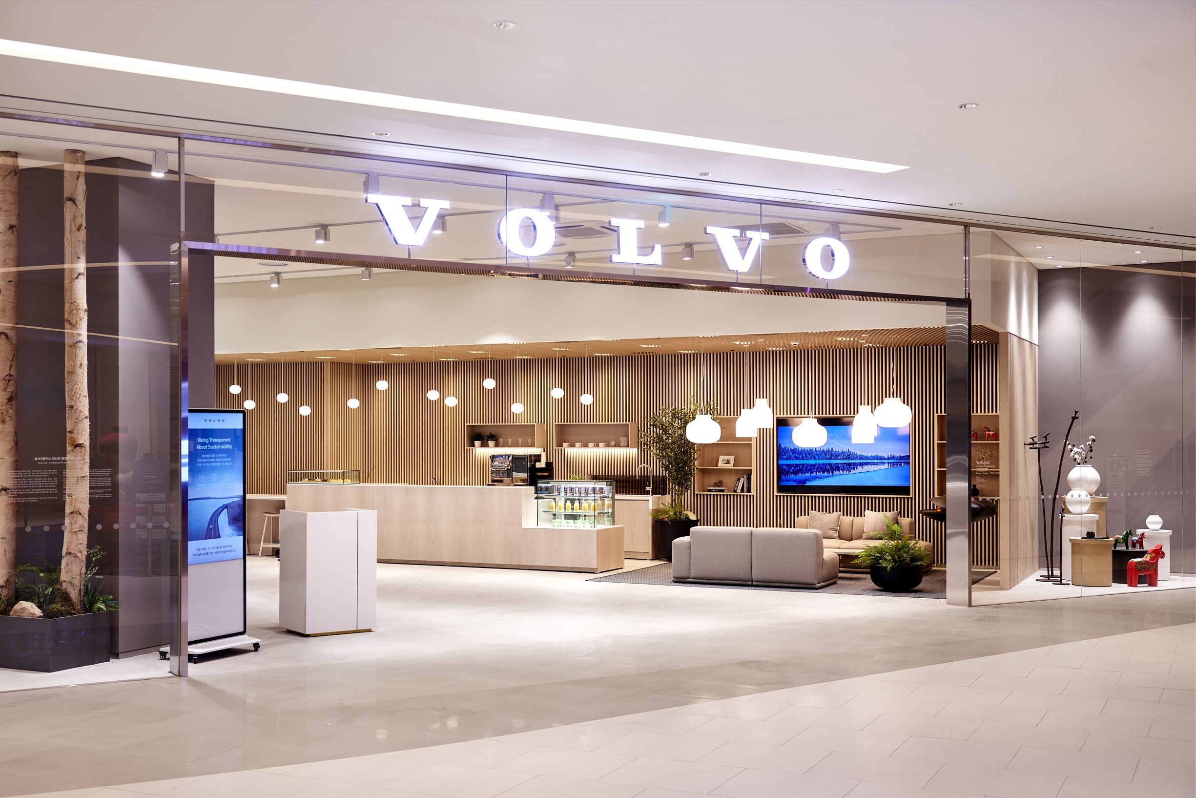 볼보 서수원 전시장의 고객 라운지 및 상담 공간은 스웨덴에서 직수입한 북유럽 조명과 애쉬우드 마감으로 북유럽 특유의 따뜻한 분위기를 만들고, 차량 전시 공간은 콘플로어 바닥을 적용해 고객들이 차량에 온전히 집중할 수 있도록 했다. 이 외에도 전시장에는 화학물질을 최소화한 페인트와 자재를 사용하고 지속 가능한 소재로 만든 가구를 곳곳에 배치, 모든 영업 과정에서 종이가 아닌 디지털 기기를 사용함으로써 볼보자동차가 추구하는 친환경 및 지속가능성의 가치를 적극 반영했다.