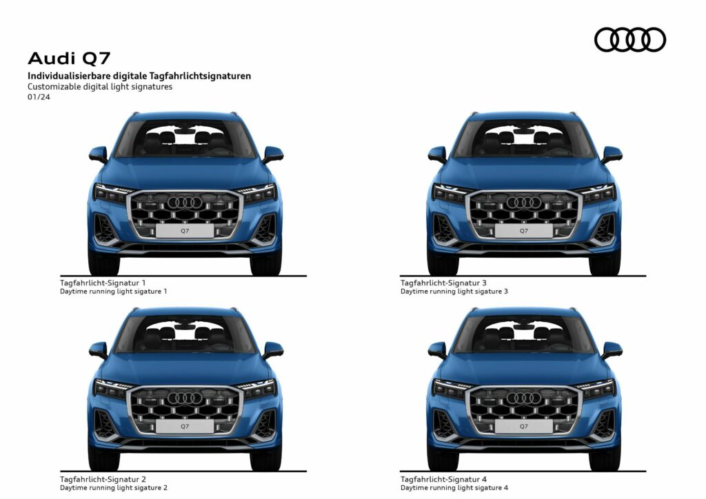 2024 아우디 Q7은 차체의 큰 형태, 라인 등은 기존 Q7에서 크게 달라지지는 않았지만 다크 틴팅을 더해 더 깊고 진해진 인상을 전하는 신규 LED 라이트와 더 큼직한 사이즈로 볼드하고 강인한 느낌을 주는 메시 타입 라디에이터 그릴 패턴, 다른 아우디 모델들과 패밀리룩을 이루면서 특히 Q8과 흡사한 스포티한 감각의 범퍼 디자인이 적용되었다. 특히 모든 트림에 매트릭스 LED 헤드램프가 기본으로 적용되어 플래그십 SUV 모델다운 사양을 유지했다.