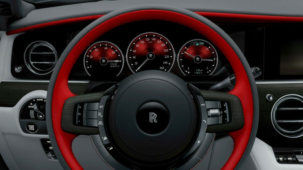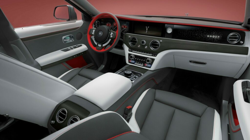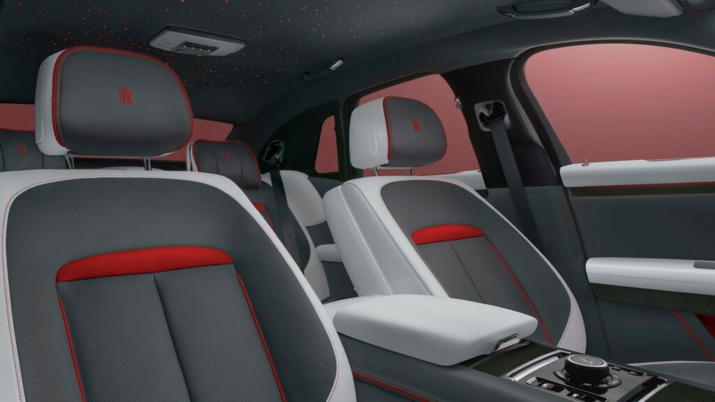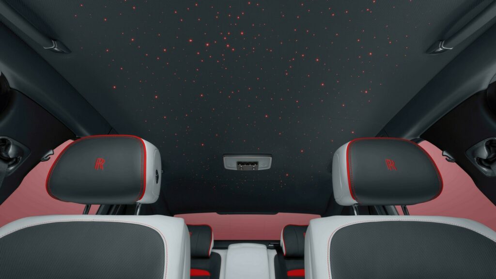 롤스로이스에서는 실내 공간에 대해서는 자세히 언급을 하지는 않았지만, 외장과 마찬가지로 블랙/화이트 컬러 가죽 마감에 다크 우드 트림을 바탕으로 스티어링 휠 림 안쪽과 크래시 패드 상단, 도어 트림 및 센터 콘솔 트림 스티치, 시트 라인 등에 레드 액센트가 적용되었고 이는 외장 액센트 컬러 선택에 따라 실내도 선택 가능한 것으로 보인다.