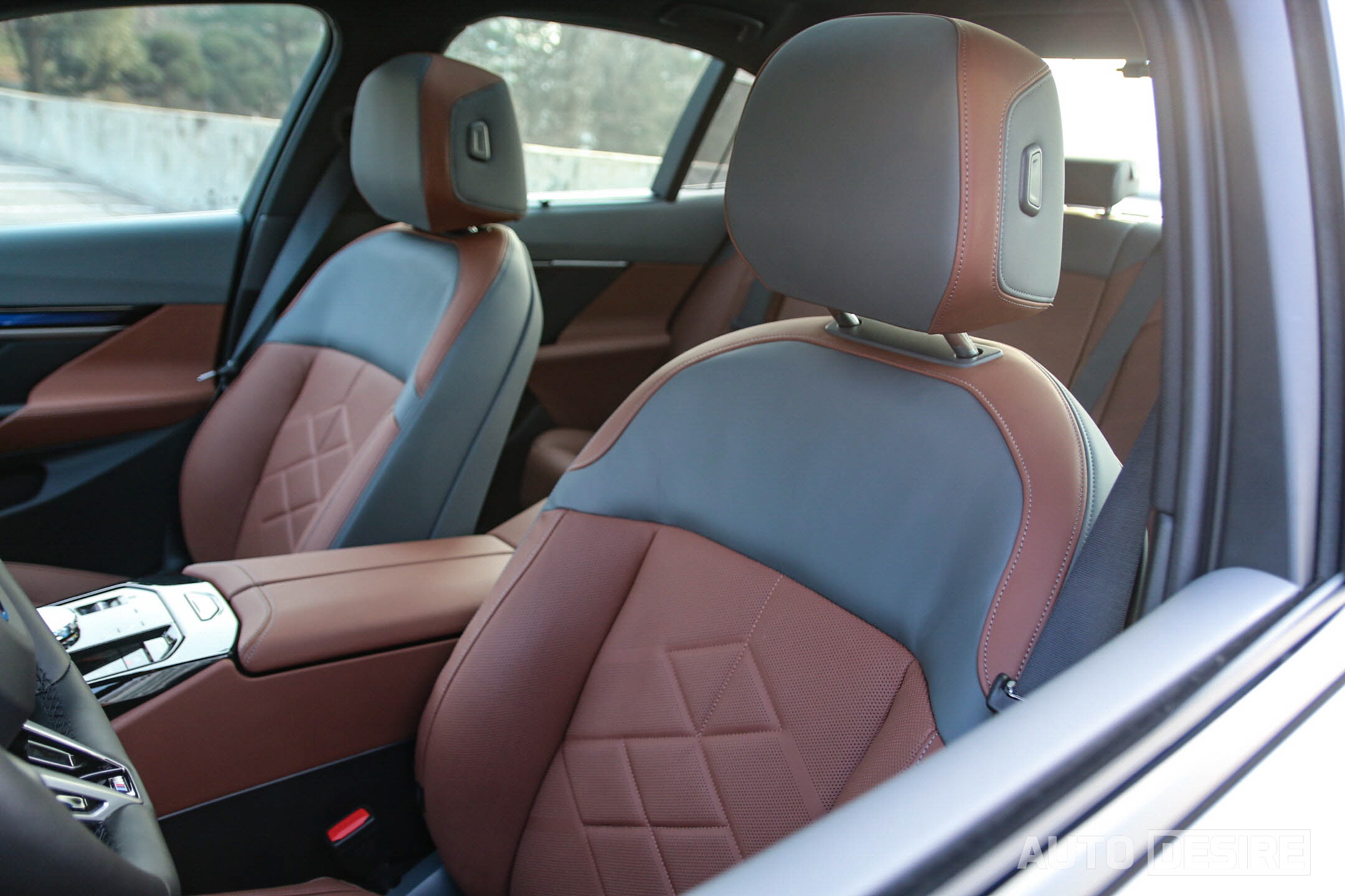 1열 시트는 열선, 통풍 시트 및 메모리 기능이 포함된 메리노 가죽 시트로 적용되고, 시승차에는 코퍼 브라운/아틀라그 그레이 투톤 컬러가 적용, 블랙 원톤 인테리어도 선택 가능하다.