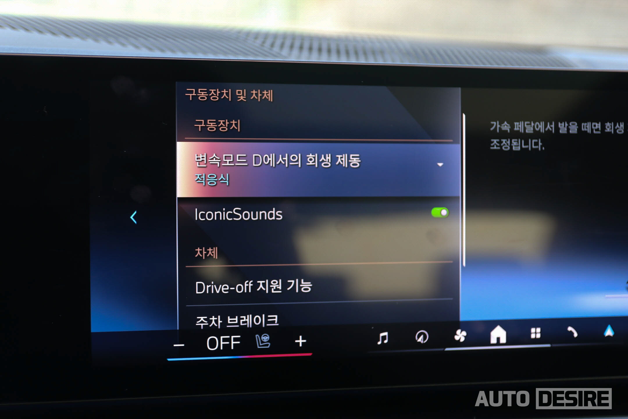 회생 제동 시스템은 인포 시스템을 통해 낮음, 보통, 높음 단계로 원하는 만큼 조정도 가능하지만 '적응식'을 선택하면 차량 주행 속도, 주행 환경, 앞차와의 거리 등을 인식해 차가 능동적으로 회생 제동의 강하기를 스스로 조절해 줘 전기차에 익숙한 이들이라면 편리하게 사용할 수 있다. 혹시라도 이질감이 느껴진다면 낮음 단계로 사용하는 것을 추천하며, 시내 주행 위주나 회생 제동을 가장 적극적으로 사용하길 원하다면 'D' 상태에서 변속 셀렉터를 한 번 더 당겨 'B' 모드로 변경하면 된다.