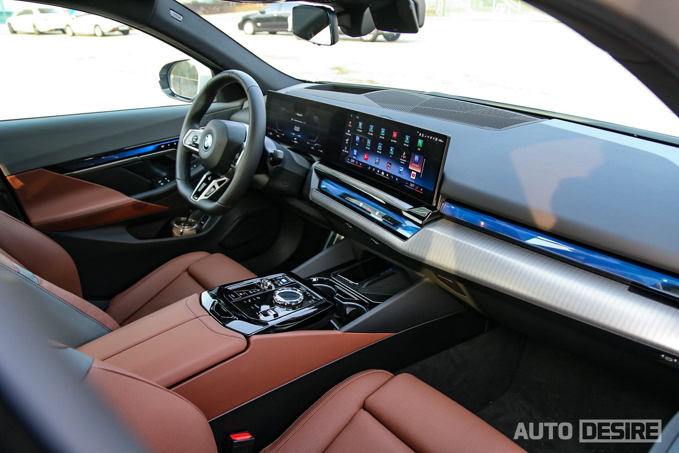 실내 역시 환골탈태한 신형 5시리즈의 인테리어가 i5에도 공통적으로 적용된다. 12.3인치 디지털 클러스터와 14.9인치 인포테인먼트 디스플레이가 시원하게 쭉 이어진 BMW 커브드 디스플레이와 함께, 좌우 도어트림과 크래시 패드 전체를 길게 가로지르는 화려한 인터랙션 바가 더해진 수평형 크래시 패드에, 크리스탈로 마감한 토글 타입 기어 셀렉터와 iDrive 컨트롤 다이얼이 위치한 센터 콘솔로 세부 디테일을 화려하게, 전체적인 모습은 깔끔하고 모던한 스타일로 구성했다.