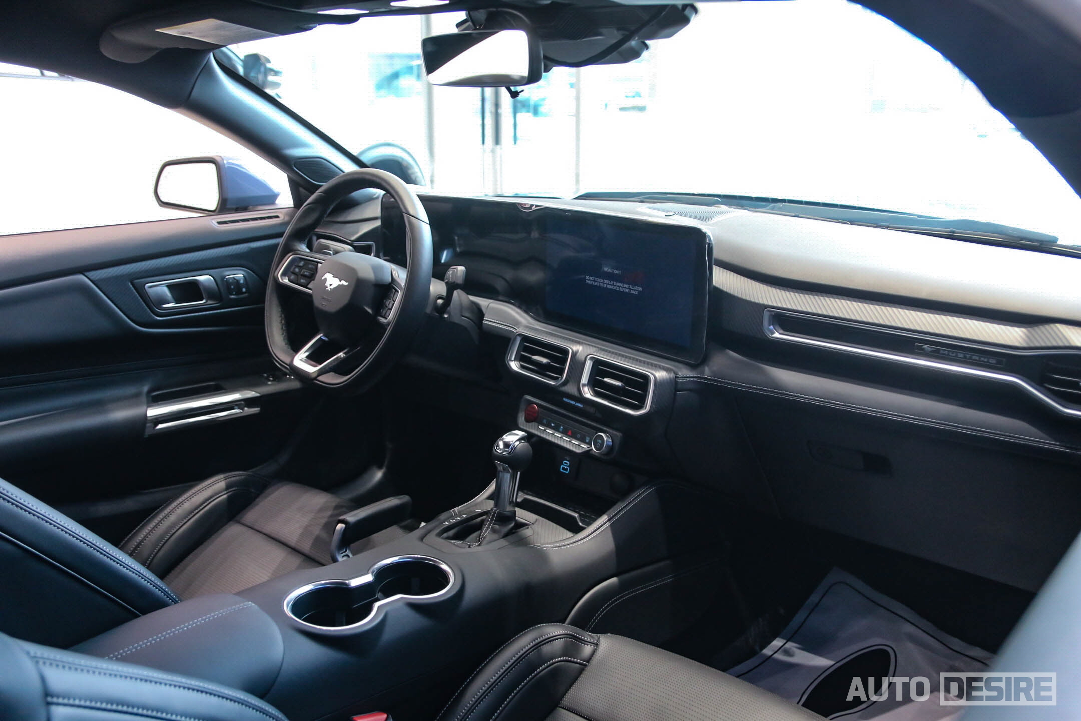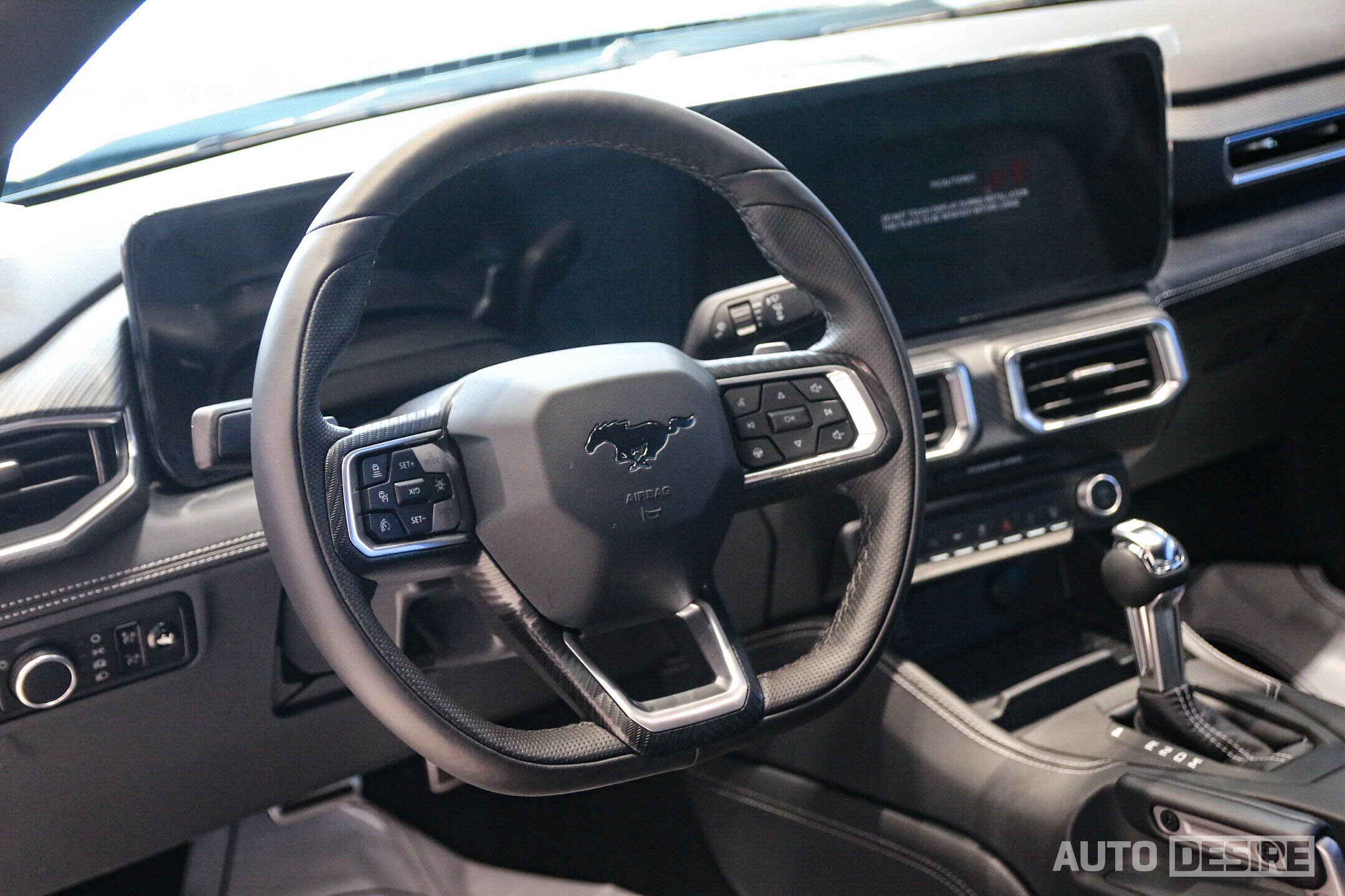 실내에서는 최신 자동차 인테리어 디자인 트렌드를 따르는 모습으로, 분리되어 있던 계기판과 센터 스크린이 12.4인치 클러스터와 13.2인치 센터 스크린이 길게 하나로 이어진 곡면형 디지털 디스플레이로 변경되었고, 이에 맞춰 대시보드의 레이아웃도 수평형으로 변경되었다. 조수석 크래시패드에는 카본 트림과 머스탱 레터링을 넣었고, 스티어링 휠은 D컷 타공 가죽으로 적용해 스포티한 감각을 더 높인다.