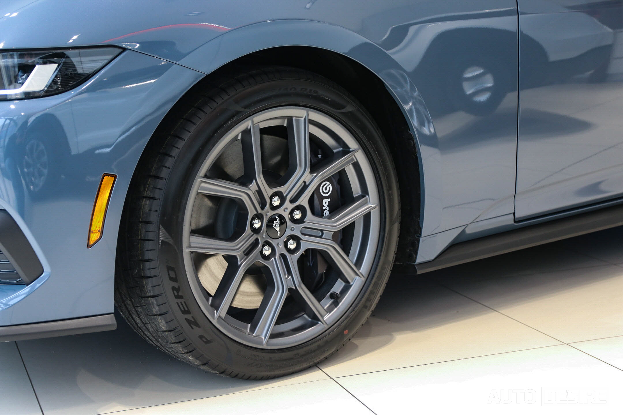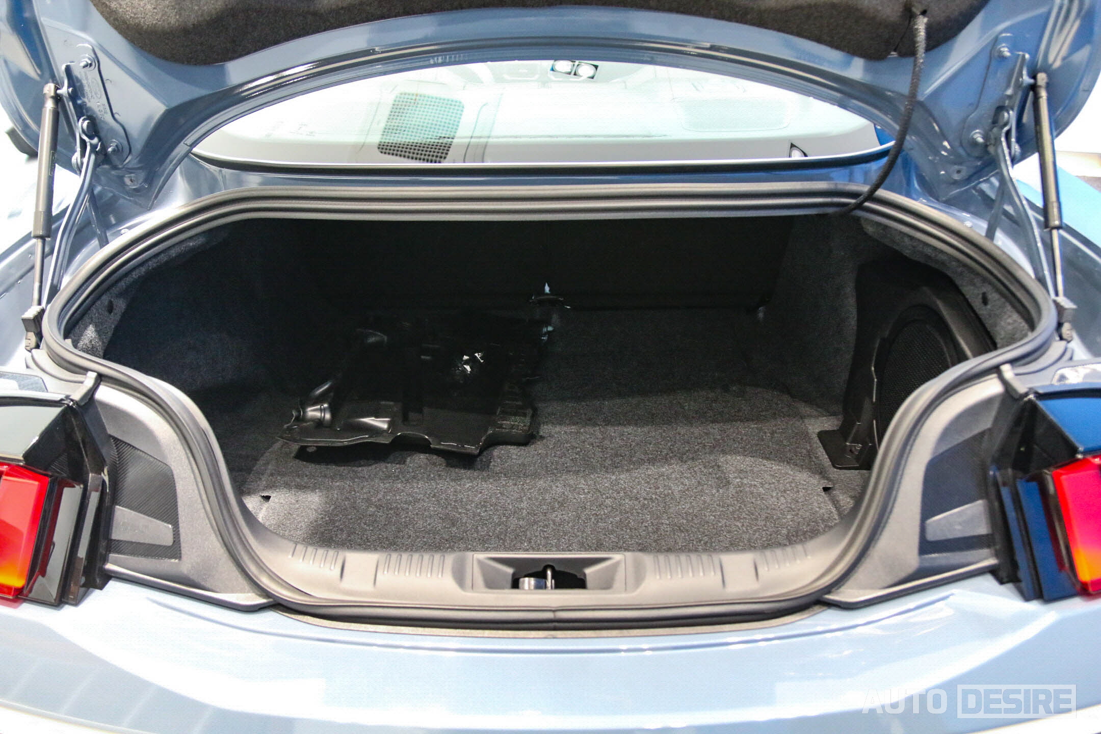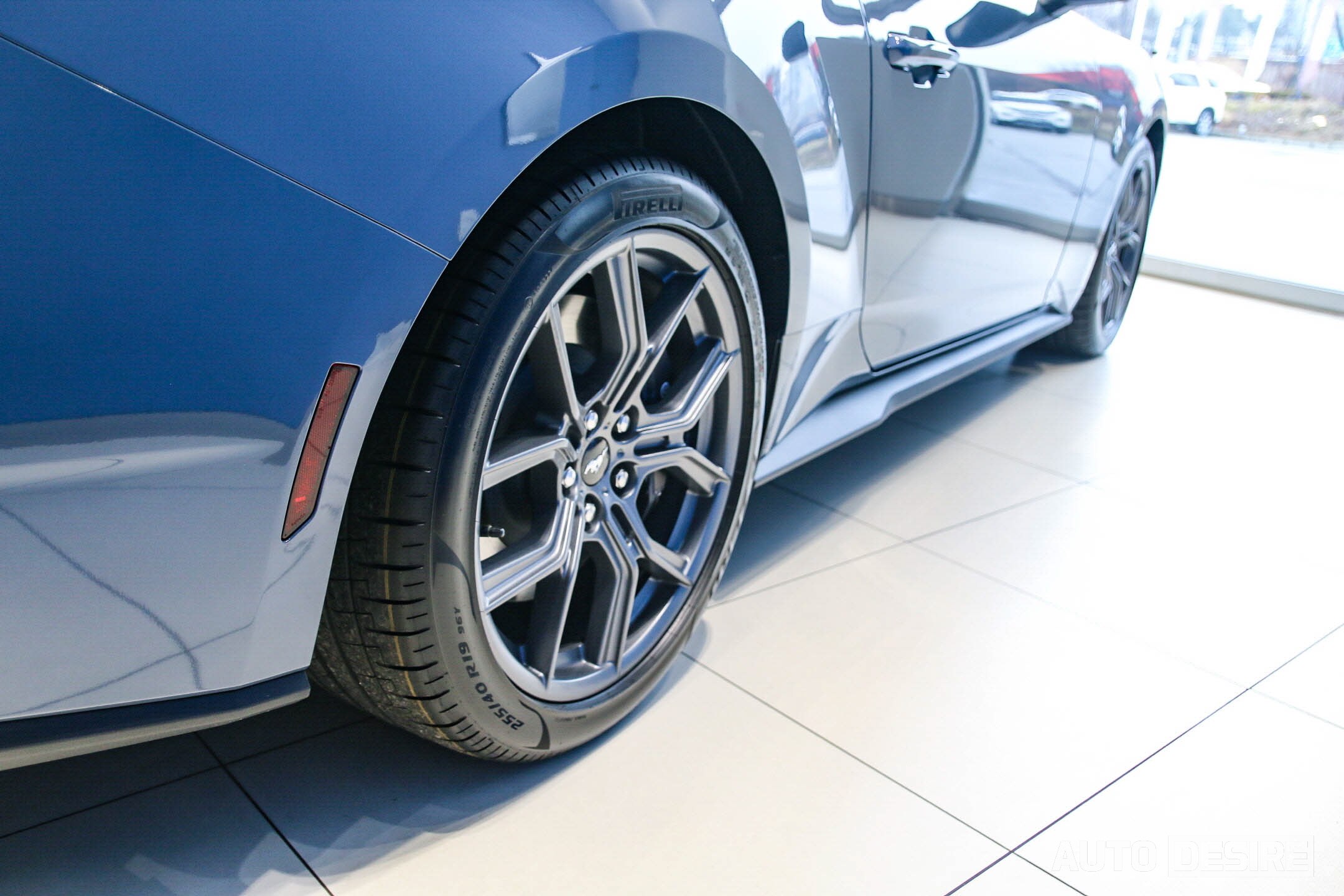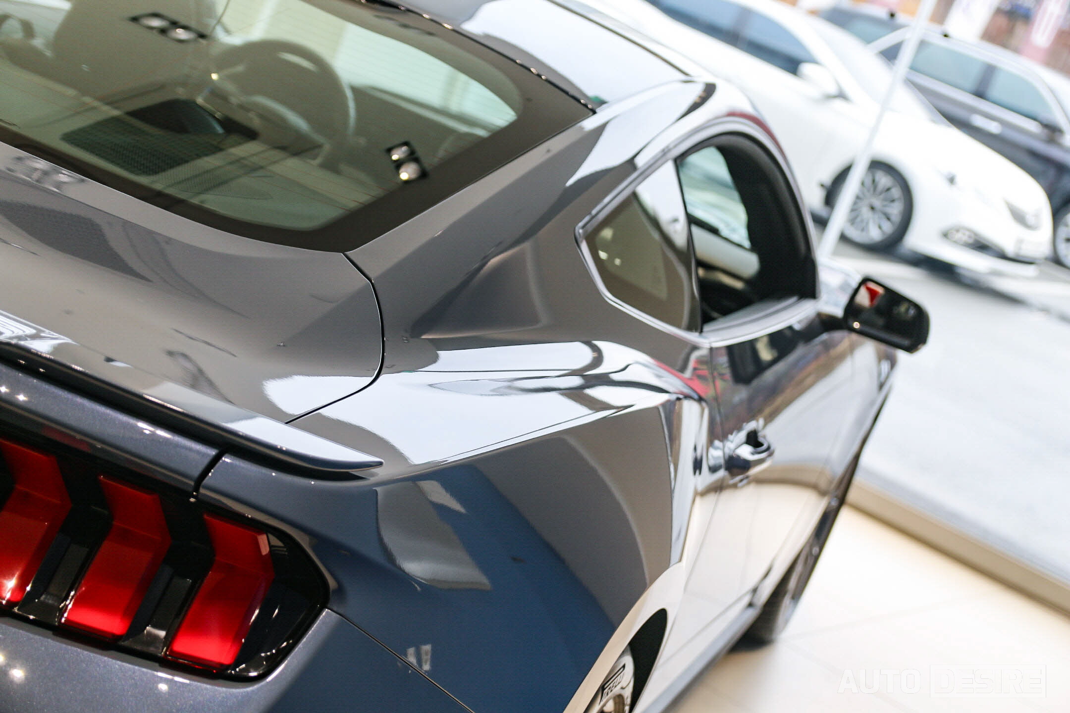 측면에서는 길게 뻗은 후드, 낮고 매끄러운 아치형의 루프라인, 여기에 크게 부풀어 오른 리어 펜더가 앞으로 바로 튀어나갈 듯한 역동적이고 스피디한 느낌을 준다. 후면에서도 스포일러처럼 과감하게 꺾어 올린 트렁크 리드에 립 스포일러를 추가로 더하고, 범퍼 하단에 리어 디퓨저와 쿼드 팁 머플러로 고성능 스포츠카 다운 모습을 확실하게 담고 있다. 리어 램프는 머스탱의 전통을 지킨 3분할 그래픽을 적용하고 후진등은 범퍼 중앙에 위치해 6세대의 스타일을 새롭게 다듬어낸 듯하다. 참고로 전시차의 외장 색상은 베이퍼 블루.