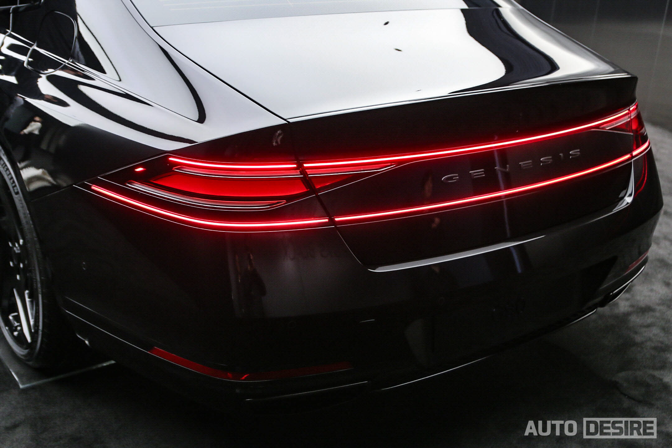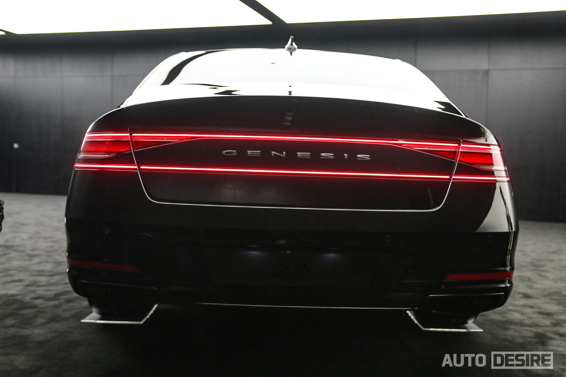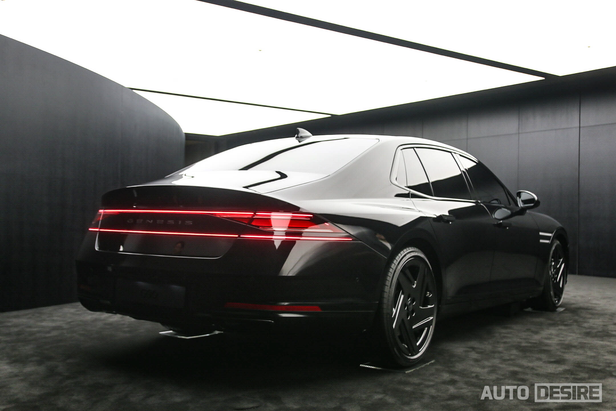 후면으로 오면 범퍼 하부 트림과 크레스트 그릴 형상의 머플러 팁도 어김없이 전부 블랙으로 변경해 차량 전체가 하나의 덩어리로 이뤄진듯한 매끄러운 일체감을 주고, GENESIS 레터링은 전면 윙 엠블럼과 동일하게 다크 그레이 컬러를 적용했다. 기존 G90 트렁크에 부착되었던 'G90', 'AWD' 레터링은 삭제해 미니멀한 스타일, 올 블랙 바디가 주는 깊이감, 무게감 그 자체에 매료될 수 있게 해준다.