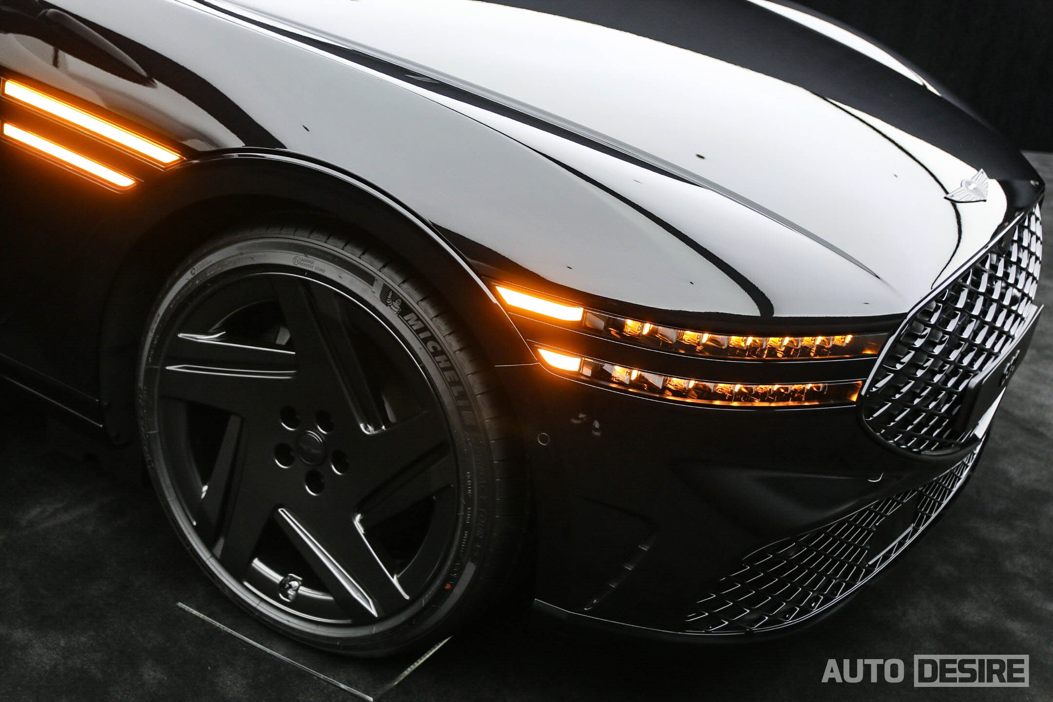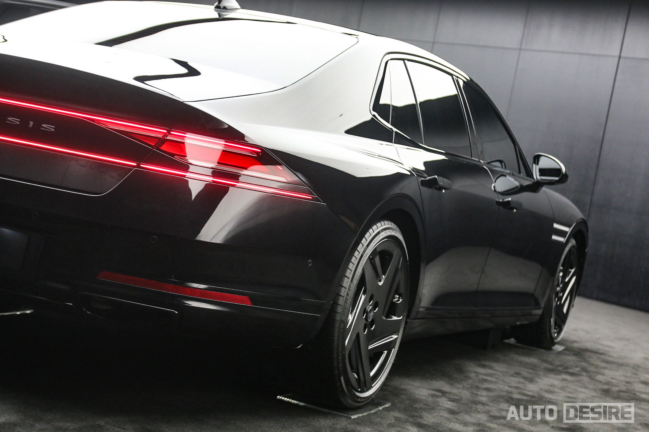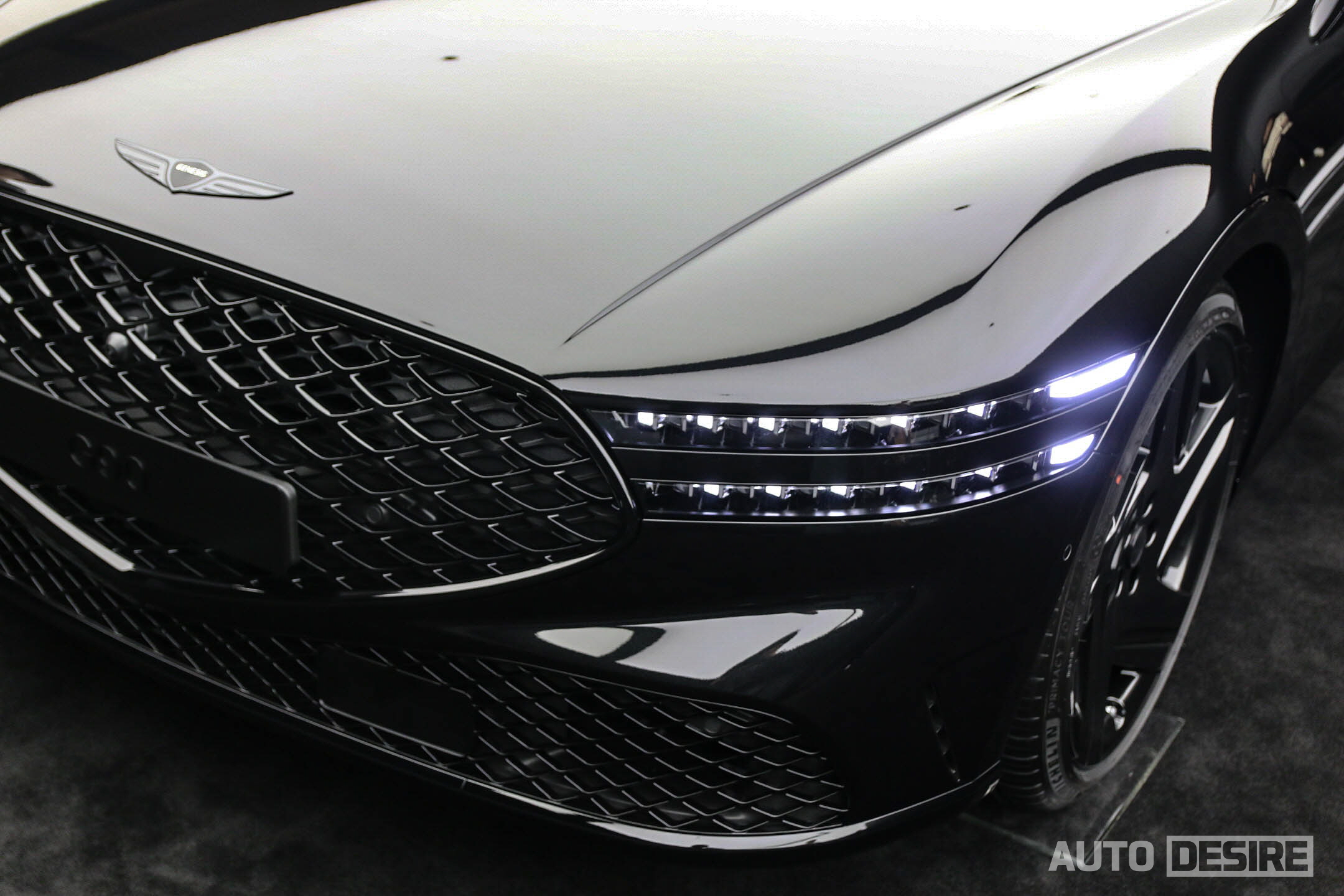 기요셰 패턴으로 섬세한 디테일을 더한 제네시스 윙 엠블럼을 다크 그레이 컬러로 변경한 것을 시작으로, 전면부의 더블 레이어드 크레스트 그릴과 범퍼 하부 트림까지 올 블랙으로 변경해 빛에 따른 대비감, 반사감과 세부적인 디테일이 더 돋보이게 했고, 두 줄 MLA LED 헤드램프의 안쪽까지 블랙 베젤을 적용했다.