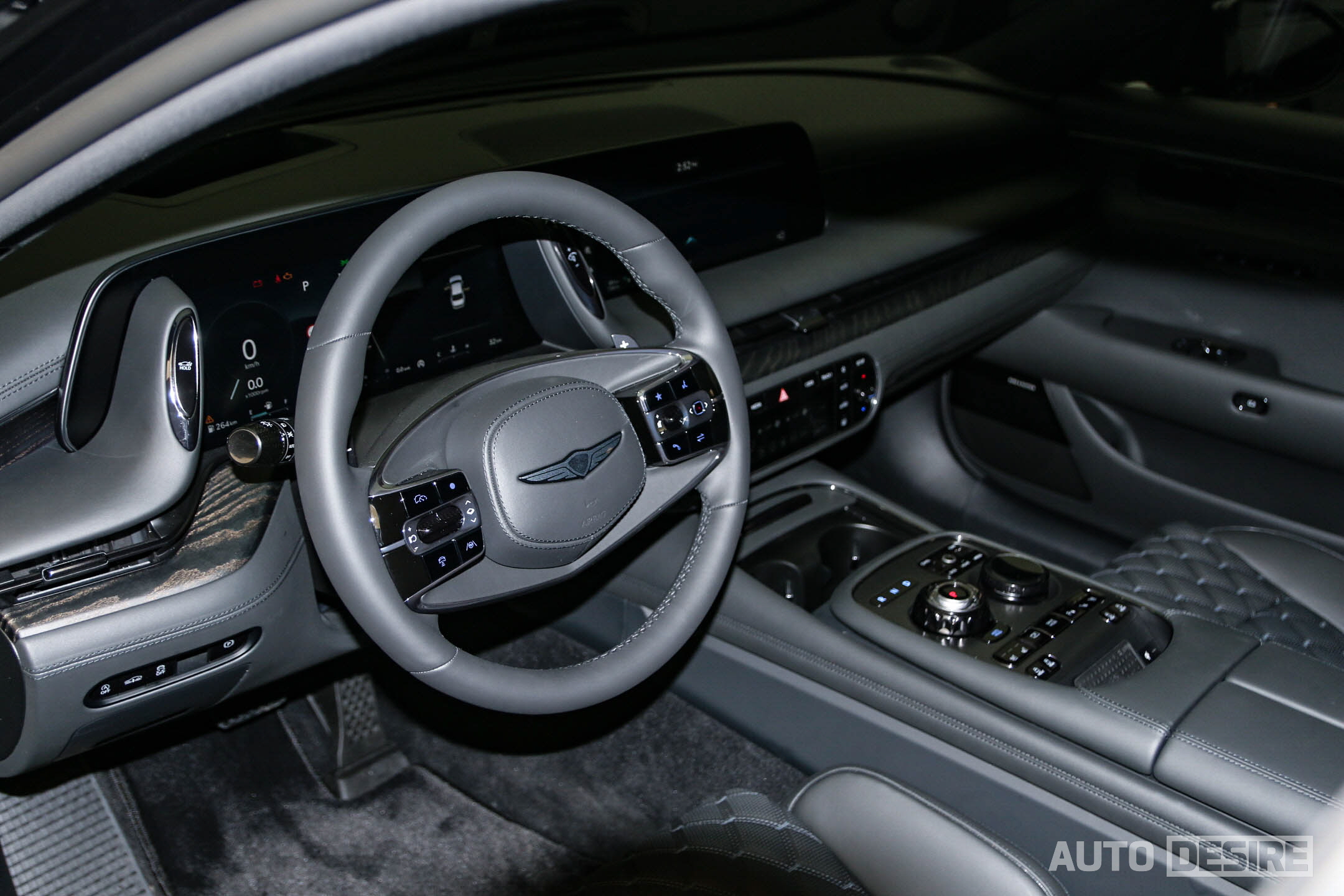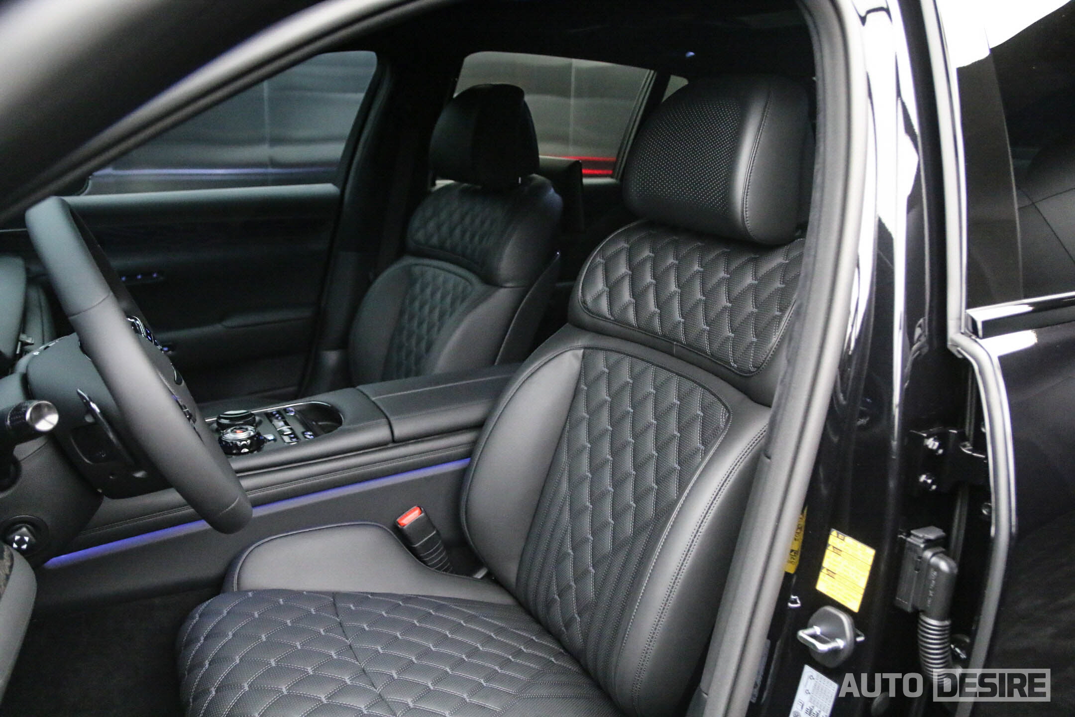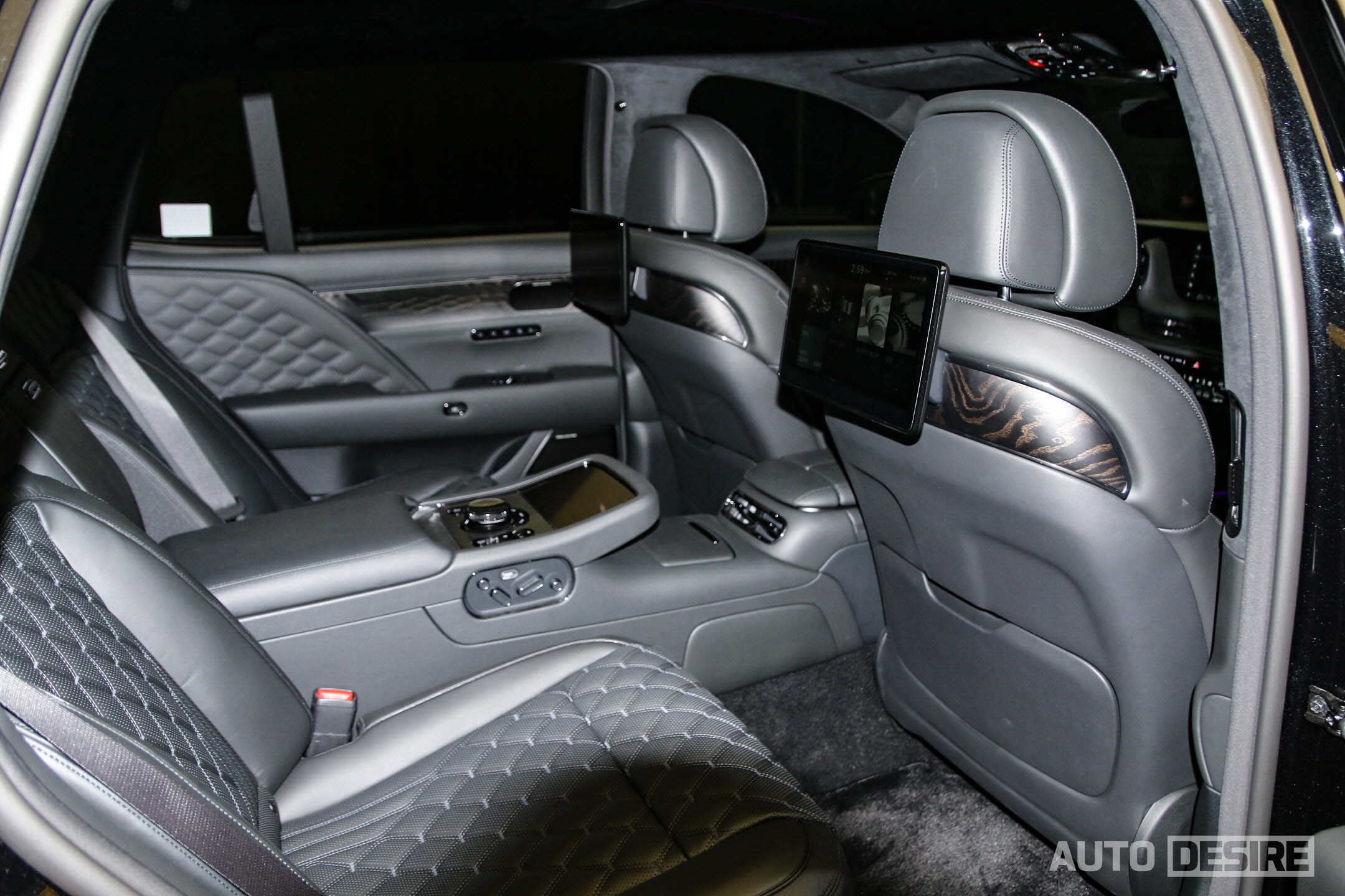 실내에서도 블랙 테마에 충실하게 블랙 원톤 인테리어를 바탕으로 블랙 애쉬 우드 가니쉬와 각 버튼/다이얼 마감부까지 블랙 크롬으로 마감해 외관에서 느껴지는 무게감, 진중함을 실내까지 분위기를 이어가며, 스페셜 모델의 새로운 특별함을 만날 수 있도록 기존 G90 LWB에만 적용되던 '세미 아닐린 가죽'과 전용 퀼팅 패턴을 시트에 적용해 남다른 고급감을 느낄 수 있게 했다.