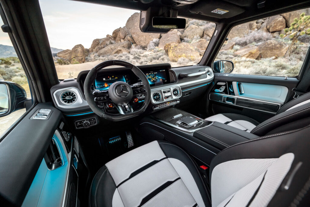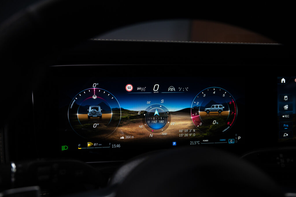 MBUX 인포테인먼트 시스템의 오프로드 콕핏 기능도 업데이트되어 차량의 주행 각도, 포지션, 현재 고도, 조향 각도, 온도 등을 12.3인치 센터 터치스크린과 디지털 클러스터에 표기해 주는 것과 함께, EQE와 GLC를 통해 먼저 적용했었던 '투명 후드' 기능을 적용, 360도 카메라를 활용해 후드 하단부가 마치 실제로 투명하게 뚫려있는 것처럼 차량 전방의 장애물들을 쉽게 확인할 수 있게 해준다.
