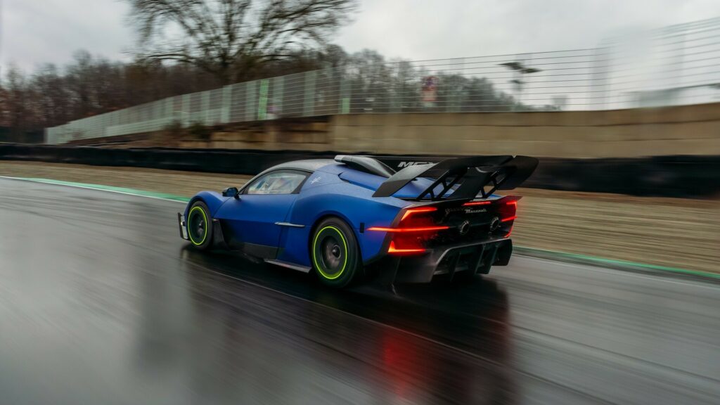 후면에서는 마세라티의 삼지창 엠블럼을 형상화한 리어 램프와 함께 중앙 부분에 높게 자리 잡은 머플러, 압도적인 사이즈의 리어 디퓨저와 다운포스를 만들어줄 리어 윙, 리어 윙과 엔진룸 에어 스쿱을 있는 셔크 핀까지 레이싱을 위해 태어난 차라는 것을 확실하게 드러내고 있다.
