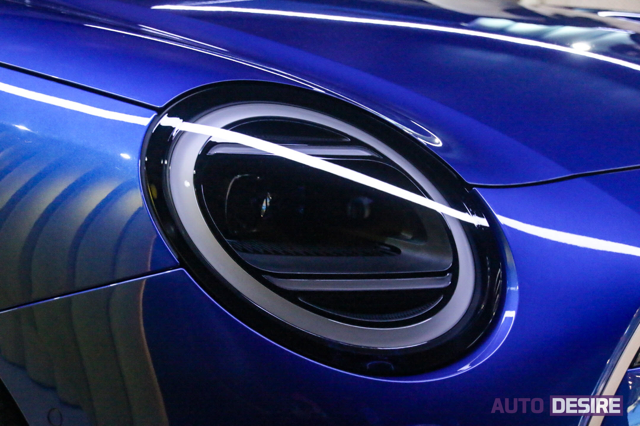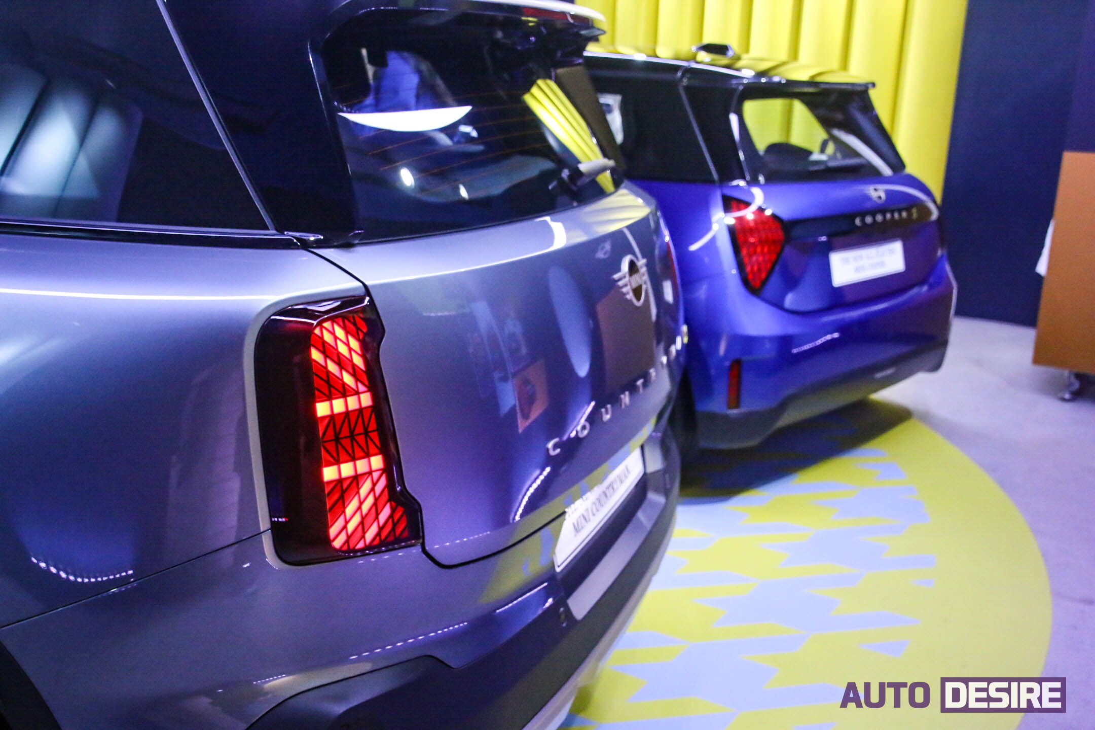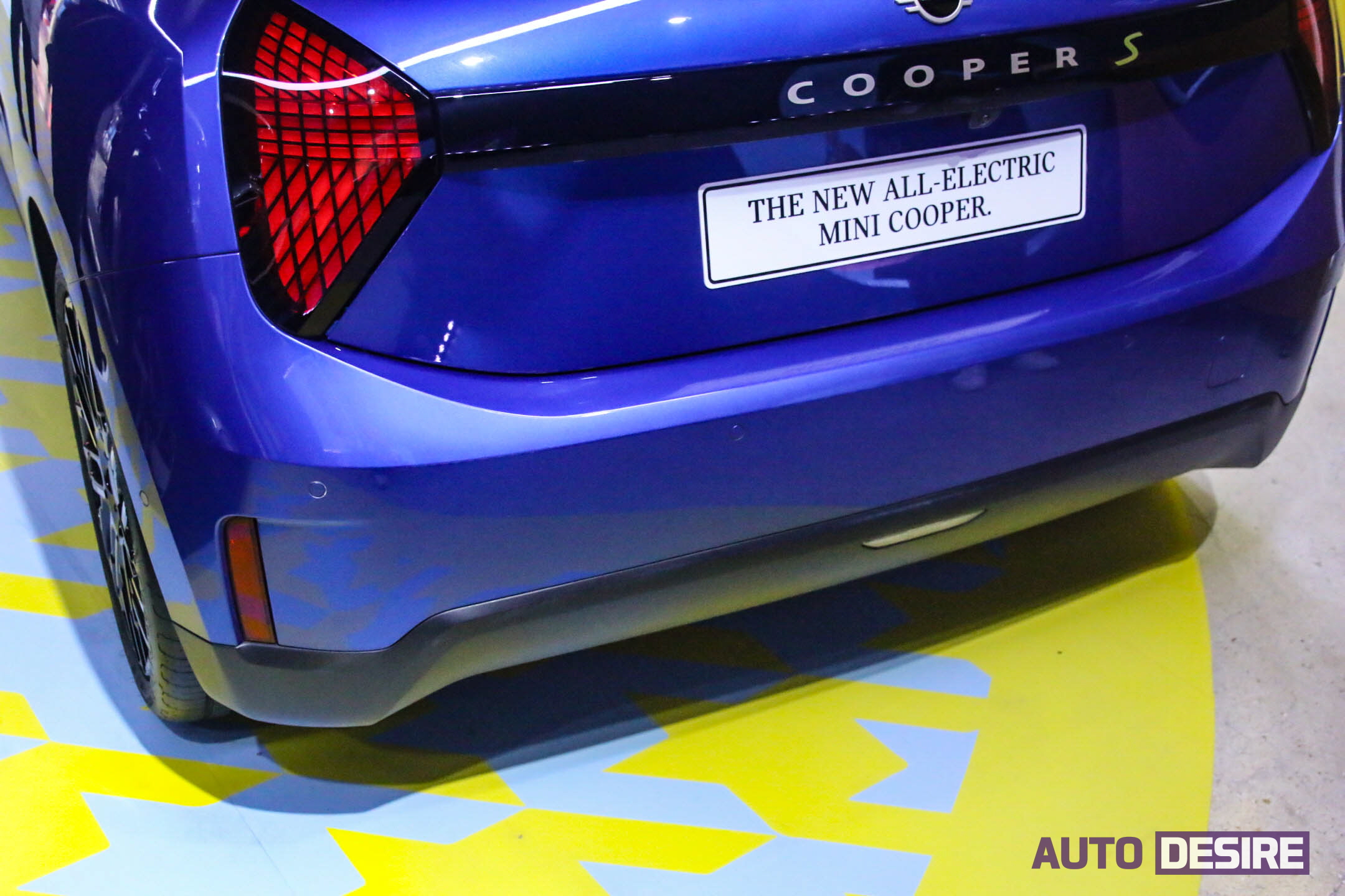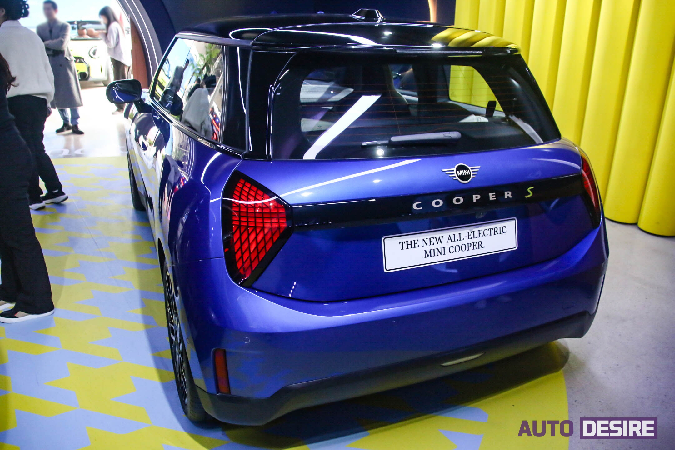 후면부에서도 미니 해치백 모델 고유의 실루엣은 이어지지만, 리어 콤비네이션 램프가 부채꼴 형태로 기존보다 샤프한 라인으로 변경되었고, 전면 주간주행등과 동일하게 리어 램프에도 시그니처 LED 라이트를 적용해, 영국 국기인 유니언잭 패턴의 클래식 모드, 위아래 두 개의 직삼각형으로 이뤄진 페이버드 모드, T자 형태의 JCW 모드까지 3가지 테마로 선택이 가능하다. 다만 전시차는 라이트가 점등 되어있지 않아 실제로 이 시그니처 LED 라이트를 확인할 수는 없었다.
