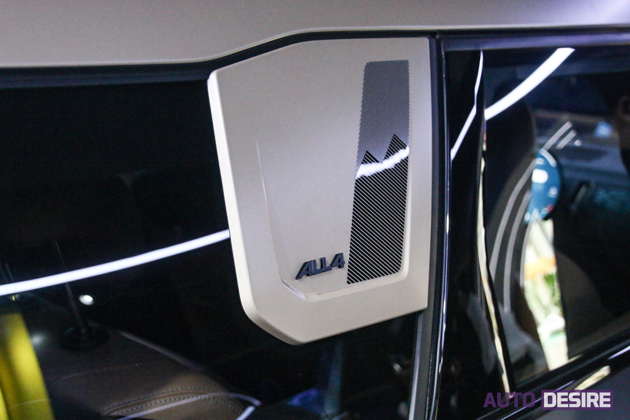 육안으로 보기에 사이즈가 더 커 보이는 데에는 프런트 후드와 벨트라인의 높이도 높아진 것이 영향을 주는 것 같다. 측면에서는 3도어 해치백 일렉트릭 모델과 동일하게 플러시 타입 도어 핸들을 적용해 공기저항을 줄이고자 한 것으로 보이지만, 이와 대비되게 볼륨감을 살린 펜더와 도어, 스키드 플레이트와 동일한 형상으로 적용한 사이드 스커트의 몰딩, C 필러에 적용된 넓은 데코 패널과 산을 연상시키게 하는 그래픽, ALL4 레터링까지 앞모습뿐만 아니라 옆에서도 SUV의 강인한 이미지를 높이고자 한 것 같다.