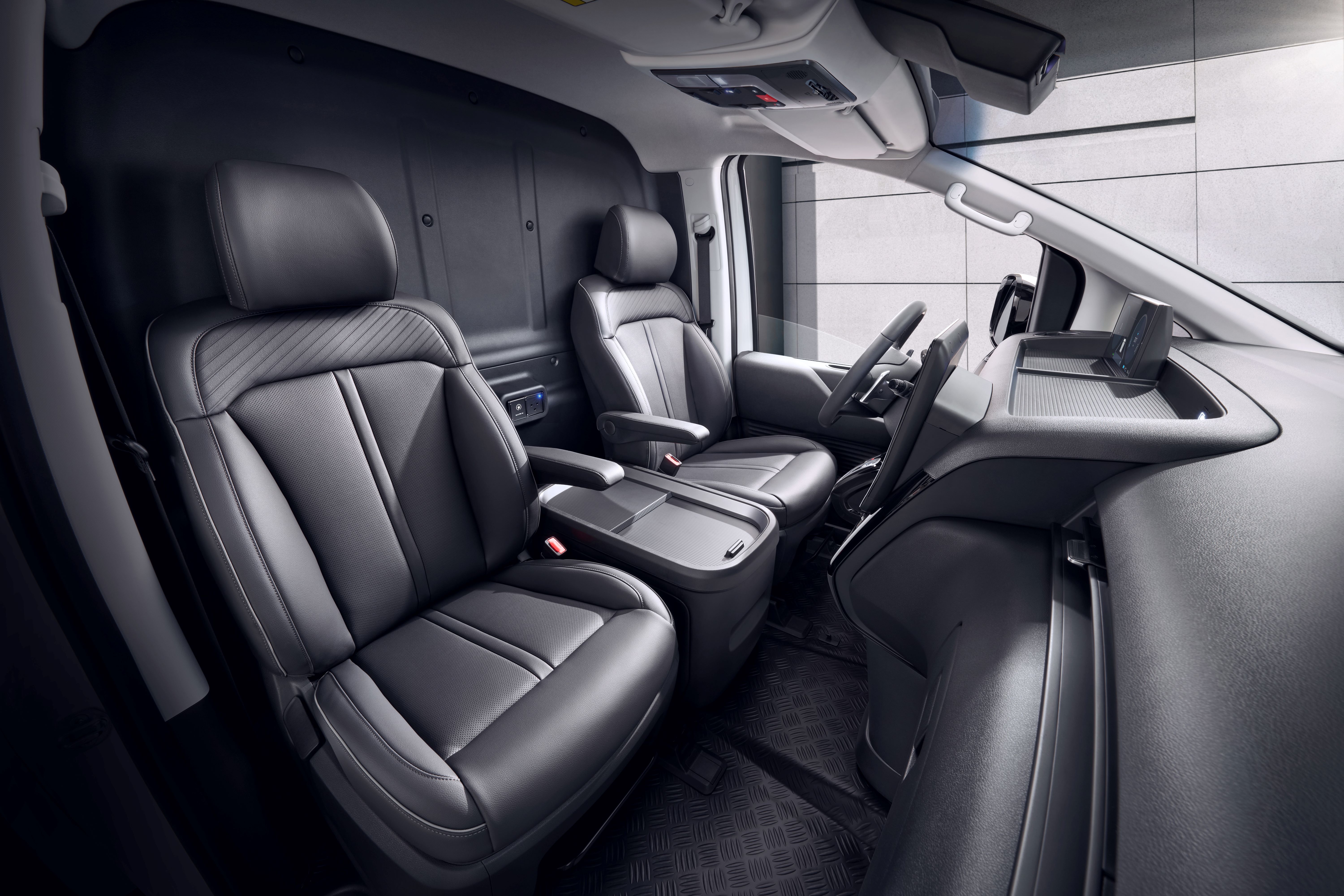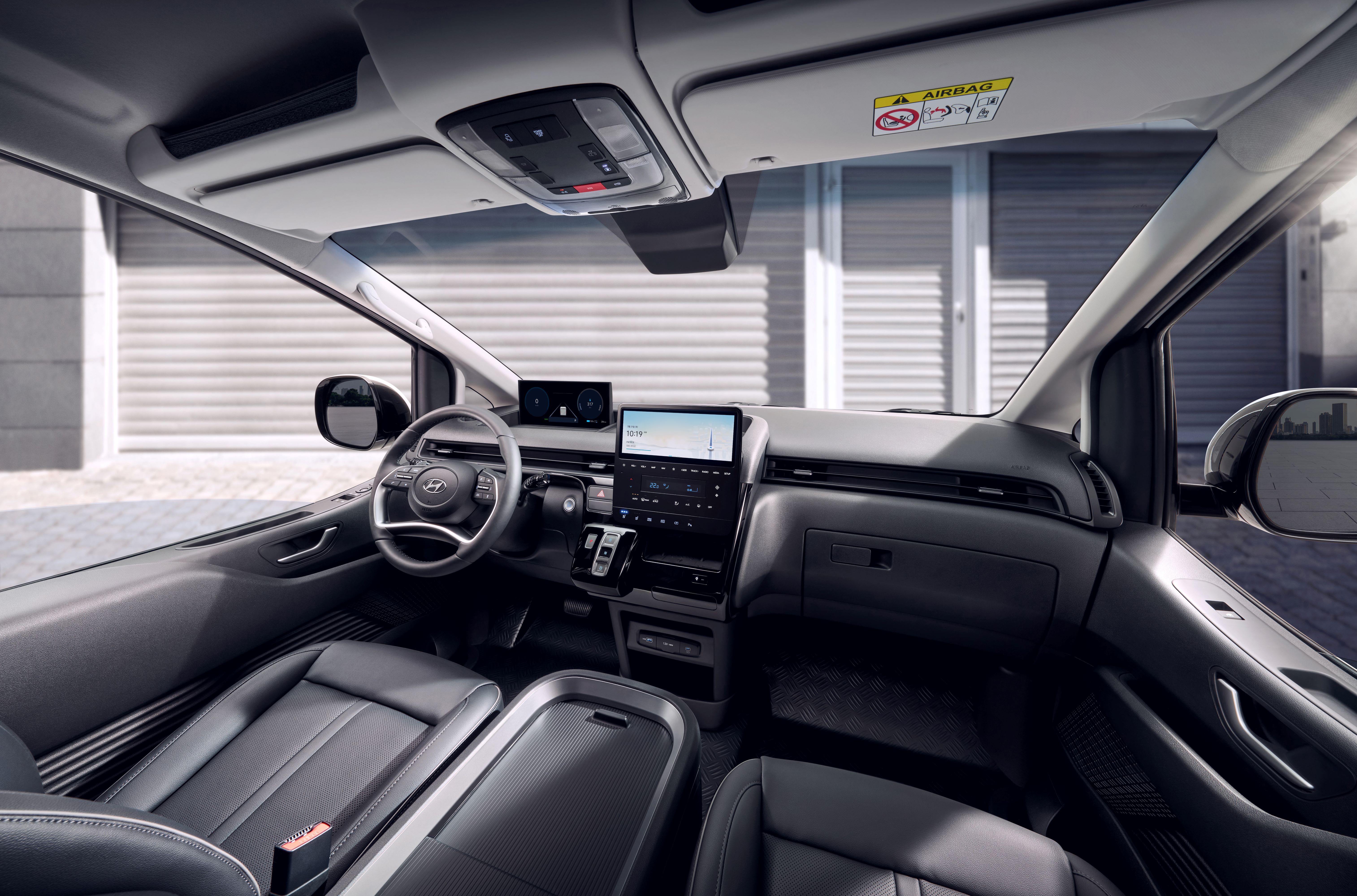 4-스포크 스티어링 휠, 전자식 변속 버튼 등 실내 역시 스타리아와 거의 동일한 구성을 보여주며, 다만 앞서 언급한 구글 OS 기반 인포테인먼트 시스템과 함께 12.3인치 디지털 클러스터와 10.25인치 전용 내비게이션 화면을 기본으로 탑재하고, 내비게이션도 클라우드 기반 음성인식 T맵 오토를 탑재, 무선 소프트웨어 업데이트도 지원하며 근처 전기차 충전소 정보, 도착 예상 배터리 잔량, 주행 가능 거리 등을 내비게이션에서 확인이 가능하다.