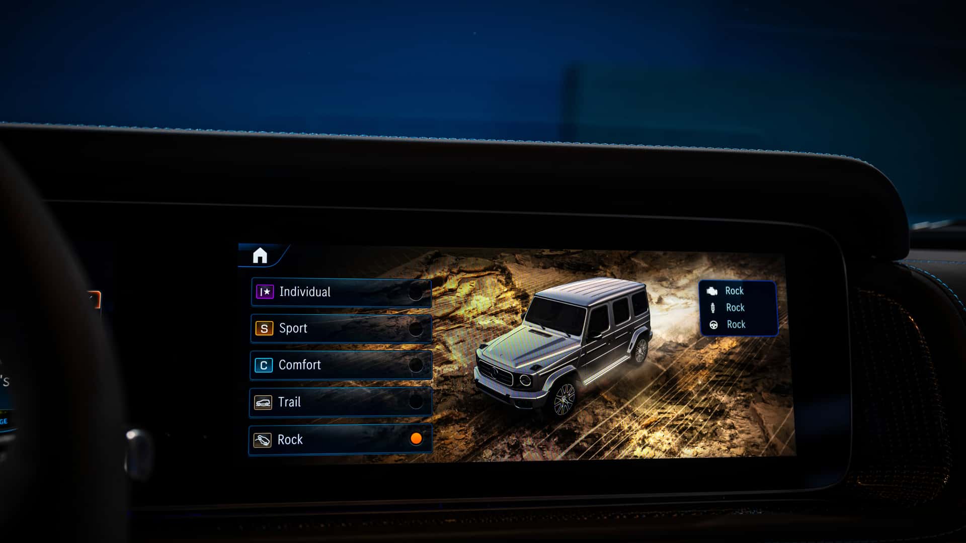 실내의 구성도 내연기관 버전의 G바겐과 크게 다르지는 않으며, 12.3인치 디지털 클러스터 및 센터 터치스크린, MBUX 인포테인먼트 시스템이 적용되며 360도 카메라와 함께 '투명 후드' 기능이 적용되어 오프로드 주행 시 차량 전방 장애물들을 더 확실하고 쉽게 확인할 수 있게 도와준다.