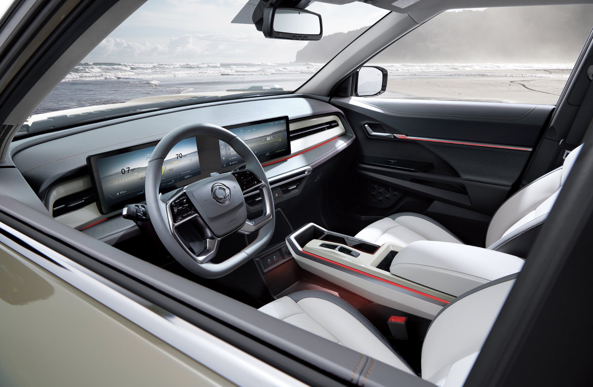 더 뉴 토레스의 주요 변화인 인테리어는 토레스 EVX의 실내와 공유하는 모습으로 엔트리 모델인 T5부터 12.3인치 클러스터와 센터 디스플레이가 이어지는 파노라마형 디스플레이가 적용되고, 플로팅 타입의 신규 센터 콘솔과 토글 타입 전자식 변속 시스템을 적용해 실내 공간의 개방감과 수납공간 효율성을 높였다.