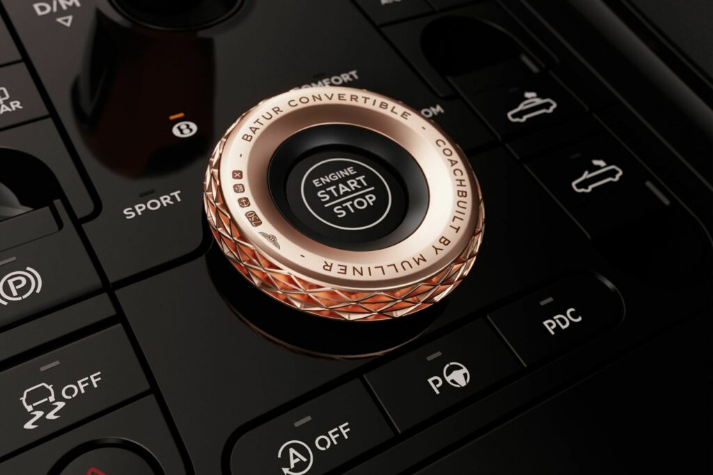 실내에는 전문 금세공인과 콜라보를 통해 3D 프린트로 제작한 로즈 골드 인서트 옵션이 제공되며 프로토타입 모델은 외장 컬러와 맞춘 버밀리온 포인트와 스티치, 블랙/그레이 투톤 인테리어가 적용되어 있지만 앞서 언급했듯 실내 컬러 역시 주문자가 원하는 대로 어떤 색상과 마감재 옵션으로도 선택이 가능하다. 이를 통해 16대의 바투르 컨버터블은 모두 다르게 제작이 가능하다.