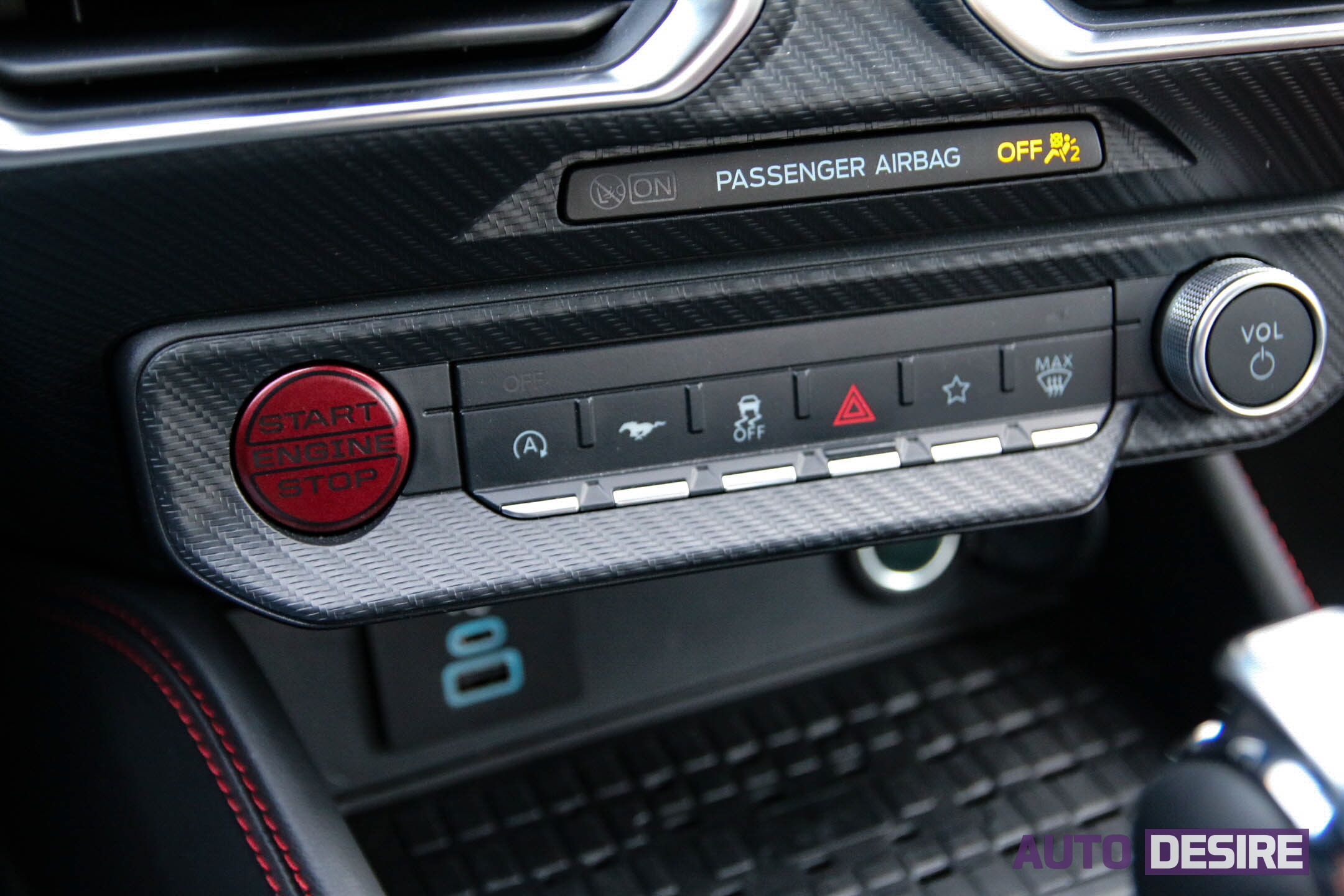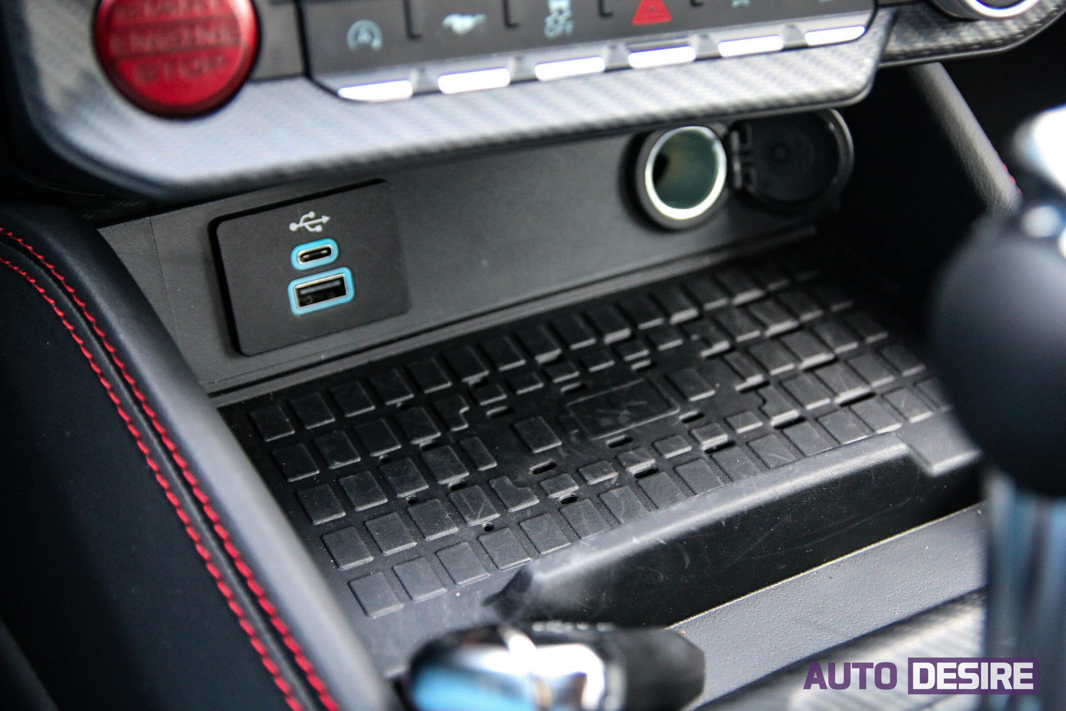 송풍구 하단부 물리버튼은 시동 버튼과 스탑앤고 OFF, 마이 머스탱, 차체 자세 제어 시스템 OFF, 비상등, 즐겨찾기, 디포그, 볼륨 조절 다이얼까지 즉각적으로 사용이 꼭 필요한 버튼들을 남겨놓아 터치 디스플레이만으로 조작하기 어려운 부분을 보완하고 있다. 센터패시아 최하단 부에는 스마트폰 무선 충전 패드와 함께 C 타입, A 타입 USB 충전/데이터 전송 포트를 두 가지 모두 남겨놓아 어떤 케이블을 사용하더라도 바로 사용할 수 있게 했고, 오른쪽 끝에 12V 파워 아웃렛도 제공해 추가적인 전원을 이용해야 하는 제품들을 사용할 수 있게 했다.