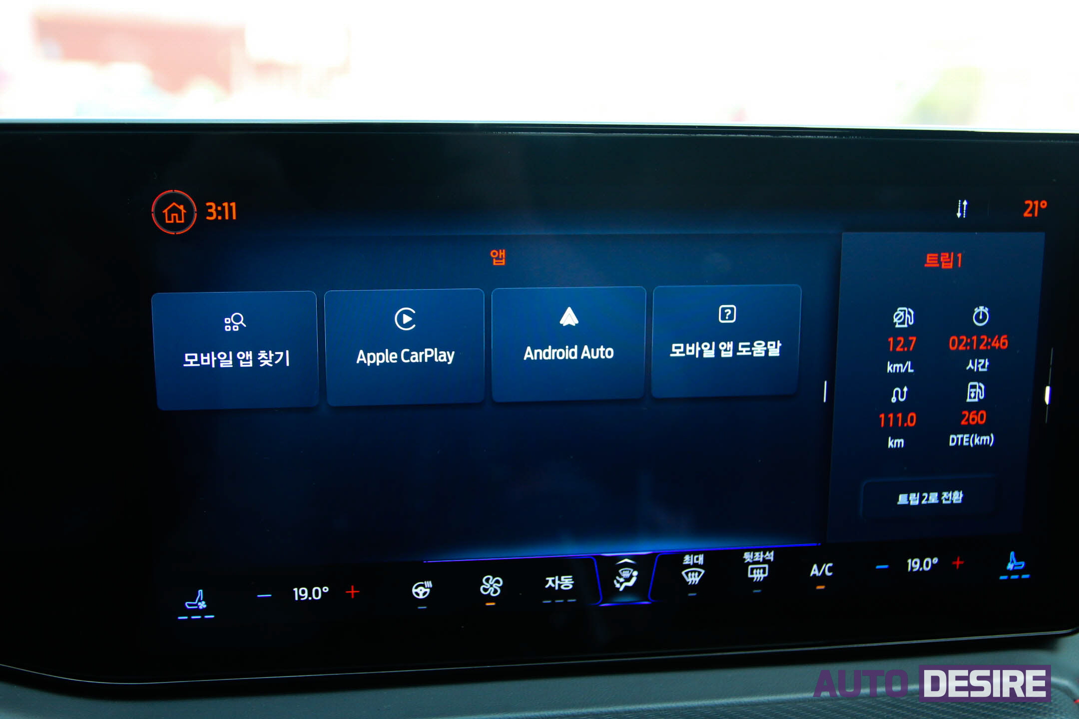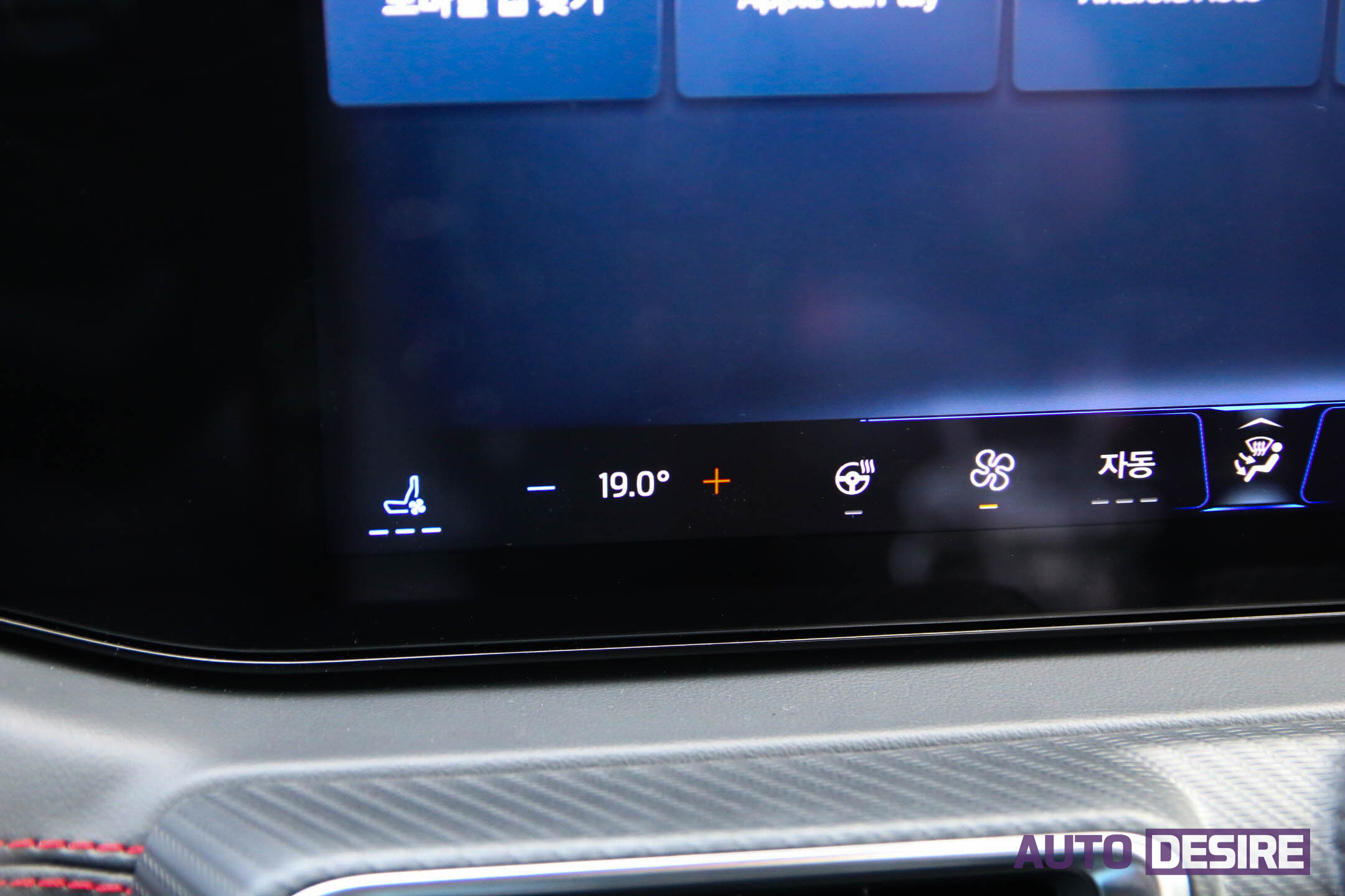 더 커진 화면에 위치도 높게 조정되어서 보기에 더 편해진 13.2인치 센터 터치스크린은 싱크 4 인포테인먼트 시스템 탑재로 안드로이드 오토와 애플 카플레이도 무선으로 사용 가능하고, 물리 버튼은 사라졌지만 스크린 하단으로 공조 컨트롤러 터치 패널을 남겨서 에어컨과 열선/통풍 시트, 열선 스티어링 힐 조작도 바로 할 수 있게 편의성을 고려한 모습이다.