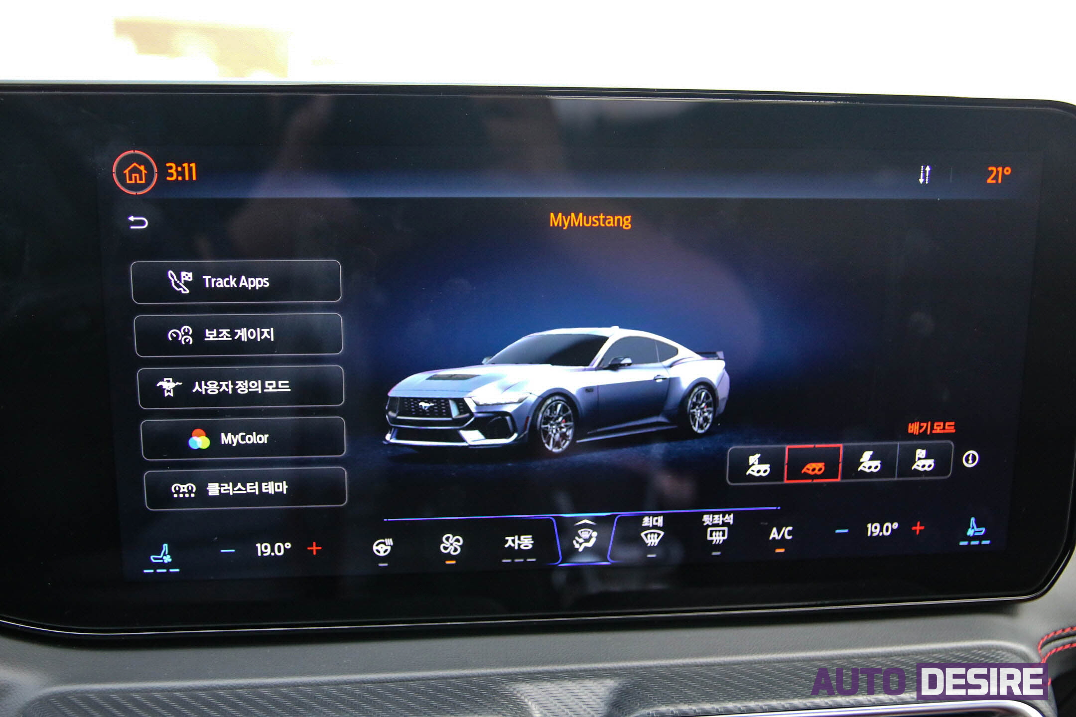 위에서 설명한 마이 머스탱 버튼을 누르면 랩타임 등 체크할 수 있는 트랙 앱과 엔진오일 온도 및 오일 압력, 배터리 전압, G-미터, 터보 부스트 압력 등 보조 게이지 창도 확인 가능해 본격적인 트랙/스포츠 주행에서 세세한 차량 상태 체크도 가능하고, 마이 컬러 메뉴에서 앰비언트 라이트 및 계기판 조명 컬러 선택이 가능하며 주행 모드와 연동 외에도 개별적으로 가변 배기 시스템 설정도 가능하다.
