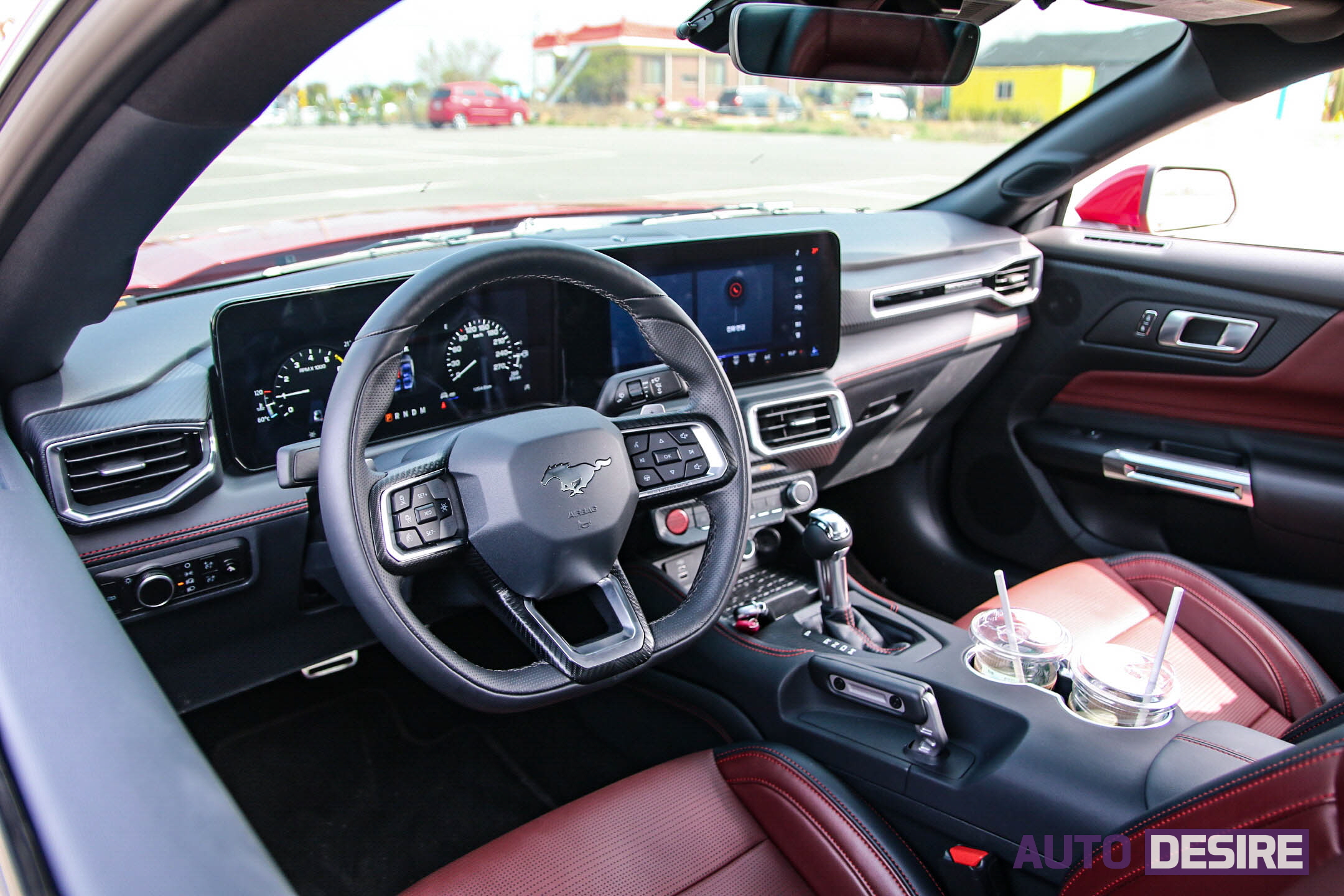 최신 자동차 인테리어 디자인 트렌드를 따라 크래시패드 상단으로 12.4인치 디지털 클러스터와 13.2인치 대화면 센터 스크린이 하나로 이어지는 곡면형 디지털 디스플레이가 자리 잡고 있으며, 센터패시아 하단에 간결하게 정리된 물리버튼과 함께 기존 원형에서 사각형으로 변경된 송풍구 디자인이 적용되었고 D 컷 타공 가죽 스티어링 휠, 센터 콘솔 밑 크래시패드 일부, 도어 트림부에 적용된 카본 패턴 마감이 머스탱의 스포티한 분위기를 실내에서도 계속해서 이어간다. 야구공을 떠올리게 하는 둥글고 긴 기어 노브, 세로로 배치한 컵홀더 등은 기존 6세대 머스탱과 흡사한 스타일을 계승한다.