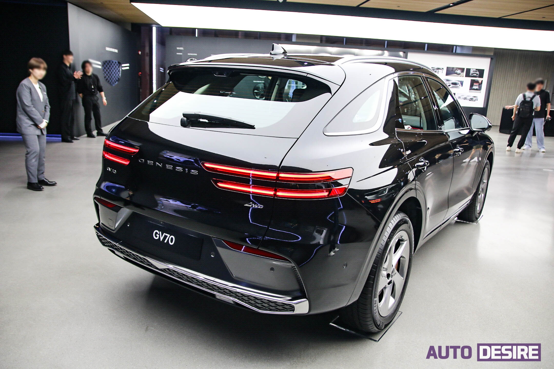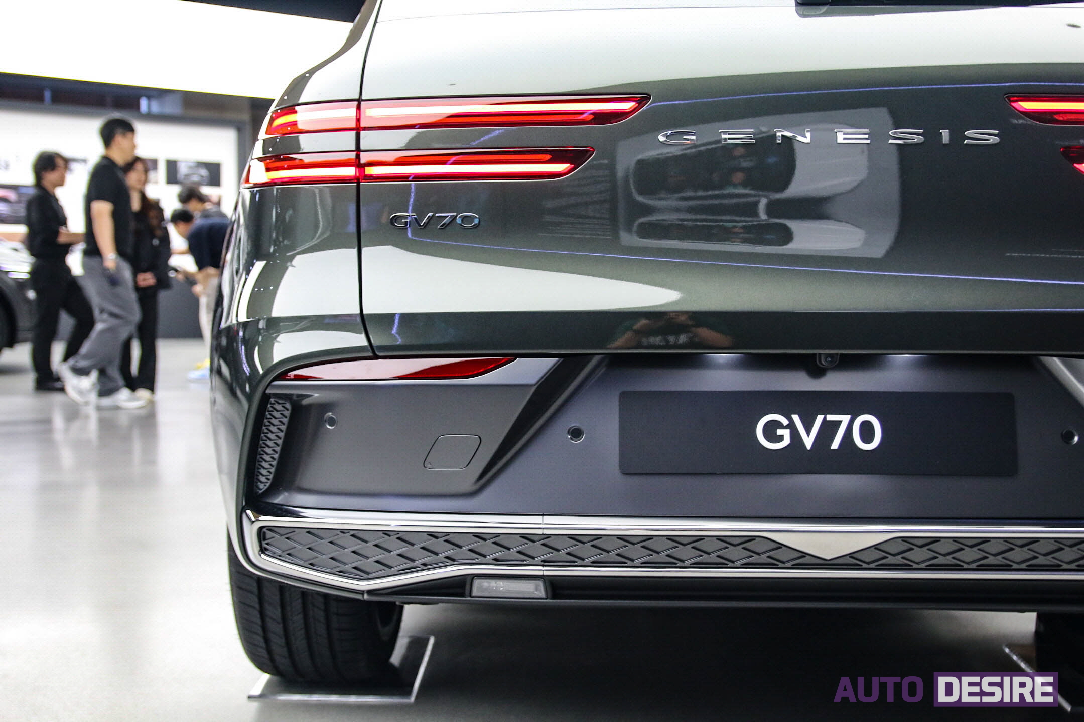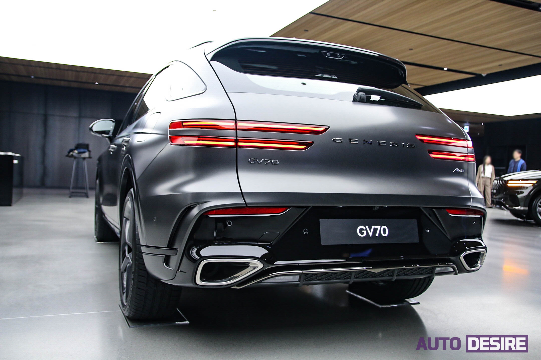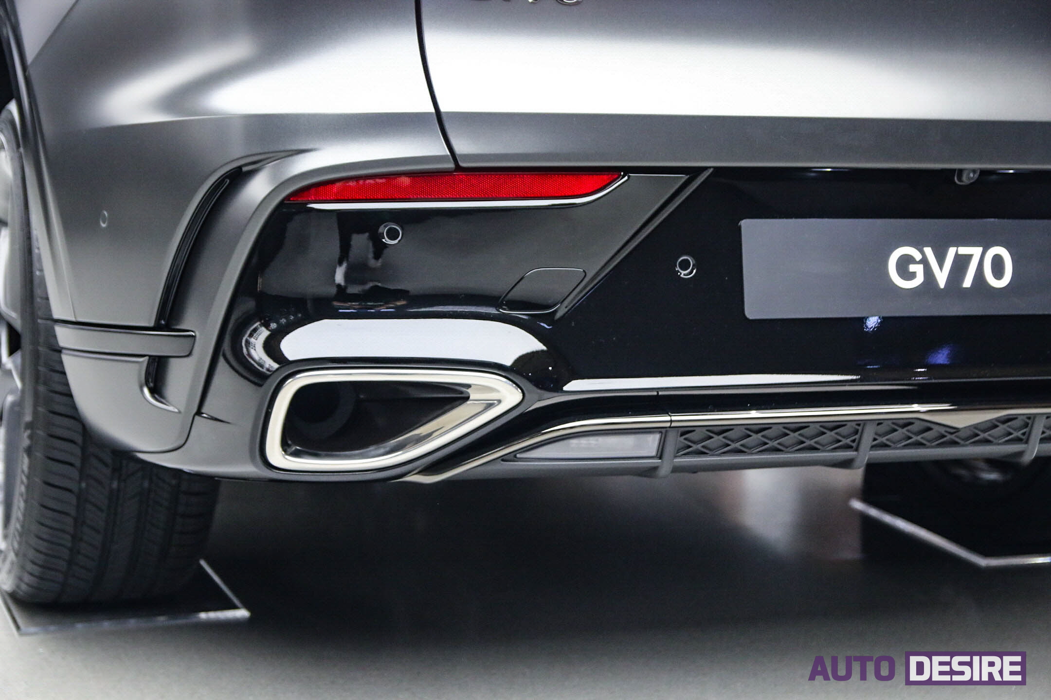 스포츠 패키지의 뒤 범퍼에는 '스포티'함을 부각시키기 위해 머플러 팁을 유지시켰고, 범퍼 좌우 끝부분에 에어커튼 디자인을 추가했으며 기존의 원형 머플러 팁을 앞 범퍼의 에어 인테이크 형상과 이어지는 각진 형태로 변경, 후진등이 매립되어 있는 리어 디퓨저 디테일도 새롭게 다듬어 앞뒤 인상 및 GV70의 전체적인 스타일과 일체감을 높이는 변화를 주었다. 특히 어색함이 남았던 원형 머플러 팁보다 신규 머플러 팁 디자인이 확실하게 잘 어울리는 것 같다.