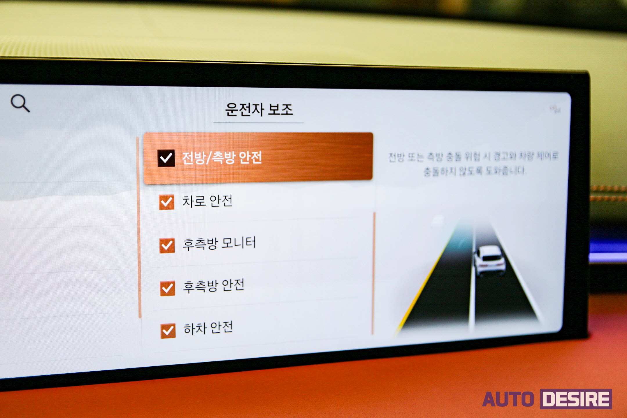 주행 보조 시스템 및 안전 사양에서는 차로 이탈방지 보조, 진동경고 스티어링 휠, 하이빔 보조, 운전자 주의 경고, 교차로 대향차 대응 전방 충돌방지 보조, 후측방 충돌방지 경고, 후방 교차 충돌방지 보조, 프로젝션 타입 후진 가이드 램프, 안전 하차 보조, 어드밴스드 후석 승객 알림, 다중 충돌방지 자동제동 시스템이 기본 제공되고, 서라운드 뷰 모니터, 후측방 모니터, 원격 스마트 주차 보조, 전/측/후방 주차 충돌방지 보조, 측방 주차 거리 경고, 고속도로 주행 보조 2, 내비게이션 기반 및 운전 스타일 연동 스마트 크루즈 컨트롤, 교차로 교차 차량 빛 측방 접근차, 추월 시 대향차, 회피 조향 보조 기능이 포함된 전방 충돌방지 보조, 1열 프리 액티브 시트 벨트, 운전자 전방 주시 경고 카메라 등이 드라이빙 어시스턴스 패키지 I, II를 통해 추가할 수 있다.