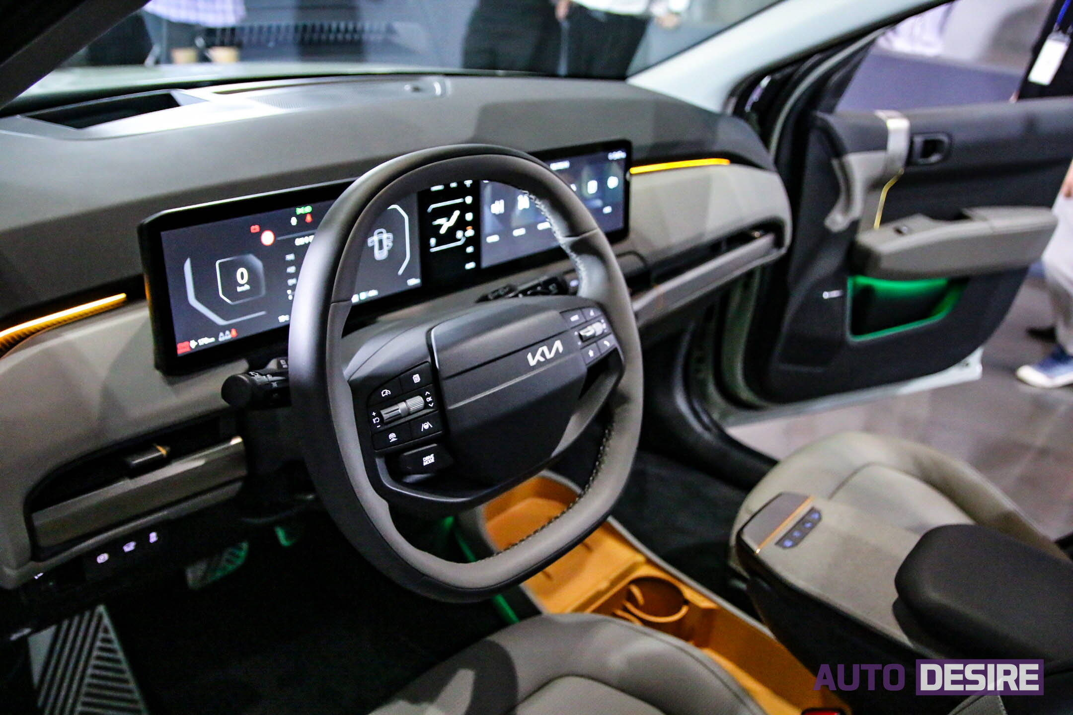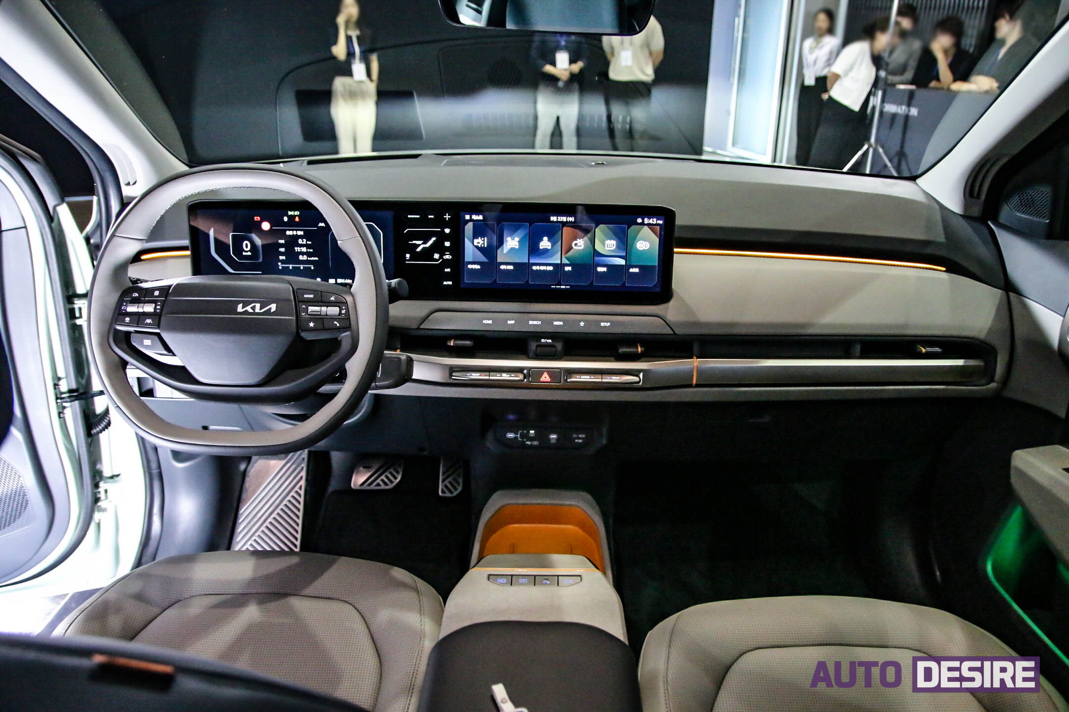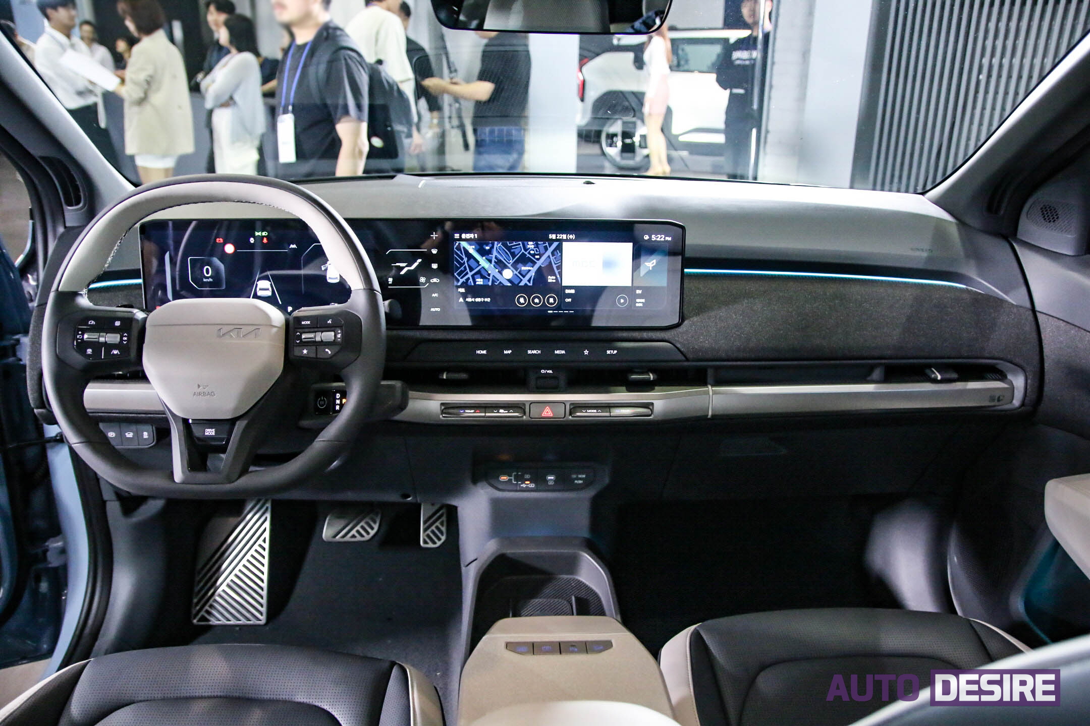 실내 디자인에서도 심플한 수평형 레이아웃을 적용해 EV9의 실내를 축소해놓은 듯한 느낌이 강하며, 다만 크래시패드, 송풍구, 하단 수납함 등에 컬러 포인트를 적용해 소형 세그먼트의 젊고 액티브한 느낌을 잘 살리고 있다. 스티어링 휠은 더 뉴 EV6와 동일한 D컷 투톤 스티어링 휠을 적용했고, 변속 레버는 EV9과 동일하게 시동 버튼이 통합된 칼럼식 전자 기어 셀렉터를 적용, 센터 콘솔부는 플로팅 타입으로 상단부에는 위치 조정이 가능한 '슬라이딩 콘솔 테이블'을 최초로 적용해 정차 중에 여러 용도로 활용할 수 있다. 컵홀더와 무선 충전 시스템은 하단부 공간에 위치한다.