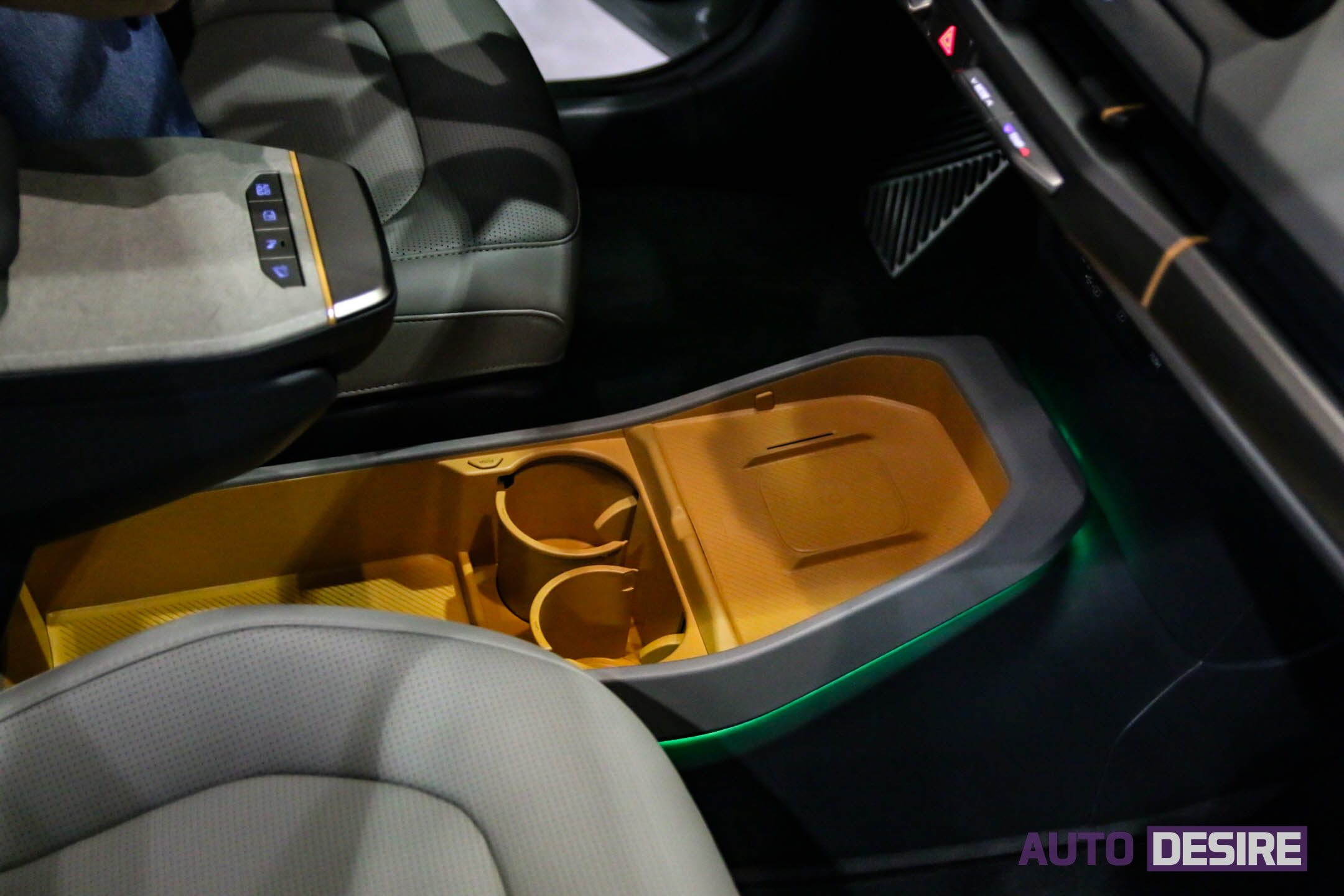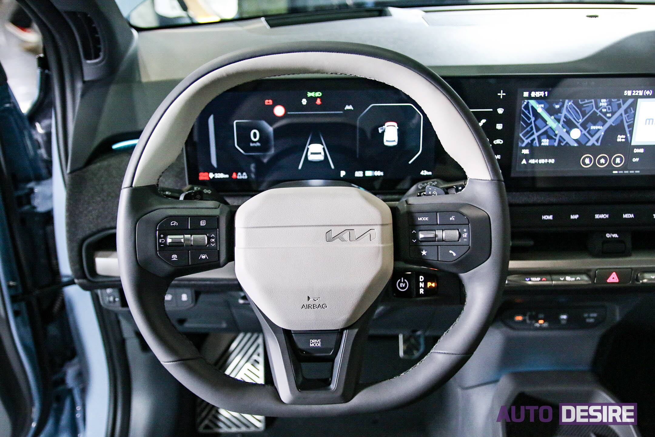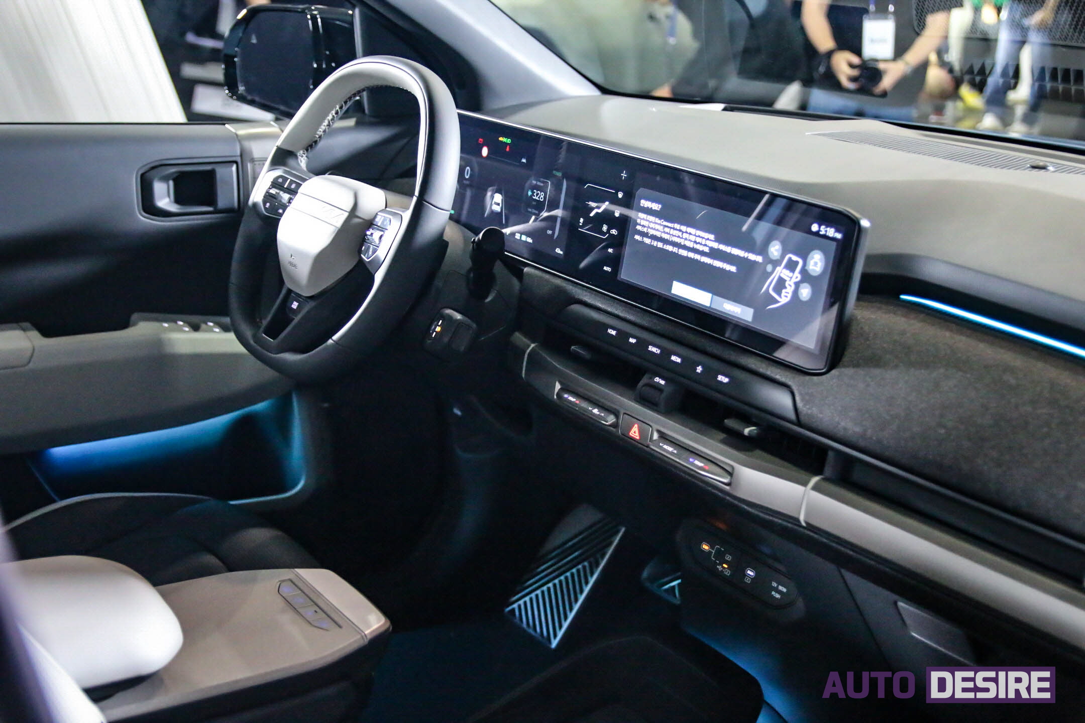 실내 디자인에서도 심플한 수평형 레이아웃을 적용해 EV9의 실내를 축소해놓은 듯한 느낌이 강하며, 다만 크래시패드, 송풍구, 하단 수납함 등에 컬러 포인트를 적용해 소형 세그먼트의 젊고 액티브한 느낌을 잘 살리고 있다. 스티어링 휠은 더 뉴 EV6와 동일한 D컷 투톤 스티어링 휠을 적용했고, 변속 레버는 EV9과 동일하게 시동 버튼이 통합된 칼럼식 전자 기어 셀렉터를 적용, 센터 콘솔부는 플로팅 타입으로 상단부에는 위치 조정이 가능한 '슬라이딩 콘솔 테이블'을 최초로 적용해 정차 중에 여러 용도로 활용할 수 있다. 컵홀더와 무선 충전 시스템은 하단부 공간에 위치한다.