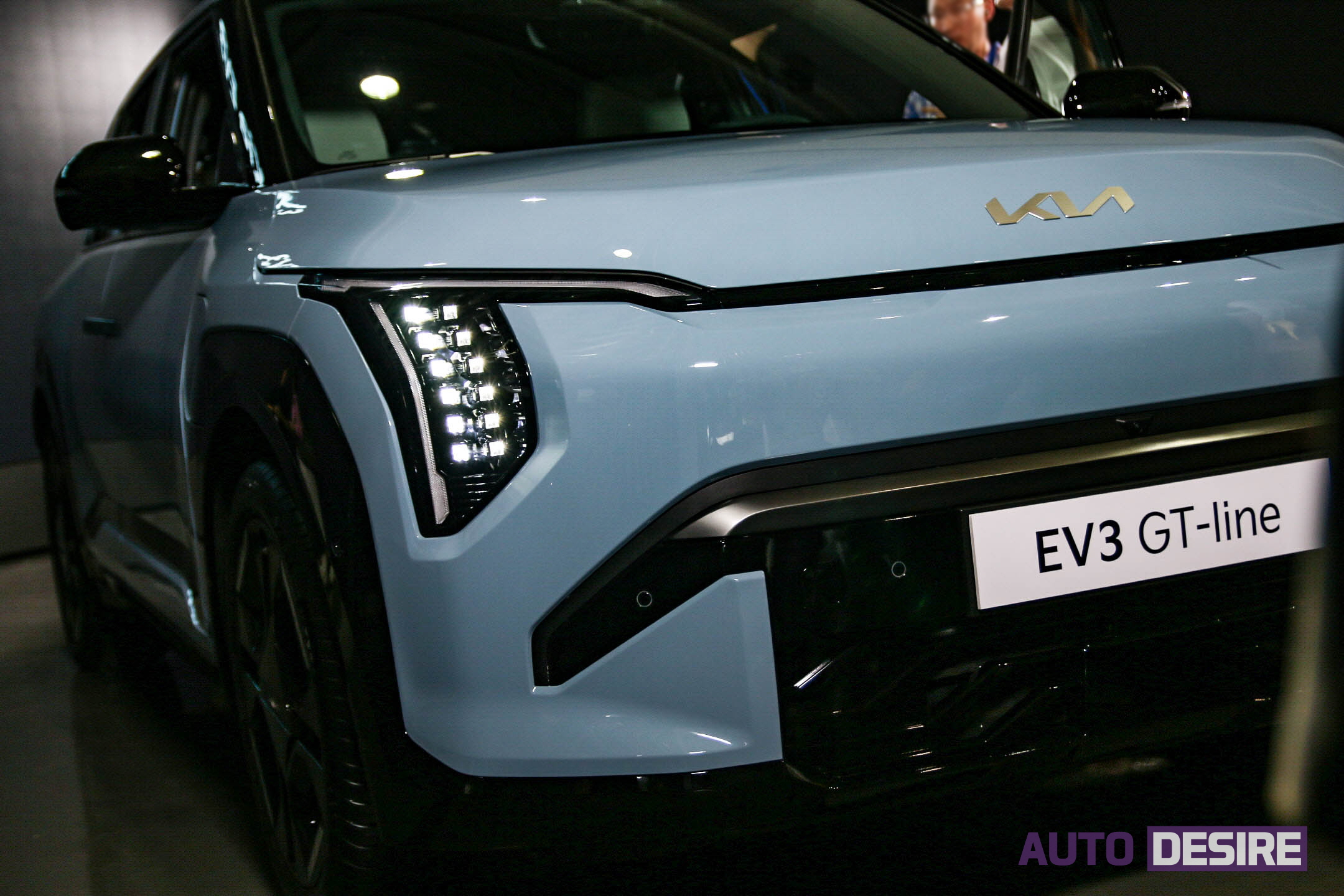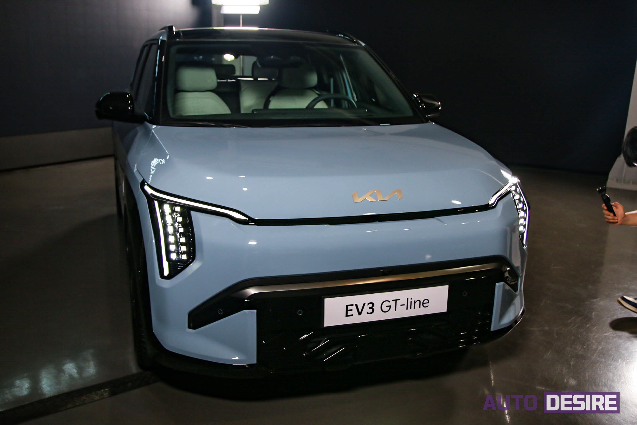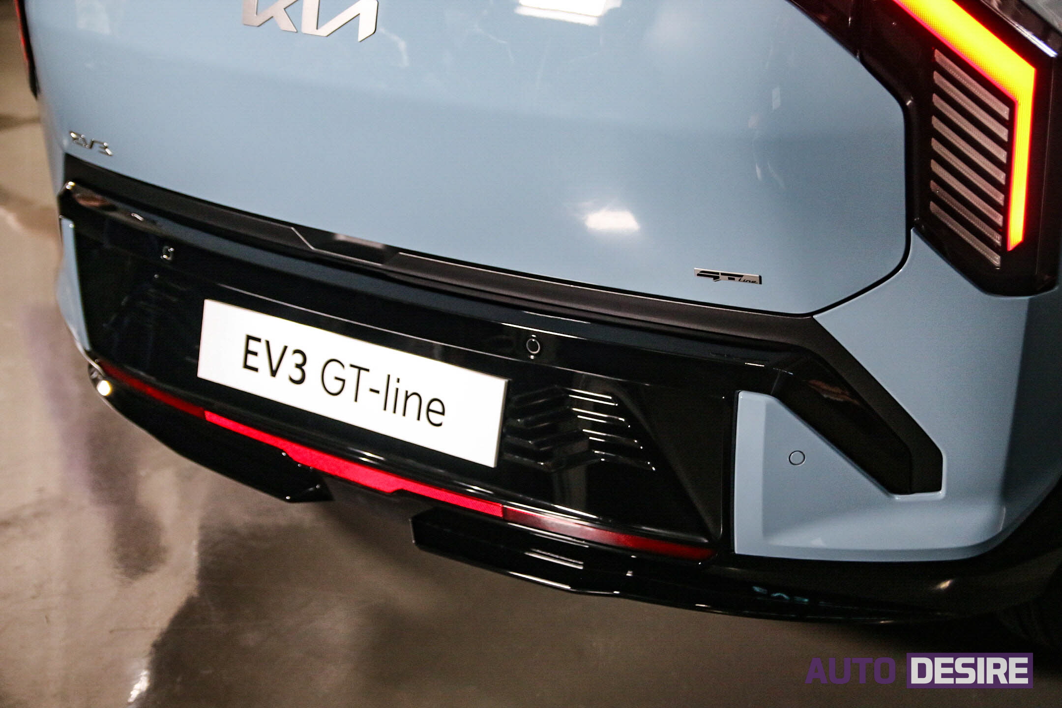 EV3 GT 라인은 전면부에 와이드하게 펼쳐지는 날개를 형상화한 범퍼 가니시와 이를 감싸면서 중앙 에어벤트 부분으로 이어지는 날카로운 범퍼 디자인을 통해 다른 트림 대비 역동성을 더 강하게 부각시키는 스타일을 가져가고, 무광 재질이었던 사이드 미러 커버와 함께 범퍼 하단, 휠 아치, 도어 클래딩을 블랙 하이글로시로 적용해 세련미를 높이고 바디 컬러와 더 강한 대비감을 살렸다. GT 라인 전용 휠도 림 일부를 제외한 스포크 전체를 블랙으로 적용하고 심플하지만 날카로운 스타일의 트윈 4 스포크 디자인으로 차별화했다.