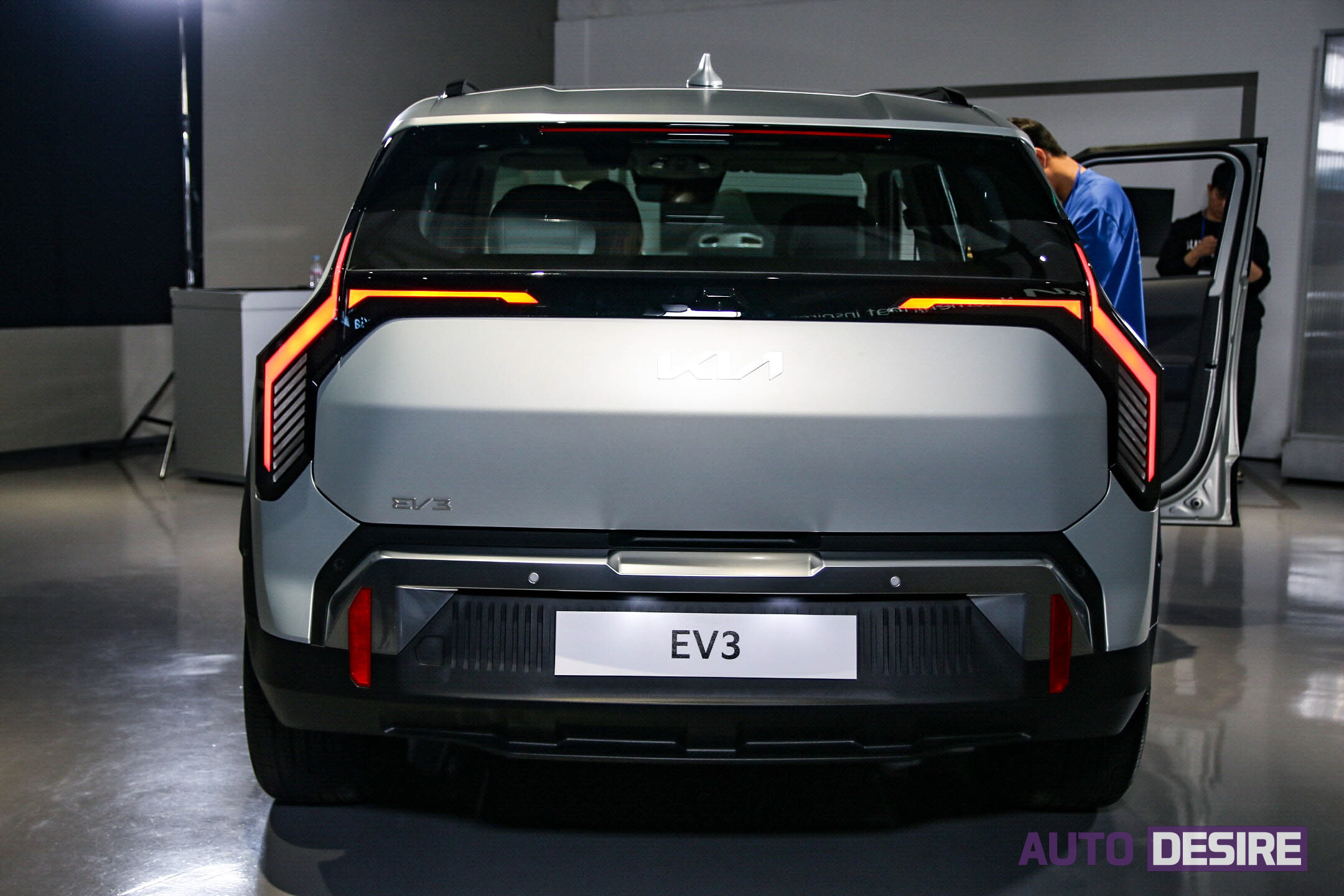 후면에서는 리어 글라스와 이어지는 스타맵 시그니처 라이팅이 적용된 리어 콤비네이션 램프가 EV9을 축소해놓은 듯한 인상을 주며, LED 방향지시등에도 빗살 패턴을 적용한 모습이다. 테일게이트는 표면 자체에 입체적 형상을 적용한 것 외에 특별한 장식 요소를 더 더하지는 않았고, 대신 범퍼에는 수직형 리플렉터와 함께 반광 크롬 몰딩과 번호판 양옆 부분으로 빗살 패턴을 적용해 밋밋함은 덜고 다부진 인상을 살리고 있다.