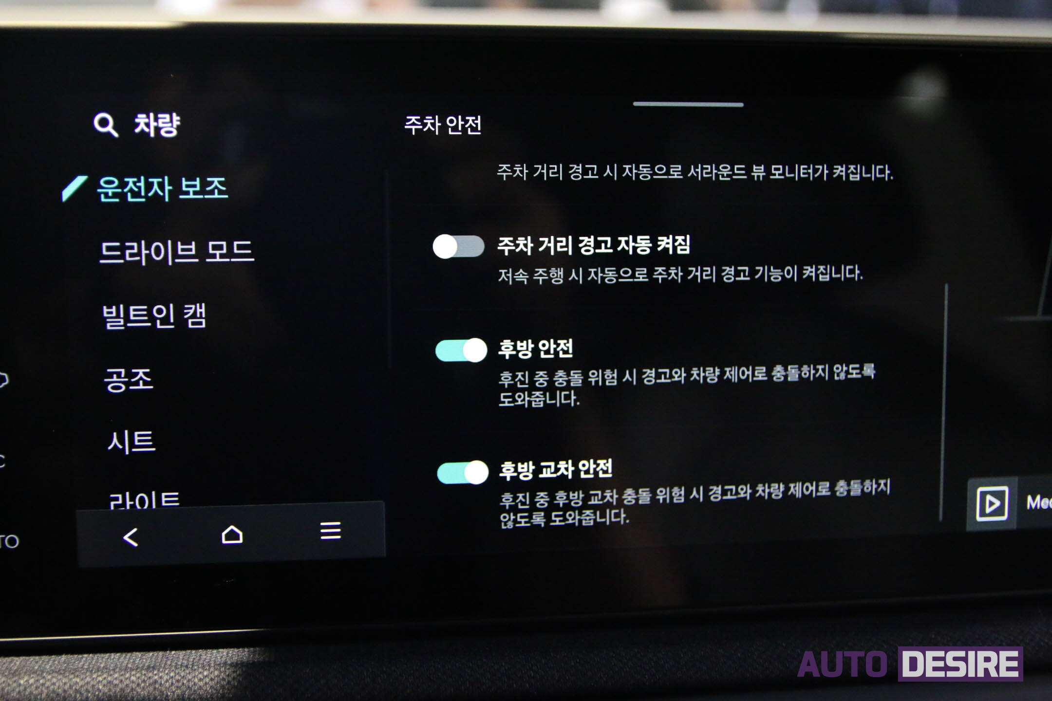 주행 보조 시스템 및 안전 사양은 스티어링 휠 그립 감지, 전방 충돌방지 보조, 후측방 충돌방지 보조, 차로 이탈방지 보조, 지능형 속도 제한 보조, 후측방 모니터, 운전자 주의 경고, 내비게이션 기반 스마트 크루즈 컨트롤, 차로 유지 보조 2, 고속도로 주행 보조 2, 하이빔 보조 등과 함께 서라운드 뷰 모니터, 후방 교차 충돌방지 보조, 전/측/후방 주차 거리 경고, 후방 주차 충돌방지 보조, 원격 스마트 주차 보조, 안전 하차 경고, 후석 승객 알림까지 안전 측면에서도 꼼꼼하게 갖추고 있는 모습이다.