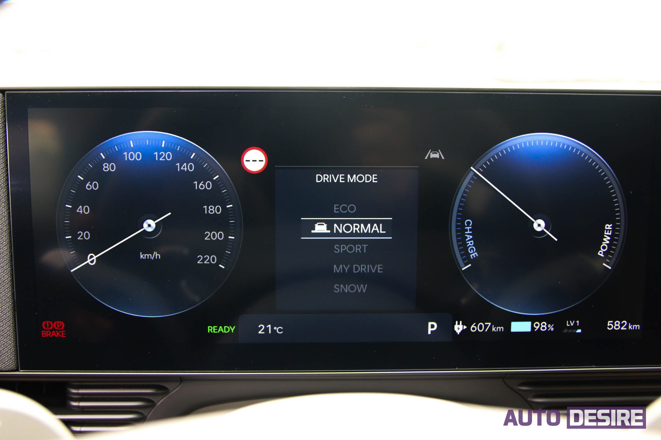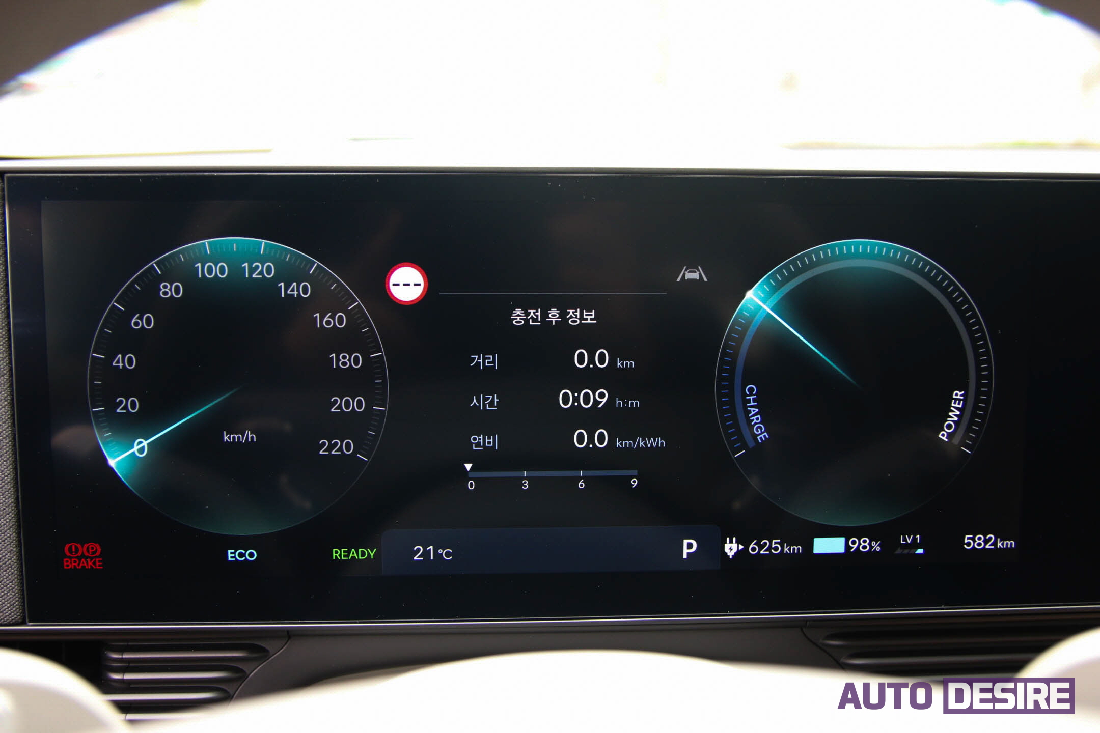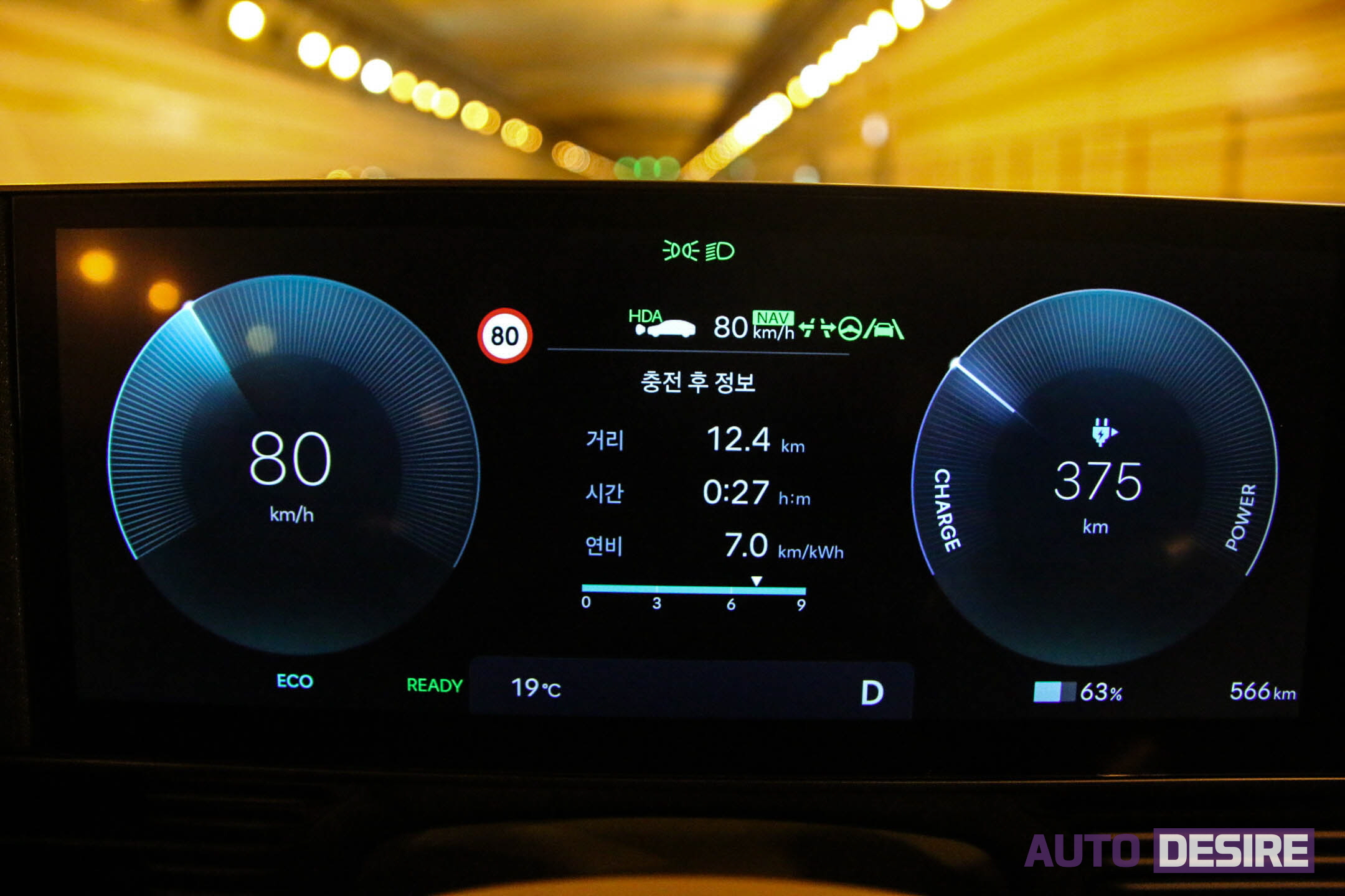시승한 시기가 주간 온도가 20~25도 내외의 따뜻한 날씨로 배터리 성능을 최적으로 발휘하기에 좋은 여건이기도 했지만, 기흥휴게소에서 배터리를 99%까지 충전한 상태에서 ECO 주행 모드로 표시되는 주행 가능 거리는 628km, 에어컨을 송풍 강도 1단에 온도 19도로 설정했을 시에도 601km까지 표기가 되었고, 경부고속도로-천안논산고속도로-호남고속도로를 따라 전주IC까지(일부 정체, 80~90km/h 내외 주행 구간 포함) 160km 정도를 주행한 후 표기된 연비는 7.4km/kWh에 남은 주행 가능 거리도 500km 이상으로 상당히 여유가 있었다.