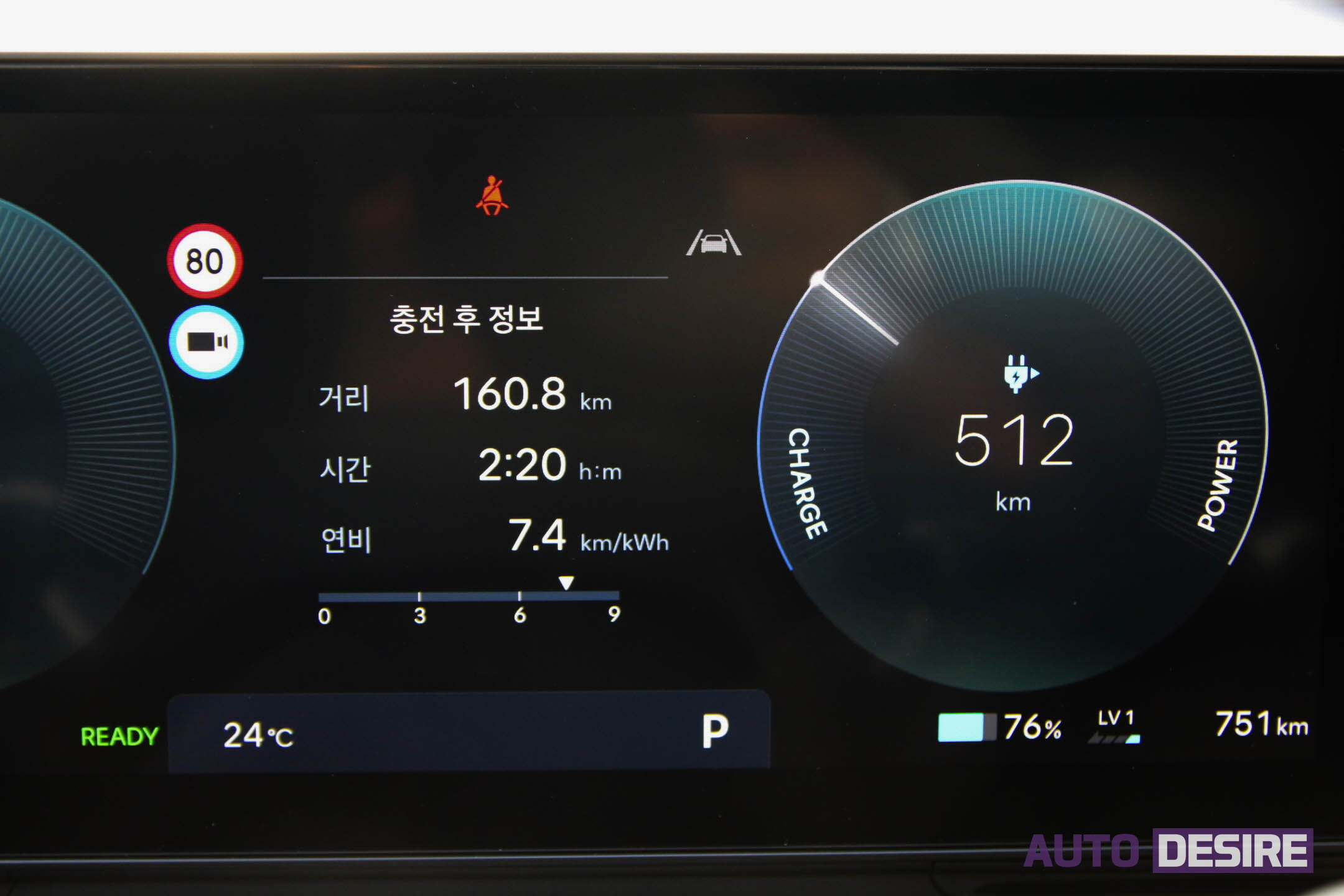이 이후에도 재충전을 거치고 경기도로 다시 복귀하면서 야간에 상행 방향 고속도로를 110km/h 이상의 속도로 주행에도 완충 시 무난히 500km 이상은 주행이 가능한 것으로 확인해서, 여름철에 에어컨을 같이 사용하더라도 400km 이상은 충분히, 장거리 여행에서도 충전을 자주 해야 할 걱정은 하지 않아도 될 것 같다.