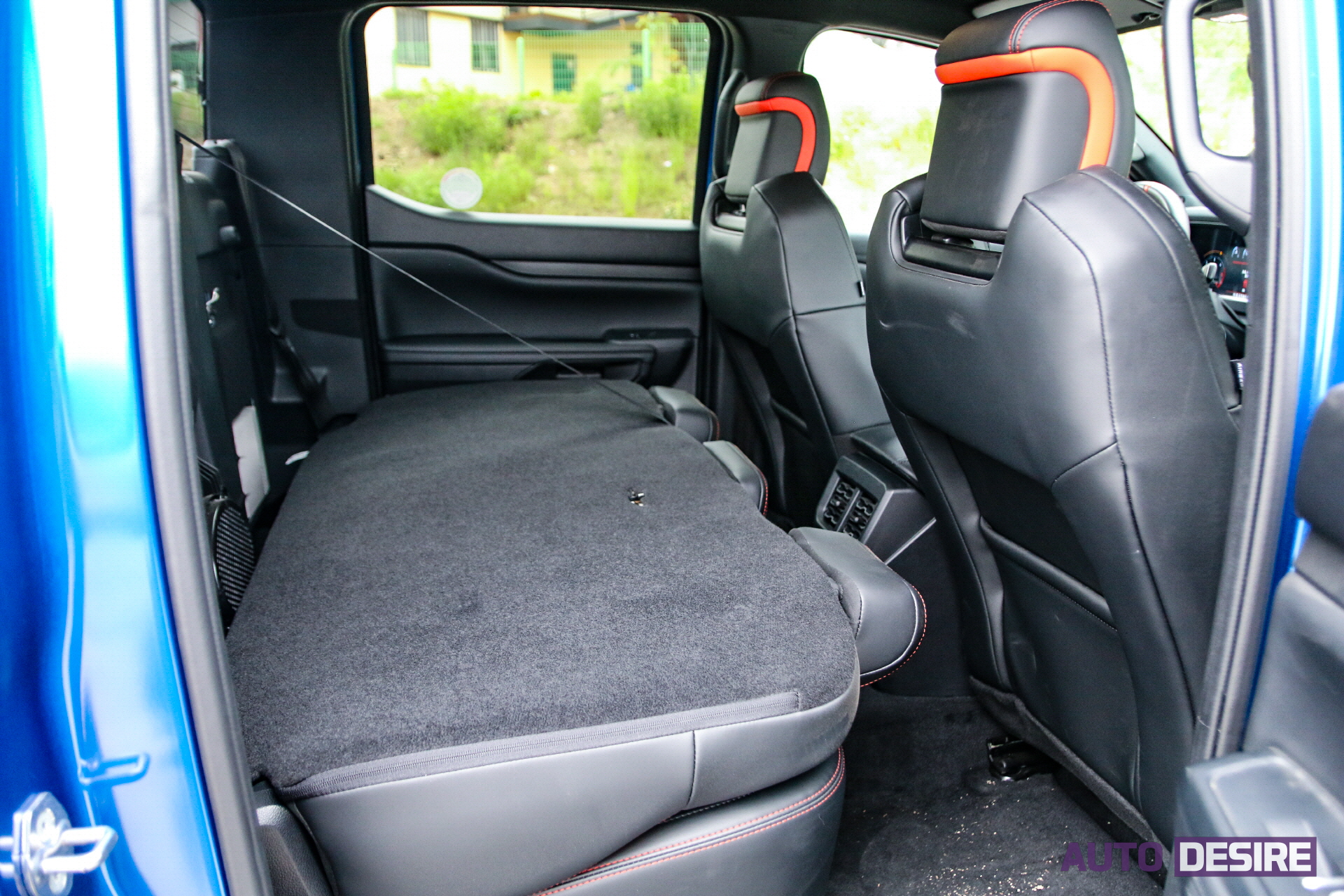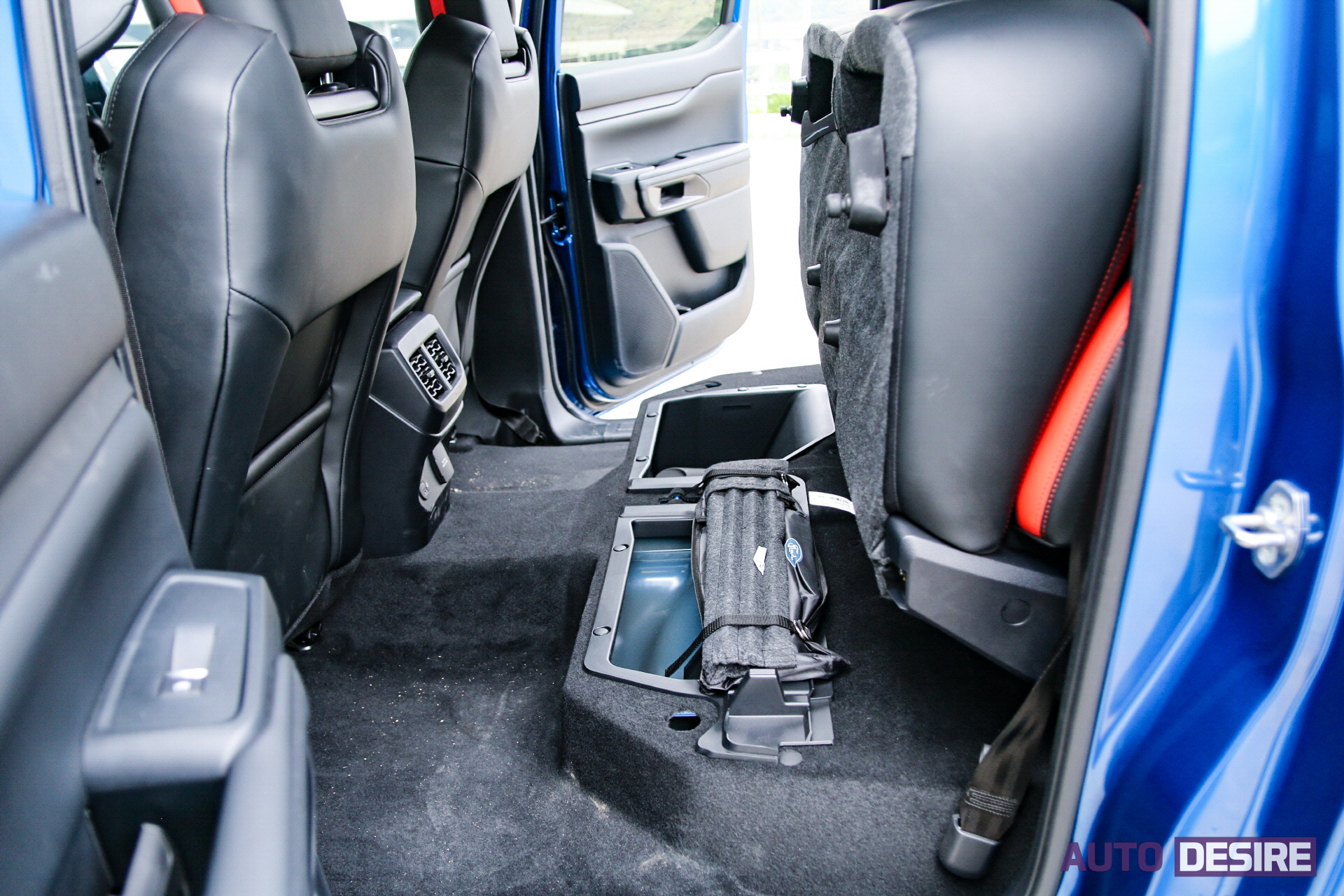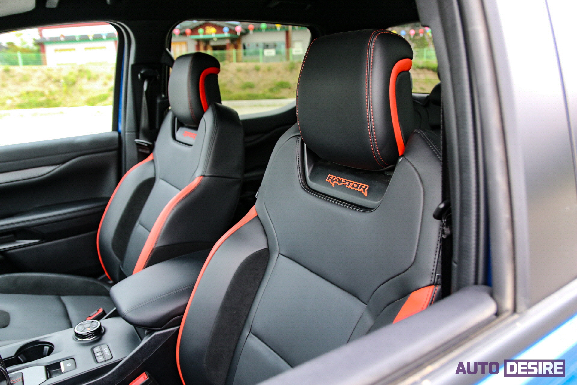 신형 레인저 랩터의 후석에도 약간의 버킷 형태와 레드 포인트 컬러, 스웨이드 재질이 더해진 시트로 와일드트랙과 차이가 있지만 바디는 동일한 만큼 공간 넓이는 동일, 성인이 탑승하기에 불편한 없는 충분한 공간을 제공하며 후석 승객 편의 기능으로 송풍구와 USB 충전 포트, 230V 파워아웃렛이 제공된다.
