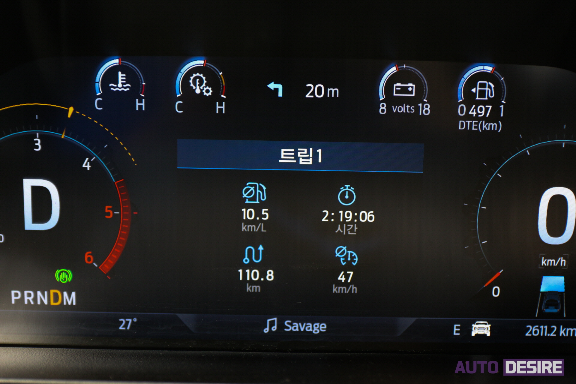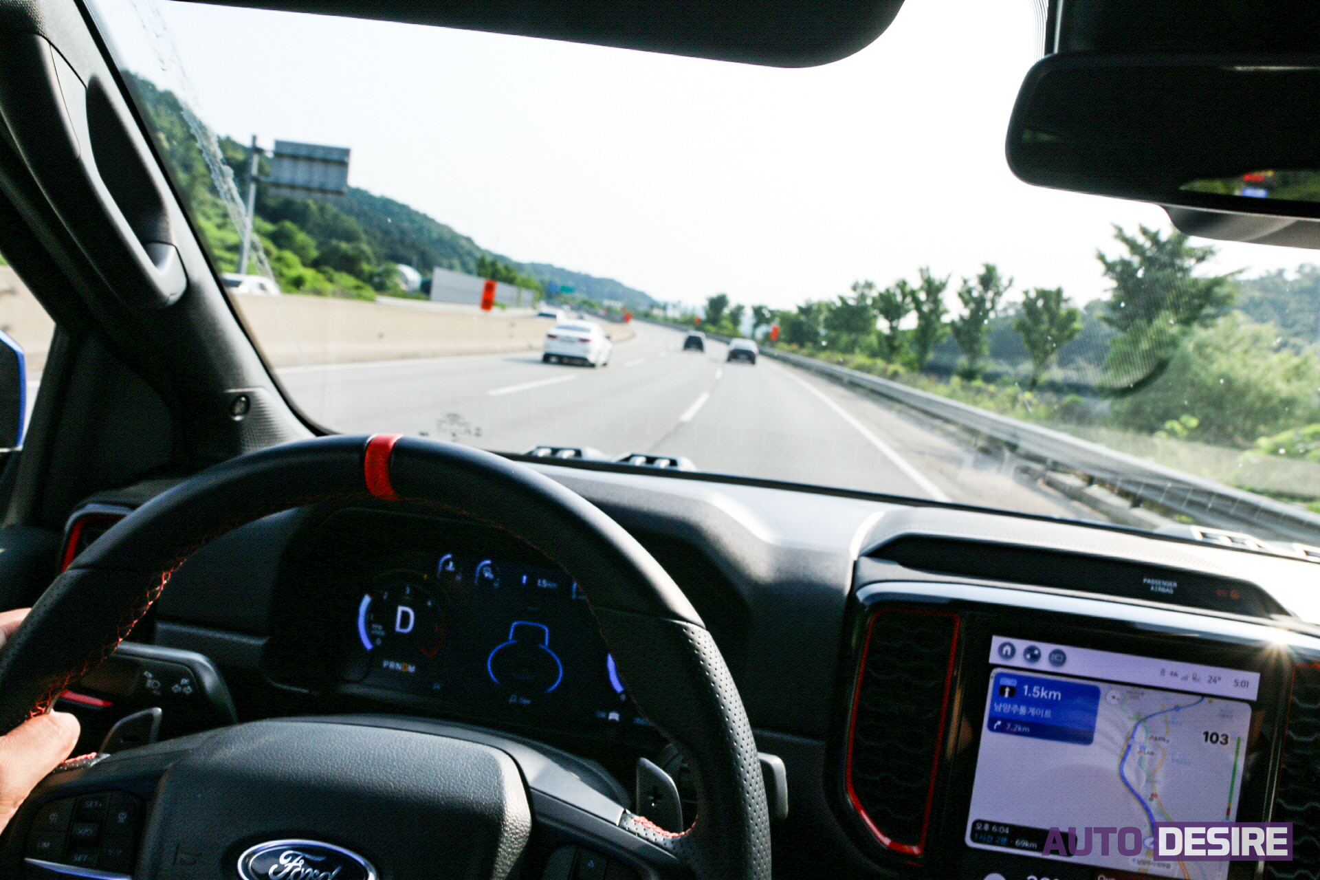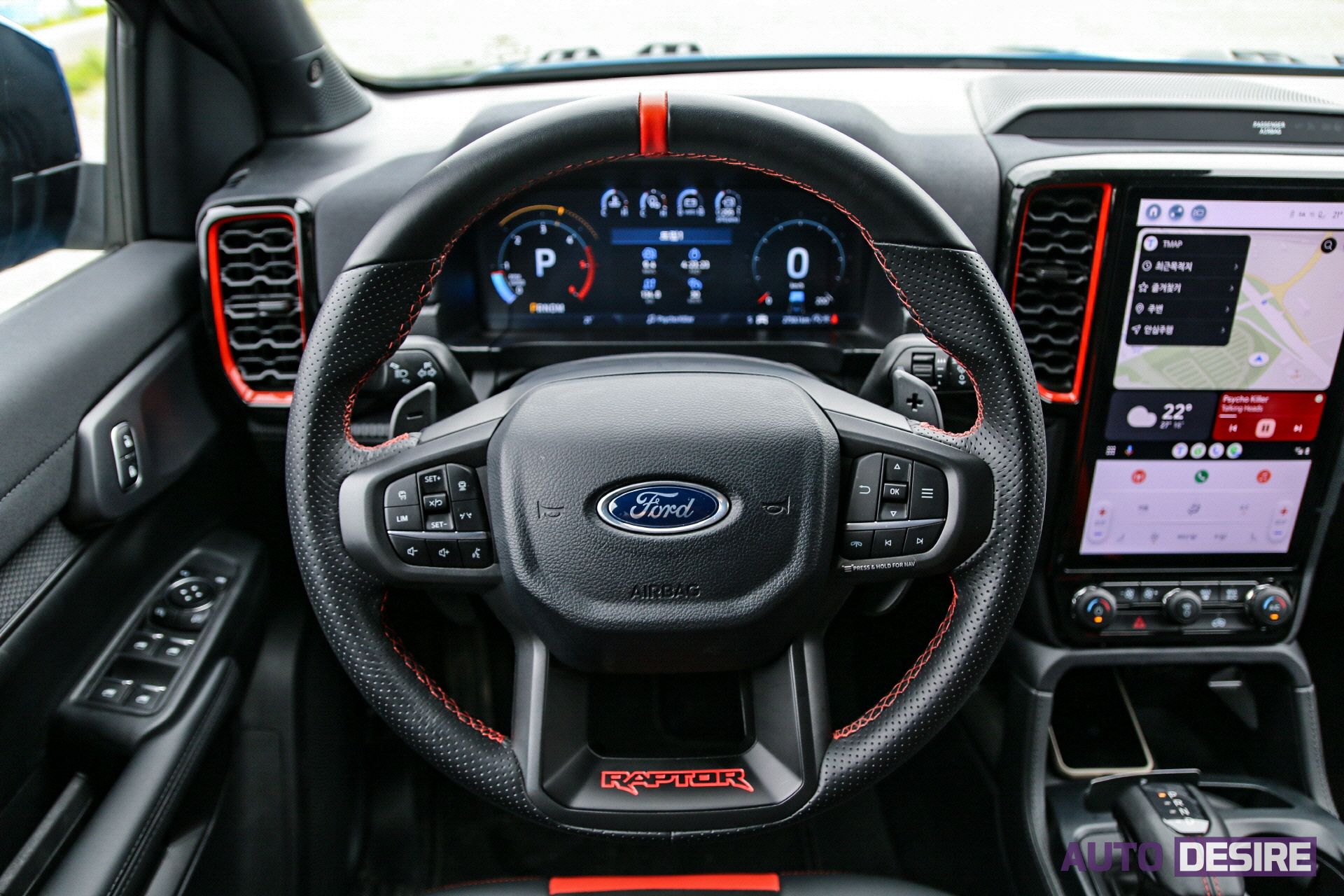 랩터의 10단 자동 변속기도 신형 레인저 와일드트랙과 동일하게 전 세대에 비해 간헐적으로 올라오던 변속 충격이 많이 줄어들어 전반적으로 부드러워졌고, 패들 시프트를 통해 수동 변속을 사용해 보면 아주 빠르지는 않아도 답답하지 않은 정도로 변속 반응이 따라와준다.