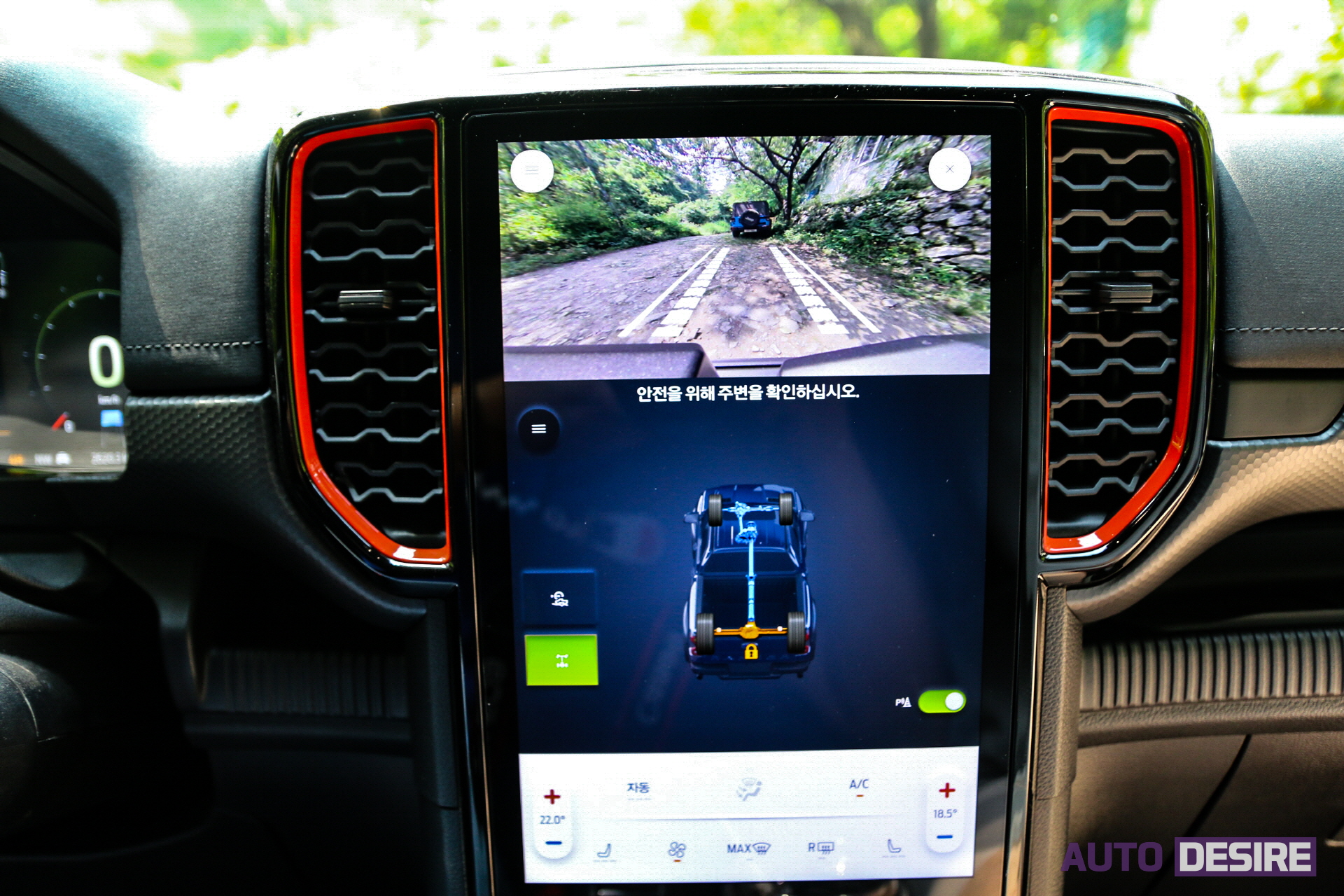 앞서 언급한 것과 같이 사이즈를 더 키운 오프로드용 타이어와 전고를 높인 오프로드 퍼포먼스 스프링과 댐퍼, 접근/이탈각을 높인 전후면 범퍼 디자인과 충격으로부터 하부를 보호해 줄 스키드 플레이트, AWD 모드부터 4륜 고속/4륜 저속/2륜 고속까지 파트타임 설정이 가능한 4륜 구동 시스템과 리어 액슬 락 기능까지 기본 하드웨어적으로도 국내의 어지간한 험로는 무난히 통과할 수 있는 사양을 갖추고 있고,
