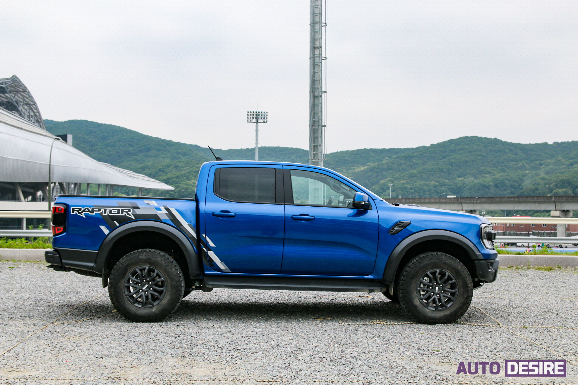 제원 상 차체의 전장, 휠베이스는 와일드트랙과 거의 동일하지만 사이드 미러를 제외하고 차체 폭만 놓고 보면 오버 펜더로 인해 확실하게 더 넓어진 감이 있으며, 이 외에는 측면에 날카로운 형상의 프런트 펜더 데코, 적재함 측면으로 랩터 전용 데칼을 더해 좀 더 액티브한 감각을 높였다.