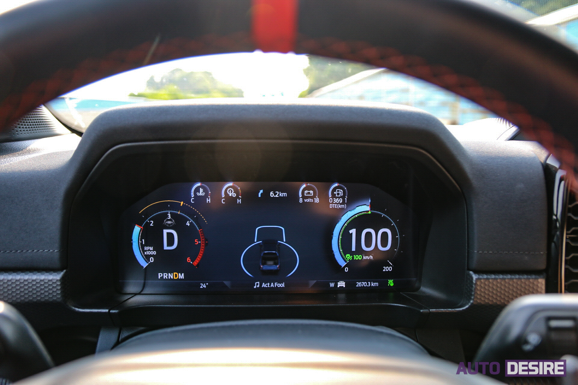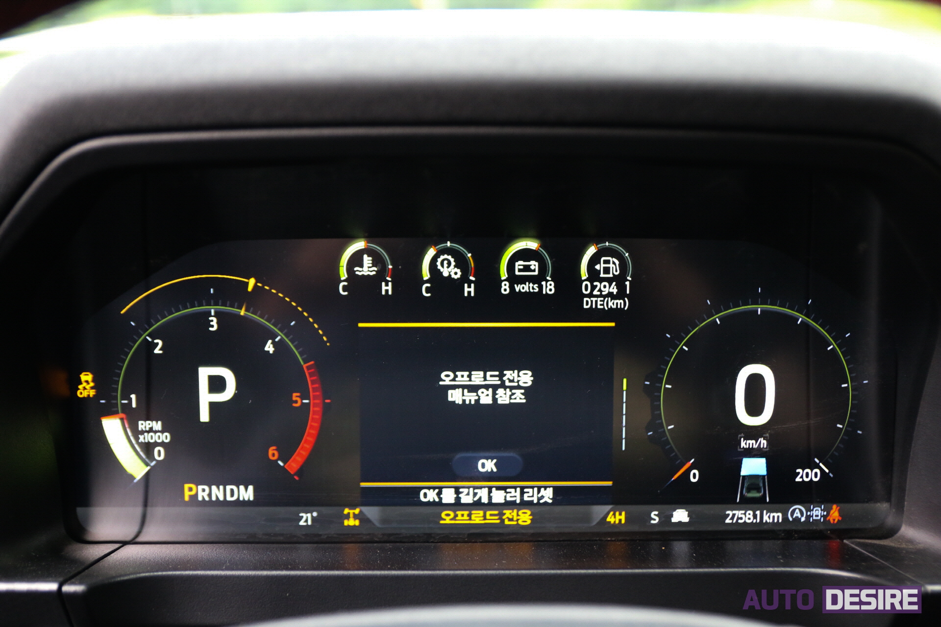 또 와일드트랙은 8인치 디지털 클러스터가 적용되지만, 랩터에는 풀사이즈 12.4인치 디지털 클러스터가 적용, 스포티한 감각의 듀얼 서클 그래픽과 수온, 유온, 배터리 전압, 연료게이지가 중앙 상단에 서클 타입으로 적용되며 센터의 트립컴퓨터 및 정보창을 통해 추가적인 오프로드 주행 정보 및 다른 기능들을 체크할 수 있다. 또 주행 모드에 따라서 컬러와 구성에도 일부 변화가 적용된다.