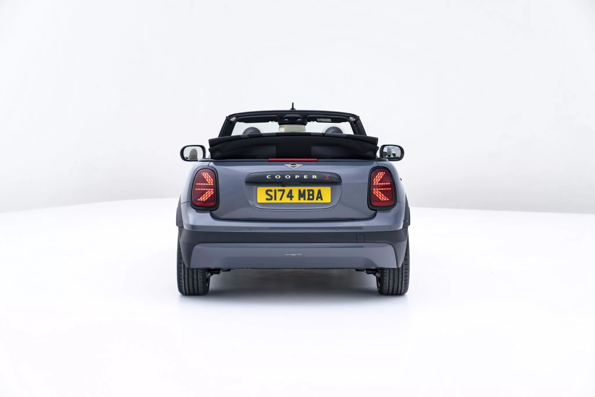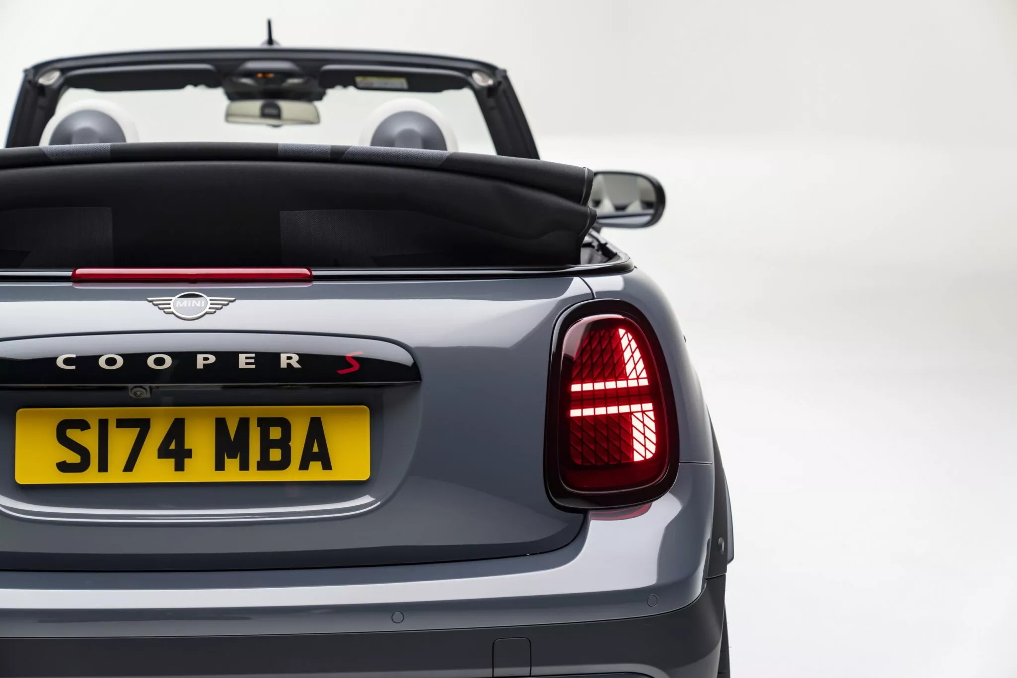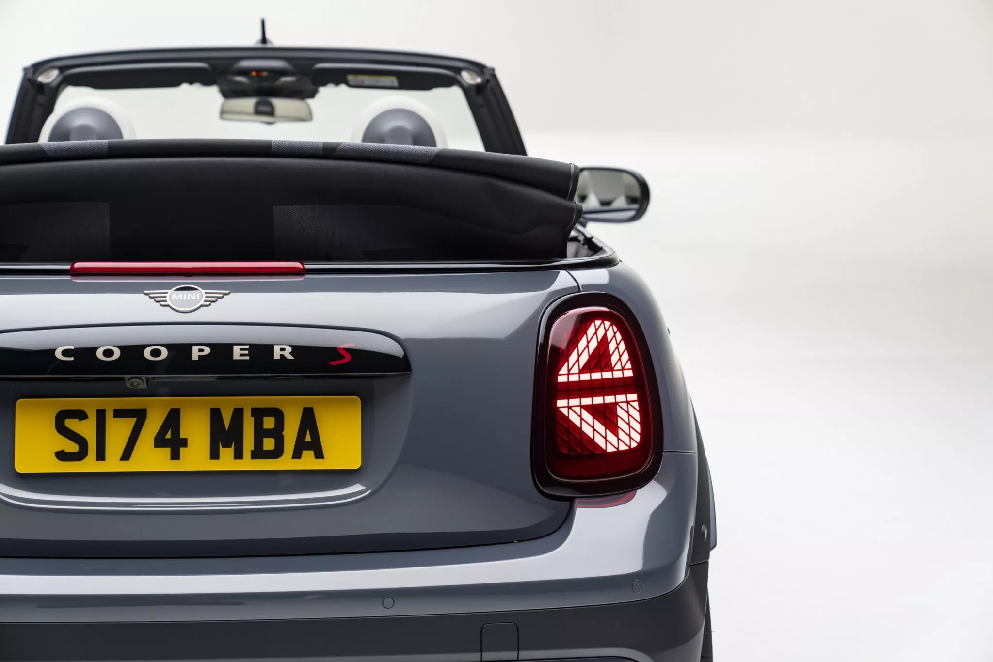 다만 후면에서는 신형 미니 해치백과 다르게 기존 3세대 미니 컨버터블의 금형을 이어 받아 부채꼴의 날렵한 형태의 리어 램프가 아닌 3세대 미니 컨버터블과 동일한 외곽 라인의 리어 램프를 적용하되, 새로운 디지털 패턴이 적용되었고, 앞 범퍼와 마찬가지로 뒤 범퍼도 미니멀하게 노출된 머플러 팁을 삭제하고 깔끔하게 바디 컬러 플레이트만 적용했다. 소프트탑 상부에는 유니언잭 디자인을 적용했다.