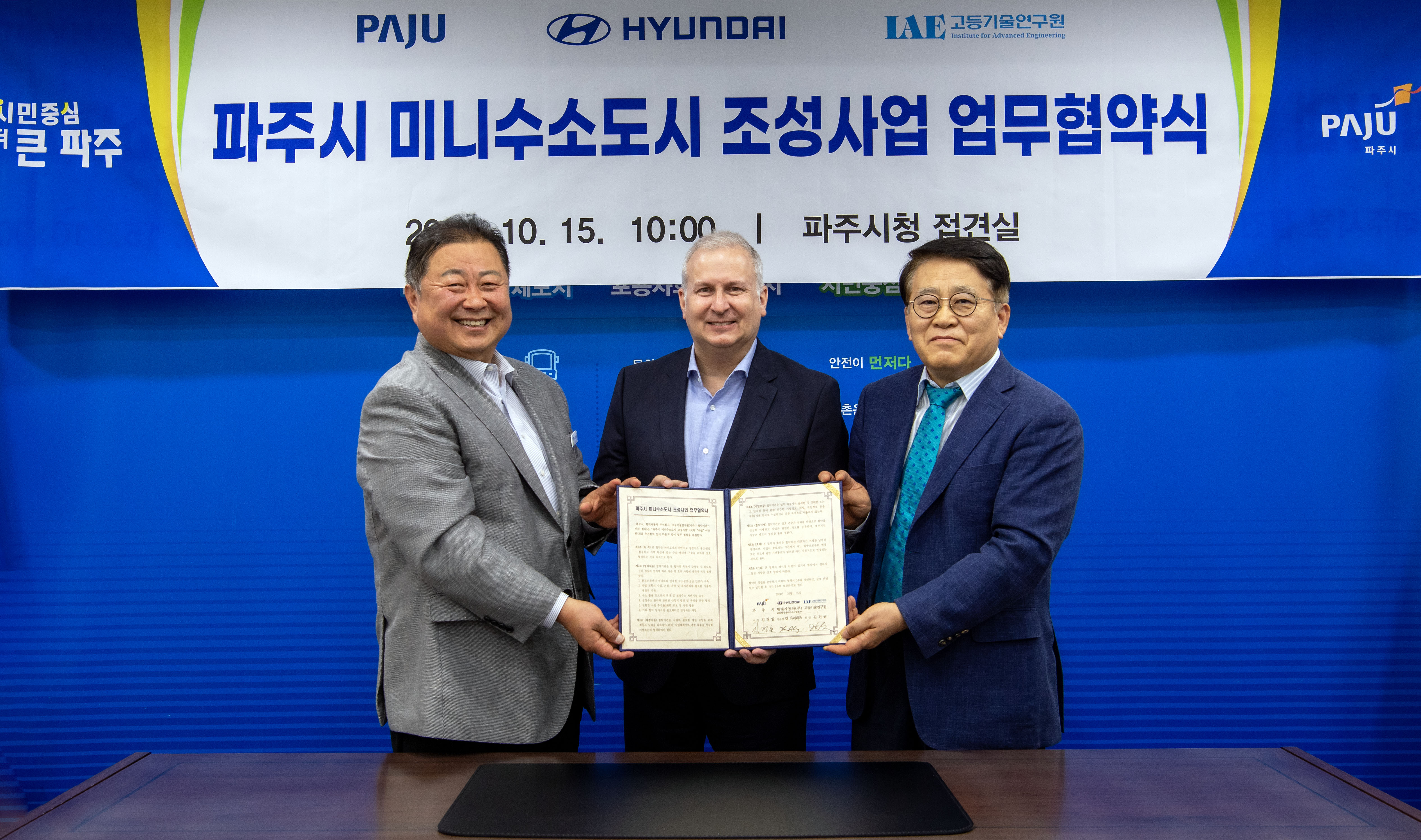 10월 15일, 현대자동차가 경기도 파주시청에서 켄 라미레즈 현대자동차 글로벌상용&수소사업본부장, 김경일 파주시장, 김진균 고등기술연구원장 등 주요 관계자들이 참석한 가운데 파주시, 고등기술연구원과 '경기도 미니 수소도시 조성사업을 위한 업무협약'을 체결했다.