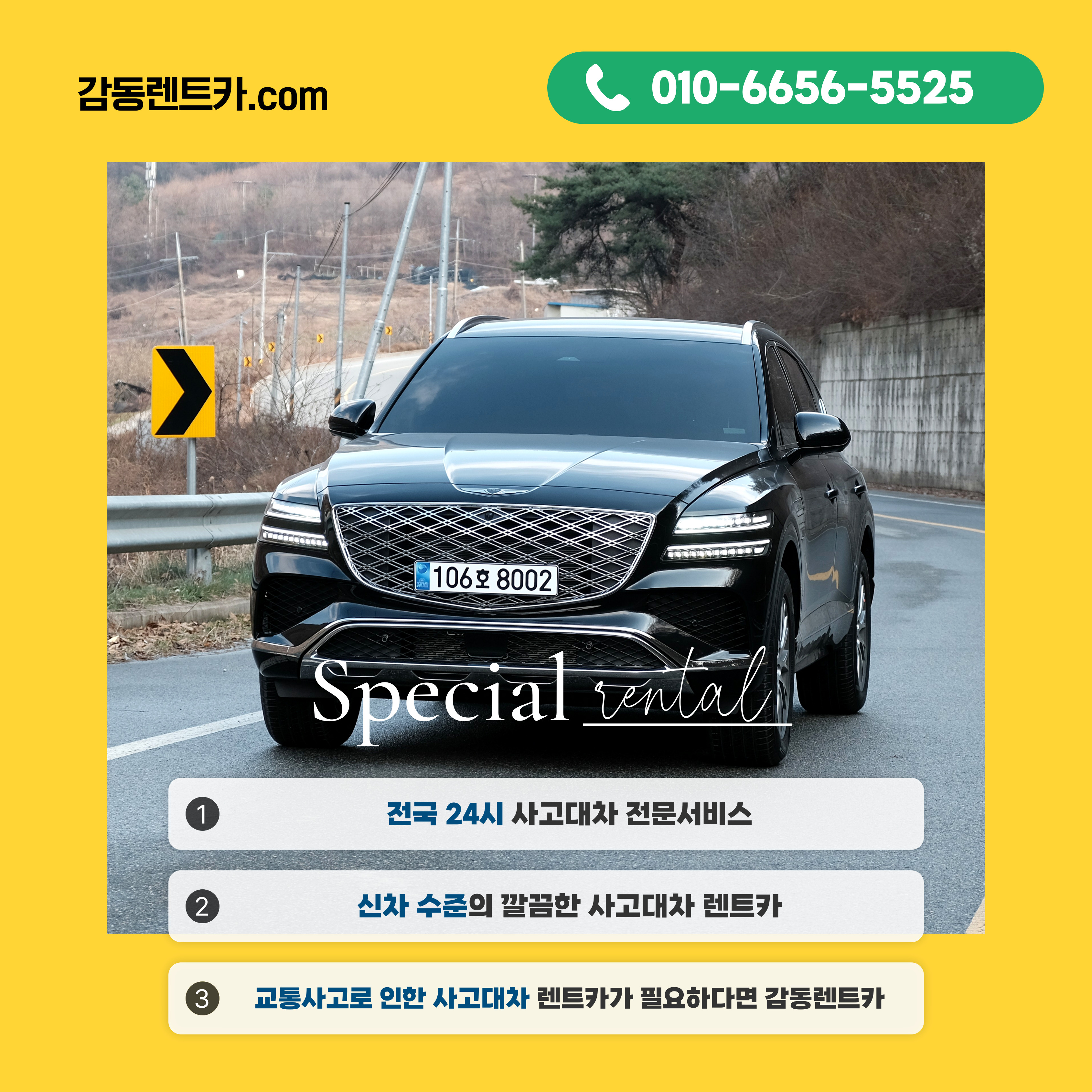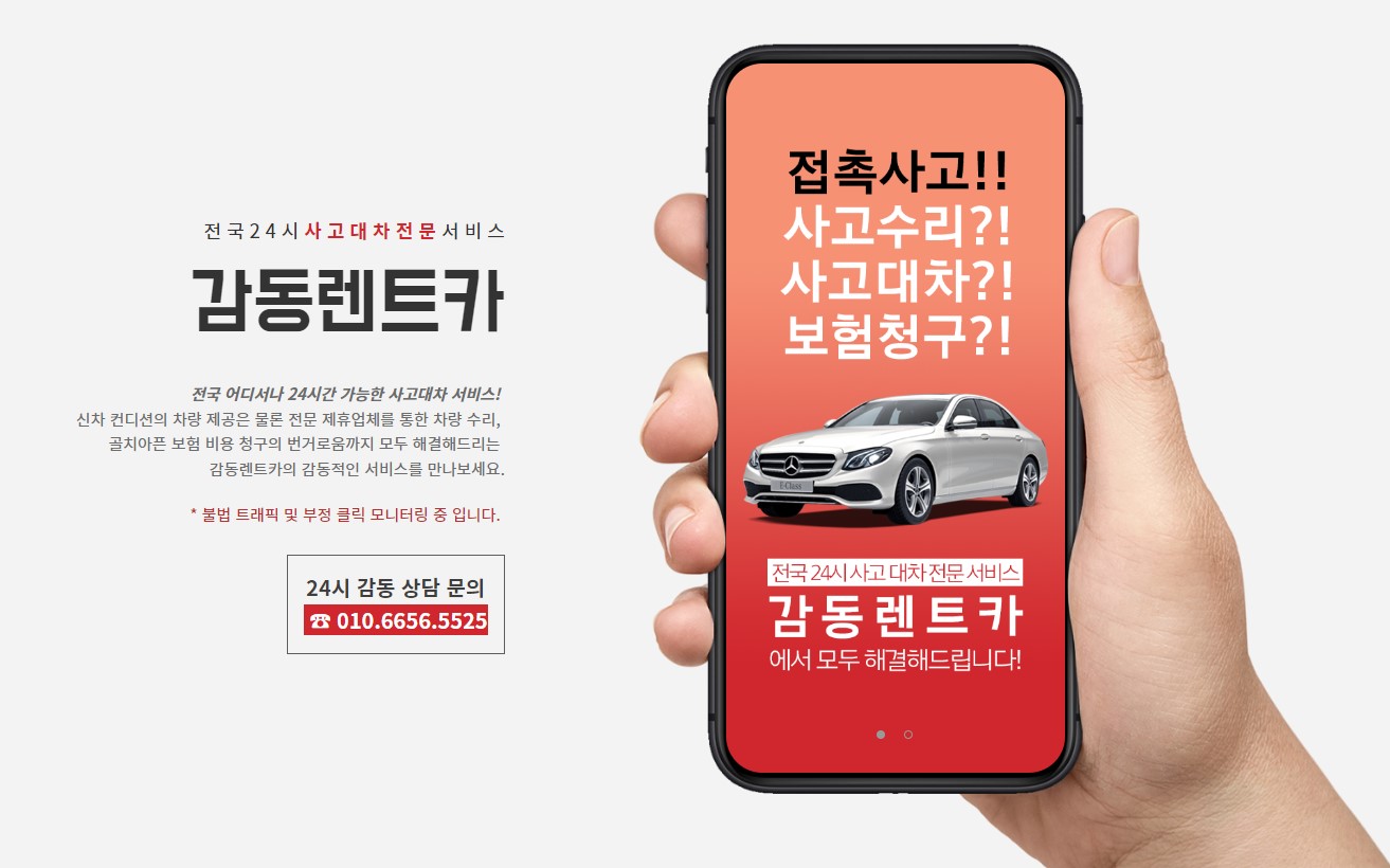 언제 어디서 갑작스럽게 찾아올지 모르는 교통사고. 갑작스러운 사고에 차량이 파손되었다면 어떻게 처리해야 할지 당황하지 말고 24시간 전국 어디라도 바로 이용 가능한 세종 사고대차 렌트카 전문 '감동렌트카'와 상담을 통해 사고 수리 입출고 대행과 사고대차 렌트카 이용, 사고처리 모든 과정 편하게 이용하기 바란다.