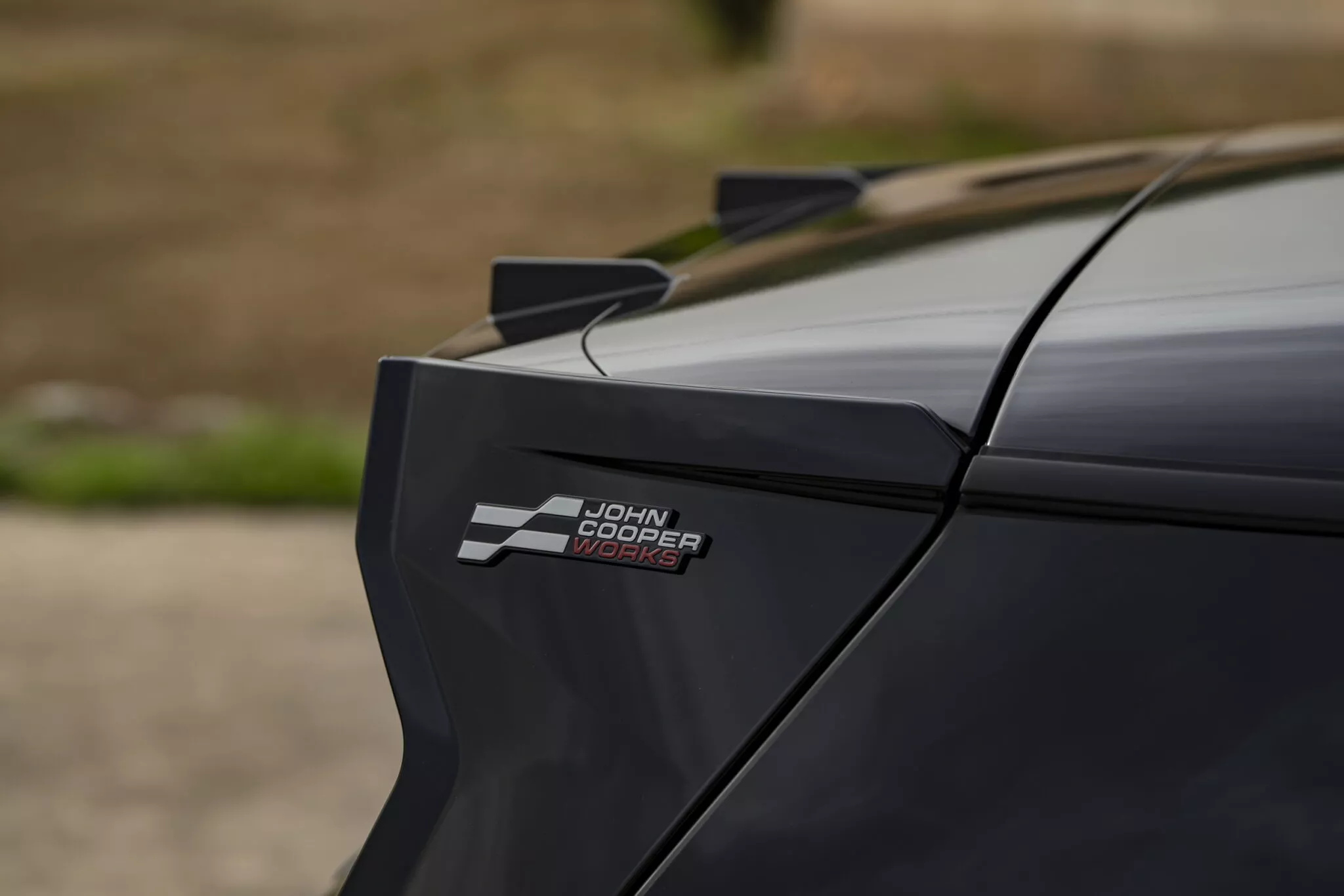 후면에서는 전기차이기 때문에 테일 파이프는 없지만 넓은 면적의 리어 디퓨저와 함께 루프와 측면 글라스까지 이어지는 리어 스포일러를 적용해 공기 역학적 성능을 최대한 끌어올리고자 한 모습이며, 스포일러 측면에 JCW 전용 엠블럼을, 테일게이트에는 센터 가니시에 JCW 프린트와 함께 하부 패널에는 체크플래그 패턴을 적용해 스포티한 스타일을 최대한 반영한 모습이다.