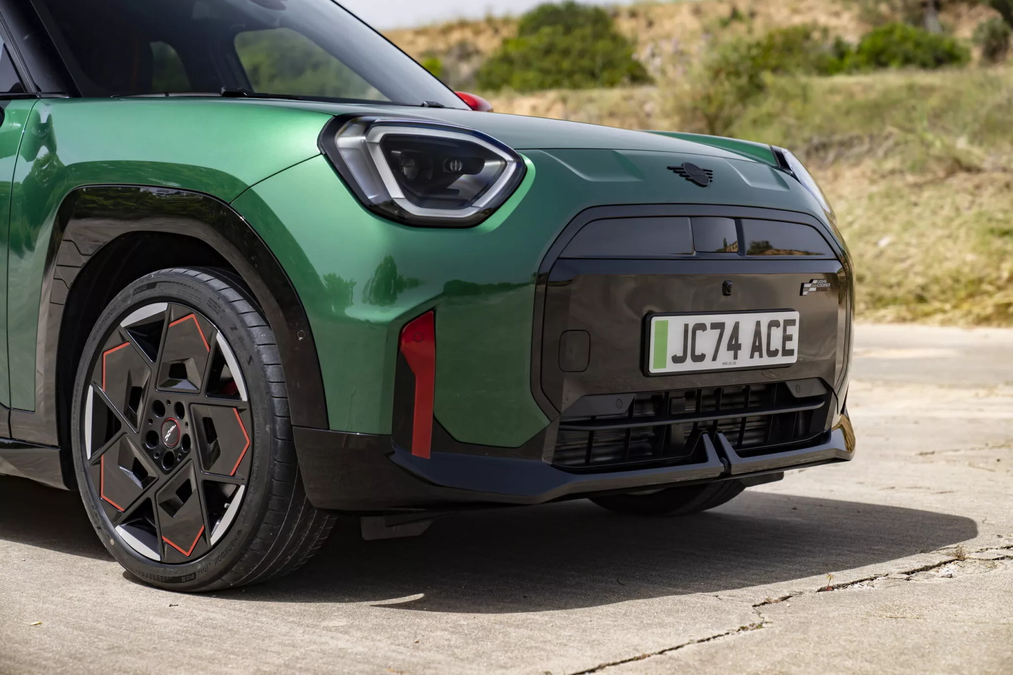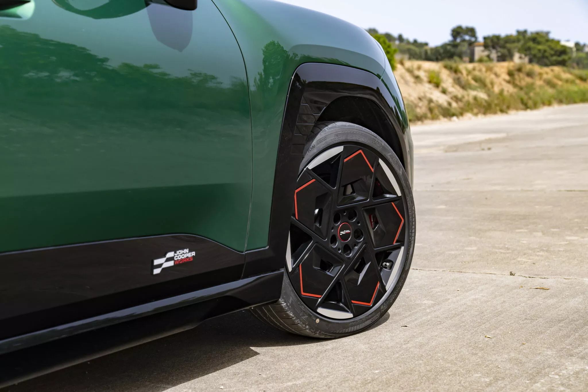 바디 하부 클래딩을 블랙 하이글로시 소재로 감싸고 1열 도어 측면에 JCW 로고를 추가, 19인치 사이즈로 스포크에는 블랙 컬러와 빨간 화살표 패턴을, 림은 실버 컬러로 마감한 JCW 에이스맨 전용 휠이 장착된다.