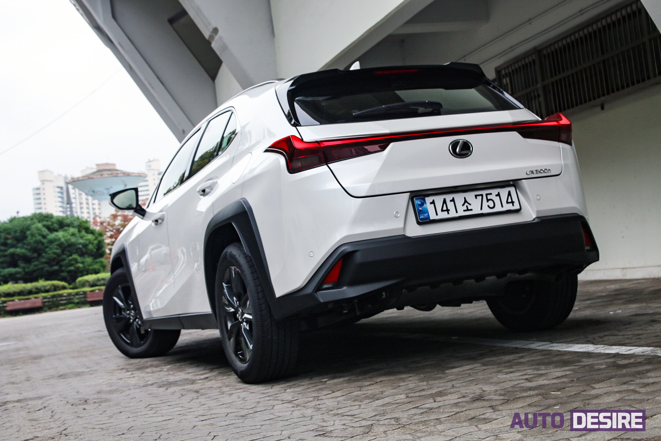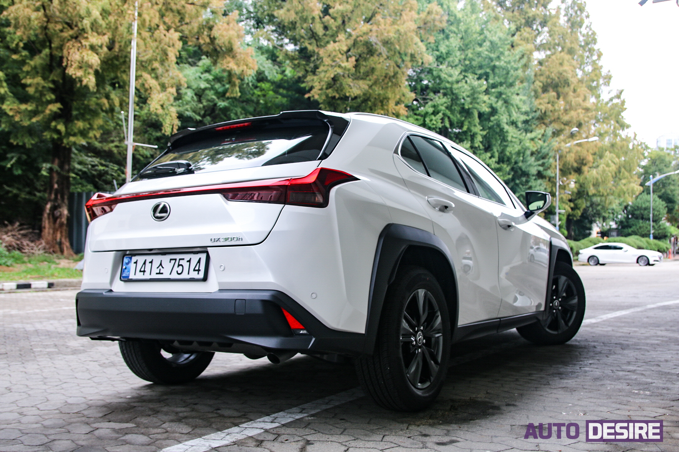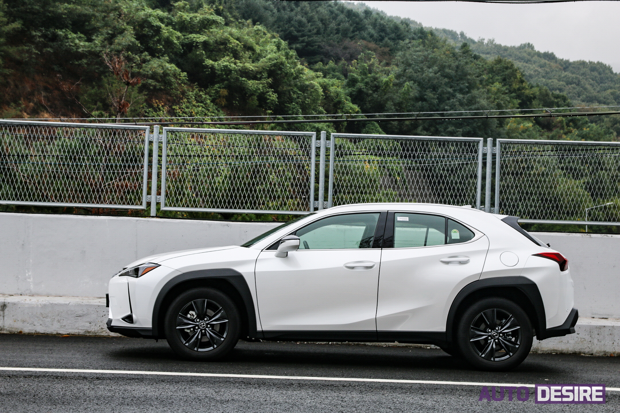 측면에서도 볼드하게 들어간 사이드 캐릭터 라인과 볼륨감 있는 펜더로 컴팩트 SUV에 잘 어울리는 다이내믹한 인상을 주고 UX 300h F 스포츠 모델에는 바디 컬러 클래딩으로 세련미를, 2WD 모델에는 무광 클래딩을 적용해 액티브한 인상을 준다. 또 2WD 모델에는 17인치 다크 알루미늄 휠을 적용해 클래딩 부분과 자연스럽게 이어지면서 안정적인 자세감을 만든다. 타이어는 기본적으로 사계절 타이어로 장착, 출고되어 서머 타이어와 다르게 겨울철에 별도로 타이어를 교체할 불편함이 없다.